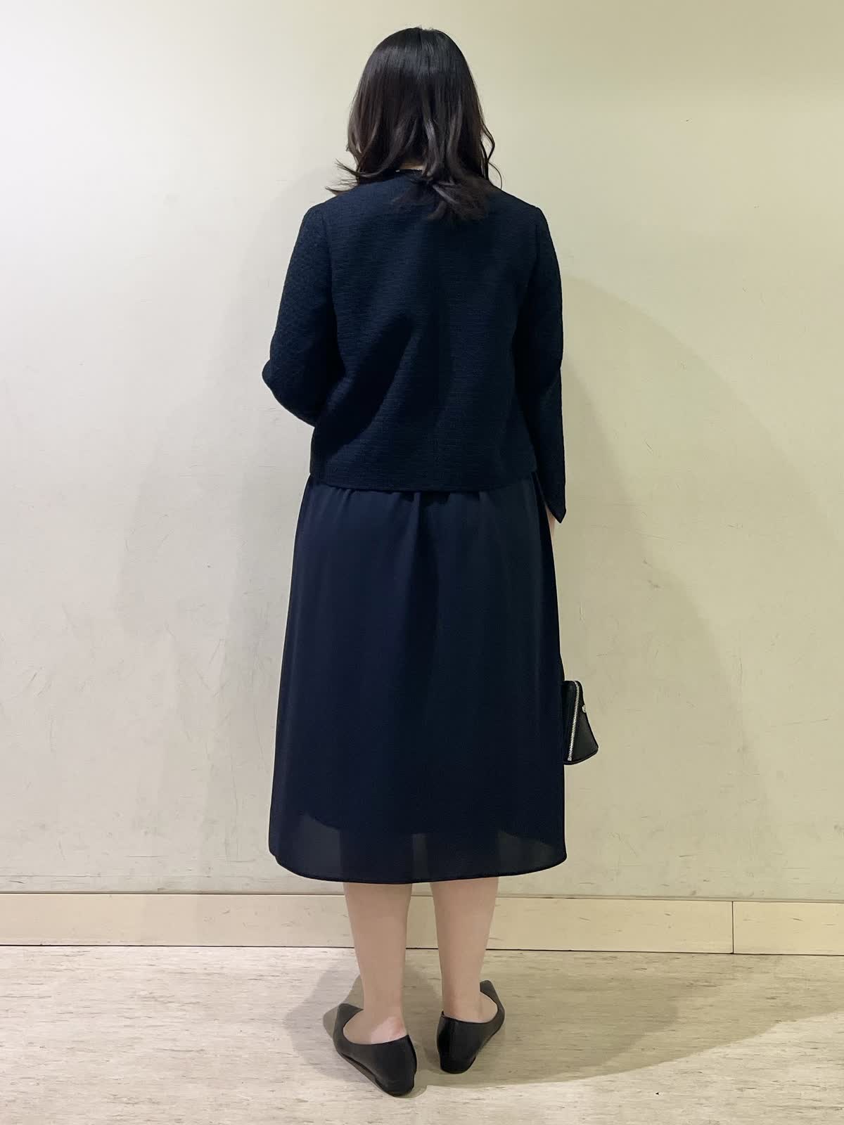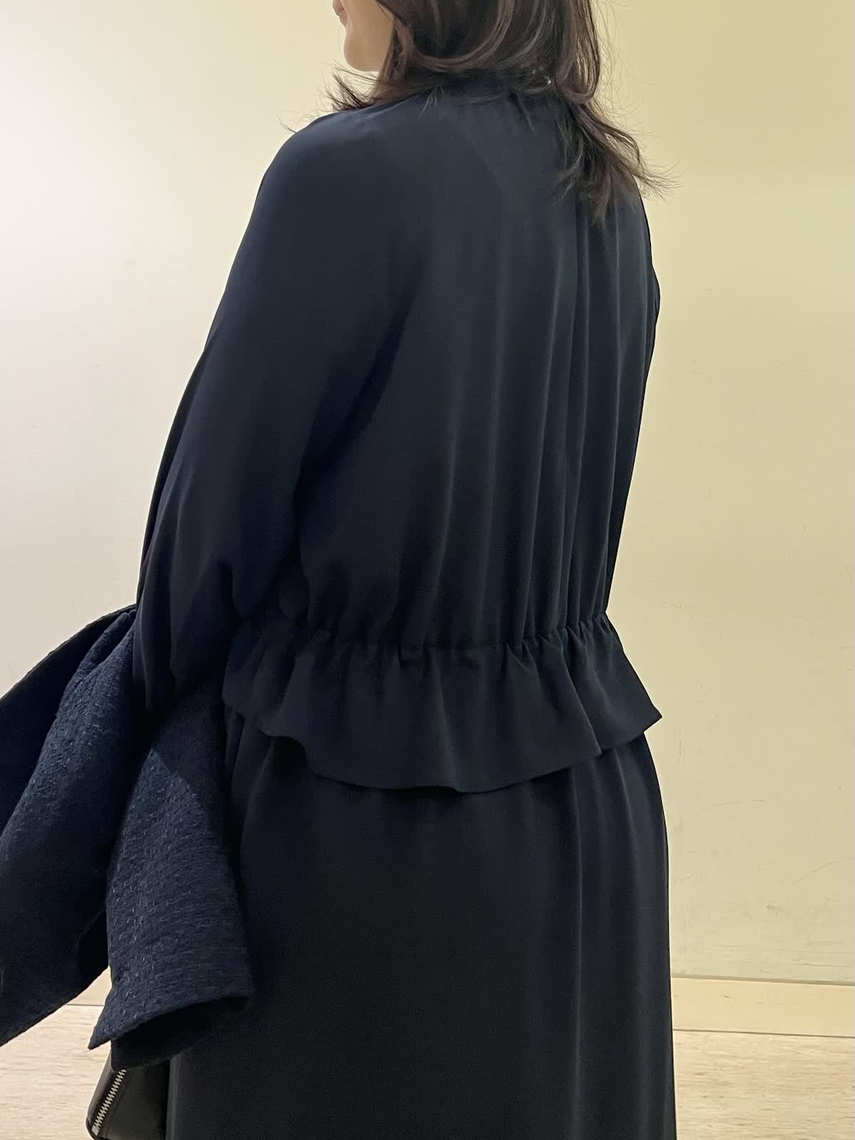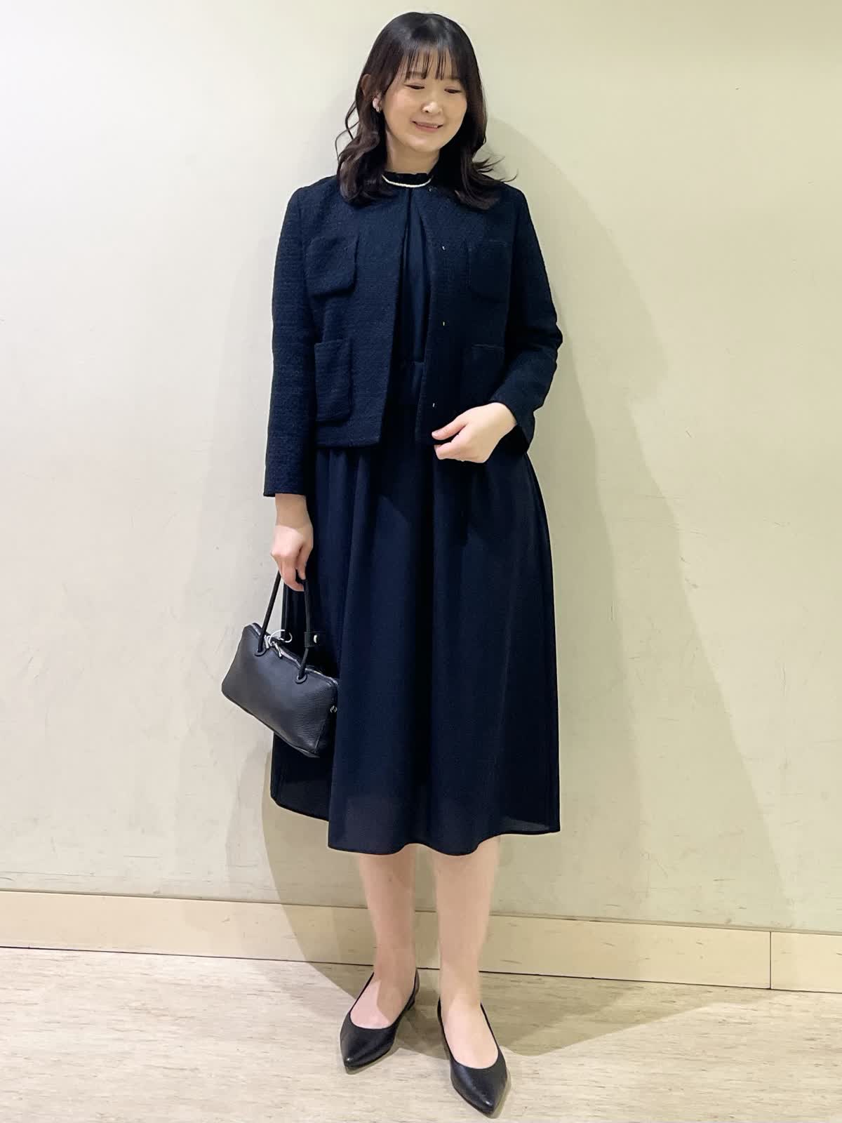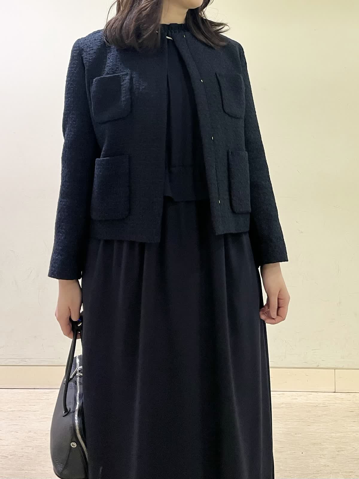 【着用カラー/サイズ】ジャケット:ネイビー/11号 ワンピース:ネイビー/11号 ハレの日の入学卒業式スタイル。ジャケットか×ワンピースのネイビー定番スタイルです。スッキリとした洗練されたジャケットは、ハレの日に相応しいエレガントなデザインです。異素材のワンピースは、さらっと薄手で広がらず、落ち感のある素材です。首元とウエストのさりげないフリルが華やかさをプラスしてくれます。