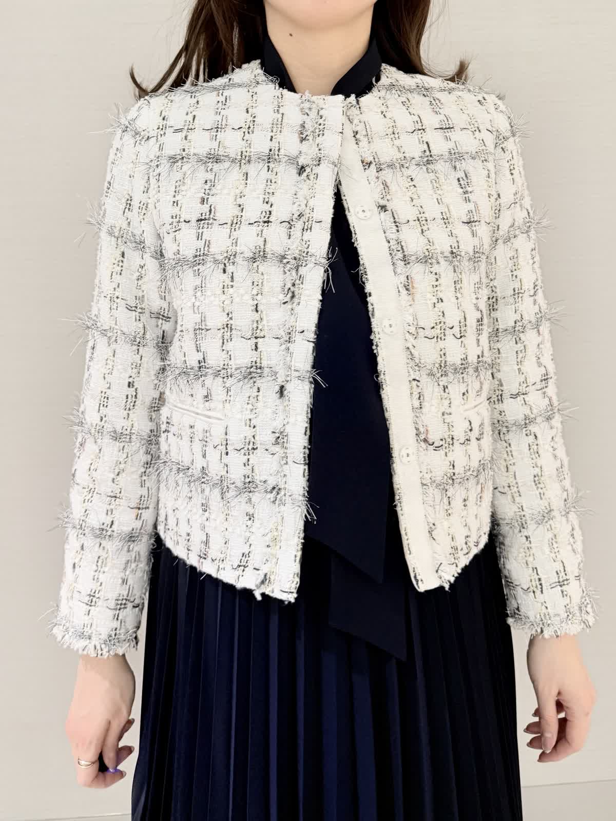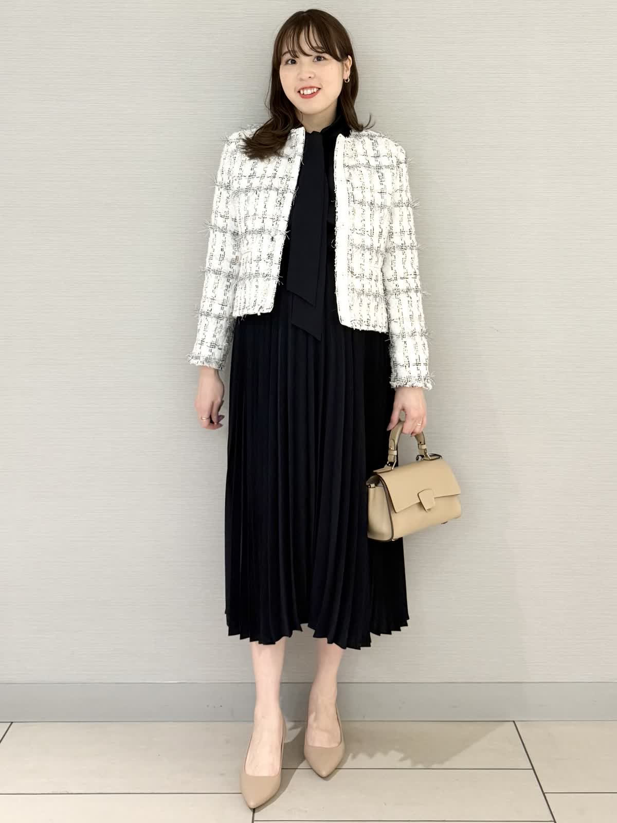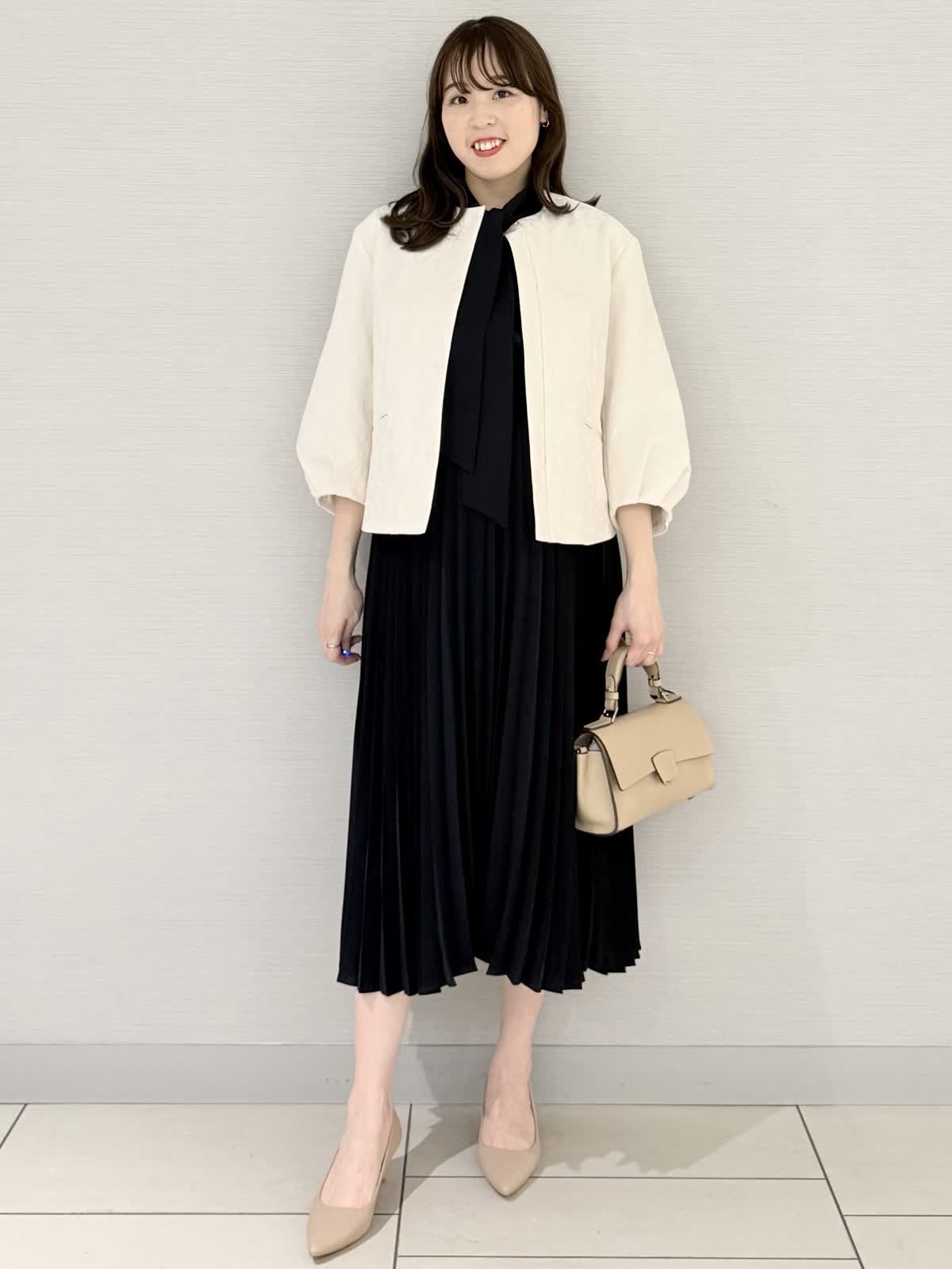 ジャケット:9号/アイボリーワンピース:9号/ネイビー《ハレの日にオススメのスタイリング。ジャケットは白すぎないアイボリーなのでネイビーと相性◎小物は色を揃えました》