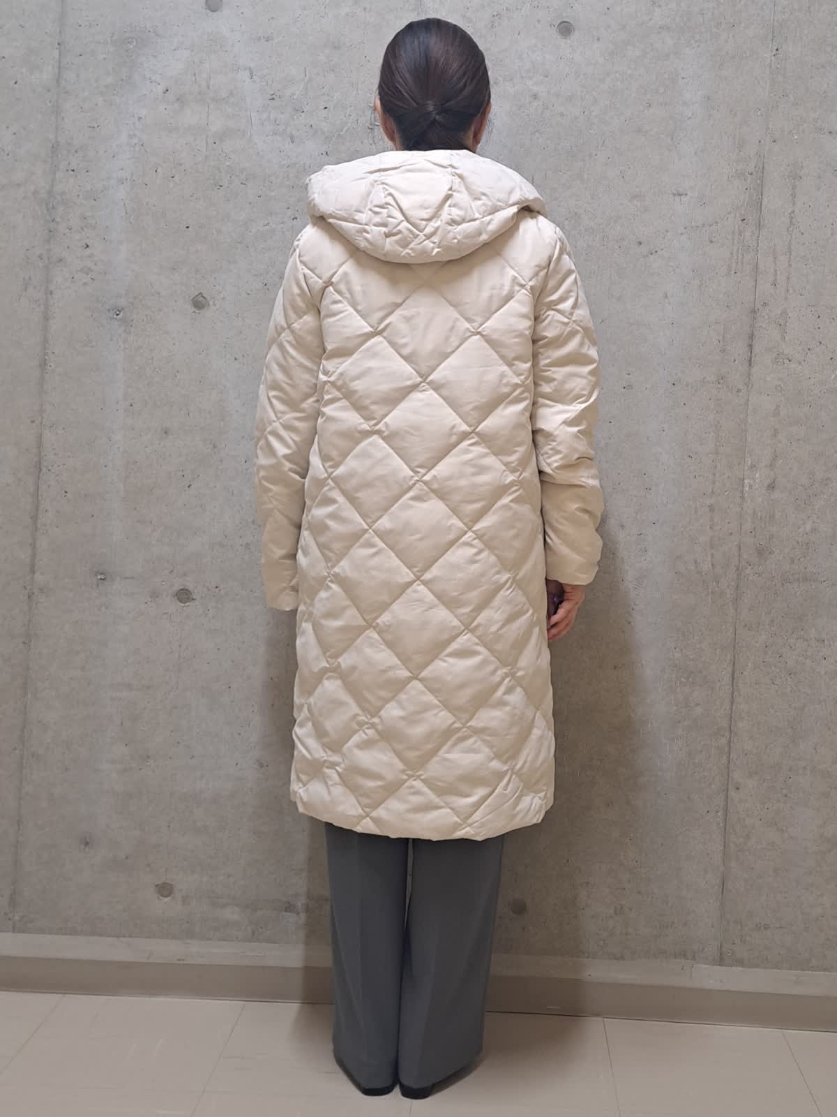 【着用サイズ】アウター:9号 ニット:フリー パンツ:9号 【着用カラー】アウター:グレーベージュ ニット:サックス パンツ:グレー お出掛けコーディネート 着膨れせずに着れるタイオンコラボロングダウン。薄手ですが、ダウン95%入りで軽くて暖かく着用できます。インナーは春まで長く着れるカラーニット。ボトムはストーリーコラボパンツ。センタープレス入りでスタイルアップして見えるデザインです。