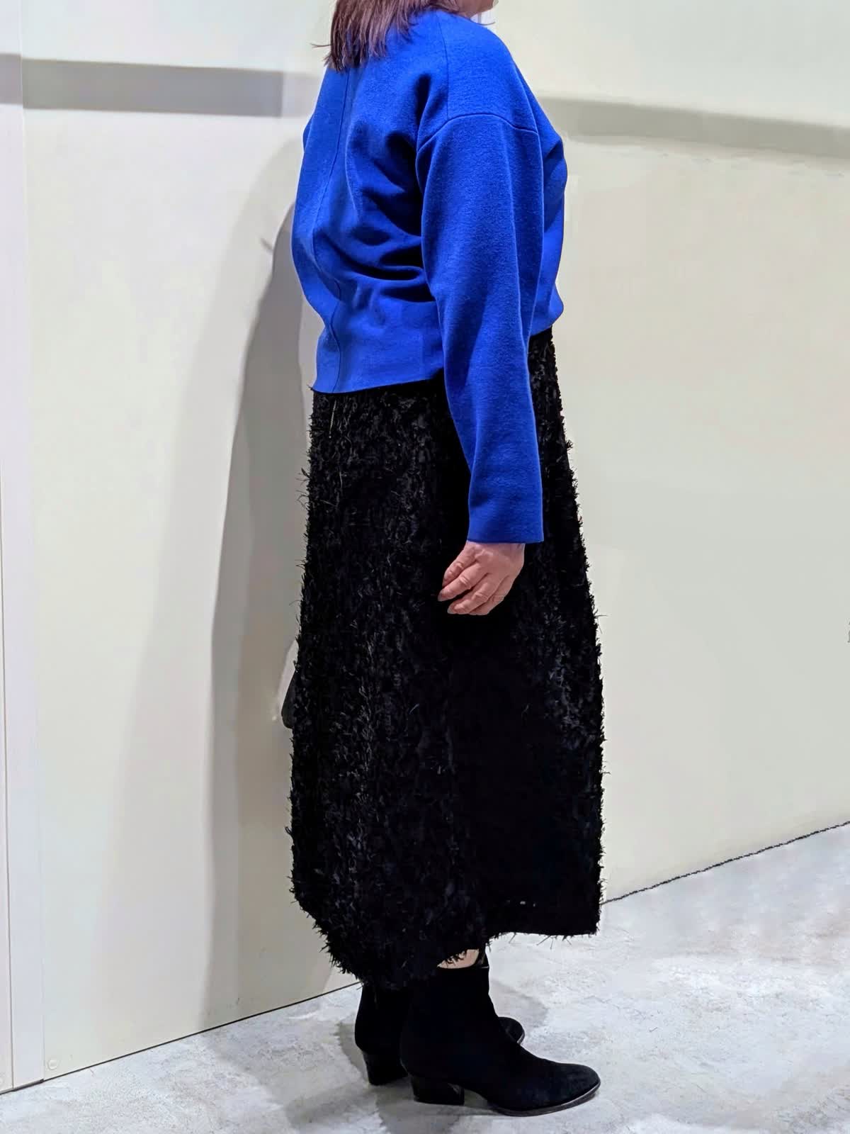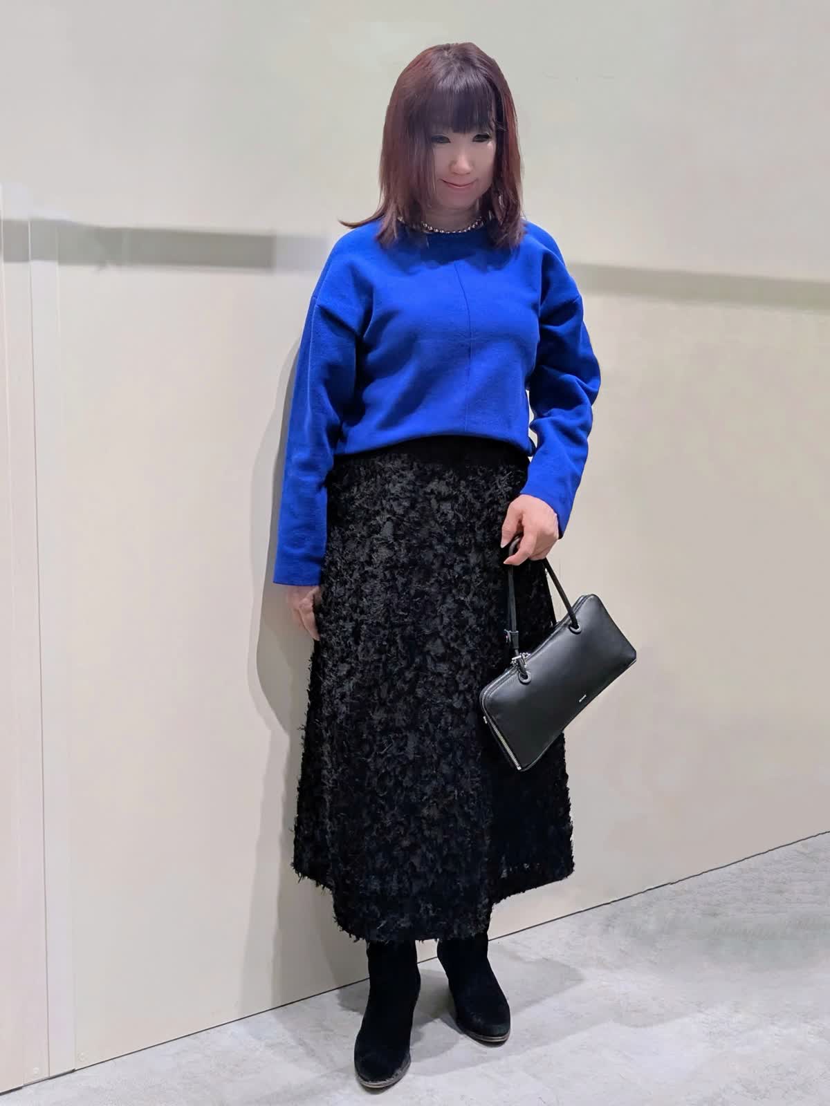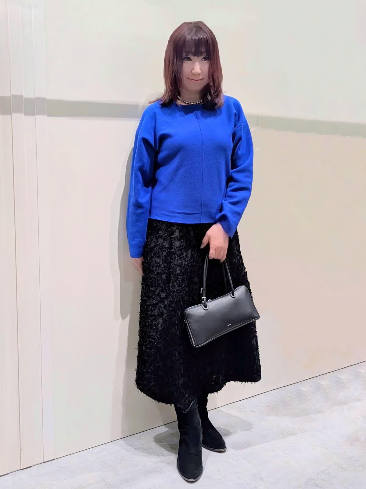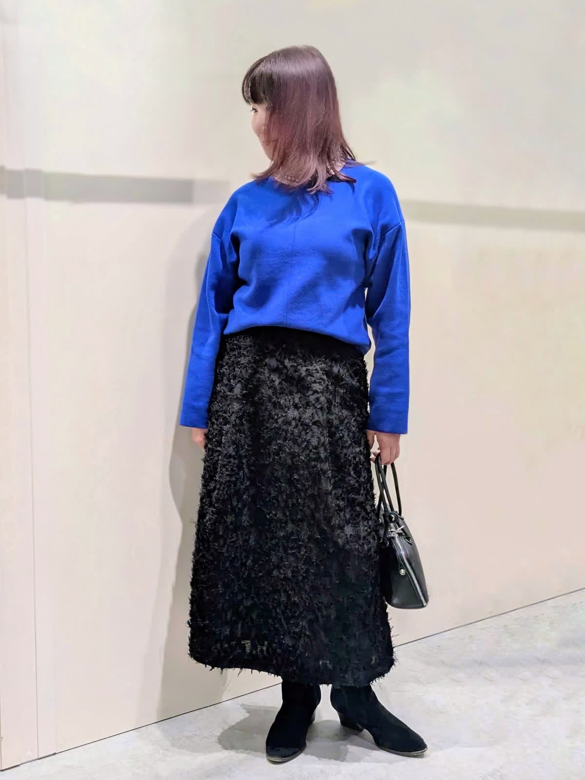 【着用サイズ】プルオーバー:フリー コート、スカート:9号【着用カラー】コート、スカート:ブラック プルオーバー:ブルー ブルーコーディネート 軽くて、保温性・撥水防水効果もある暖かダウンコートは、上品なマット生地でピーコート風のデザインがポイントです。ゆとりのあるサイズ感と程良い丈感で気軽に羽織れてボトムを選びません。鮮やかなブルーのプルオーバーは、緩すぎない程良いサイズ感ながら身体のラインを拾わず、スッキリ見せてくれます。コートインナーの差し色にもなる綺麗なお色目です。フリンジ仕様のカットジャガードのスカートは、ややストレートなフレアシルエットで、上品な印象です。ウエスト後ろゴム仕様で、快適なはき心地でサテンテープのファスナーの引手がアクセントに…存在感のあるスタイリングのアクセントになる1枚です。