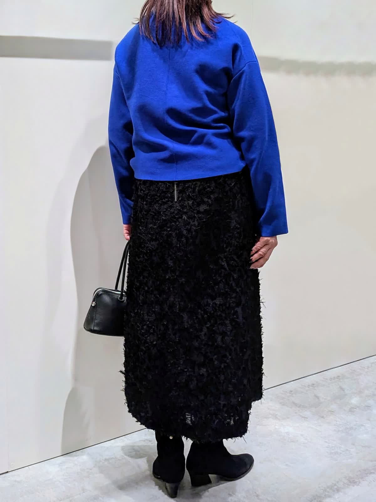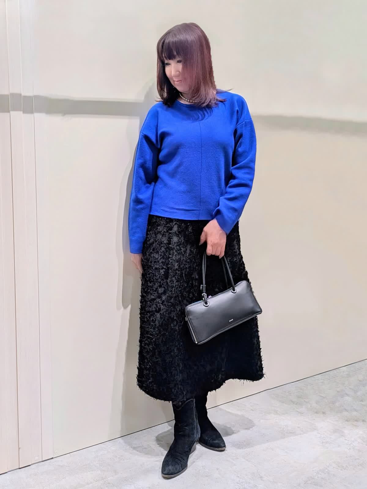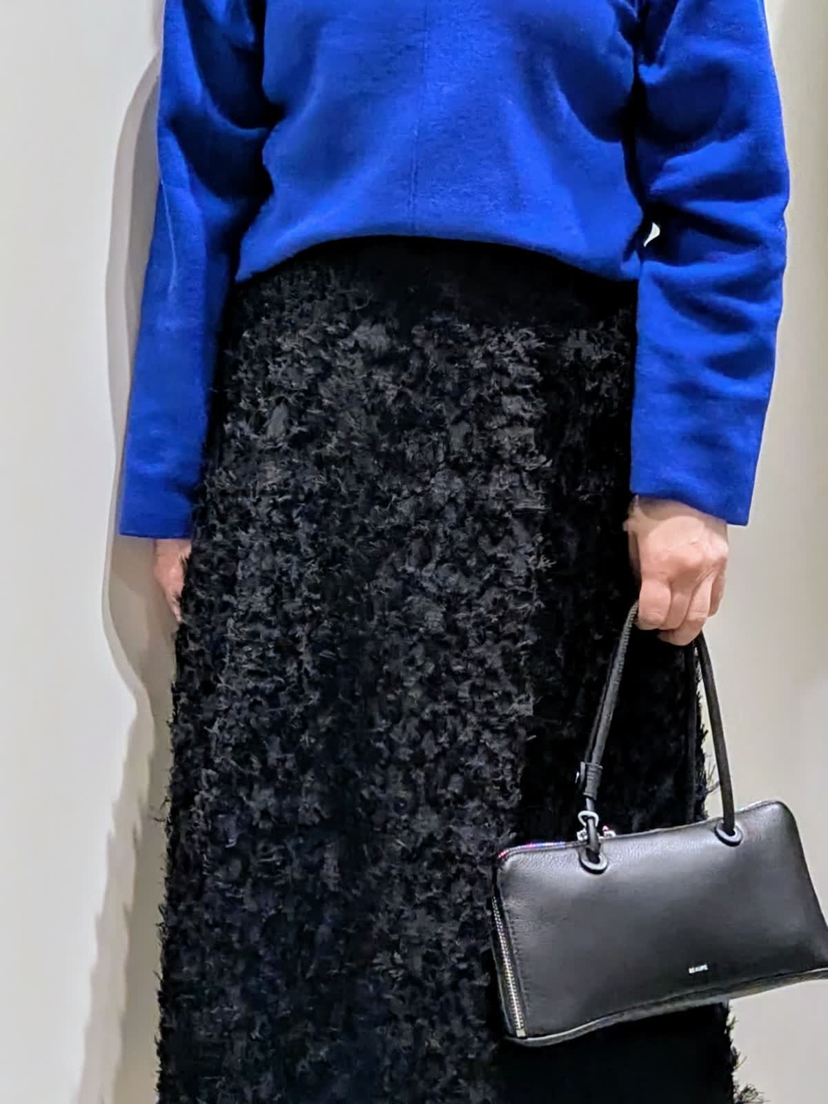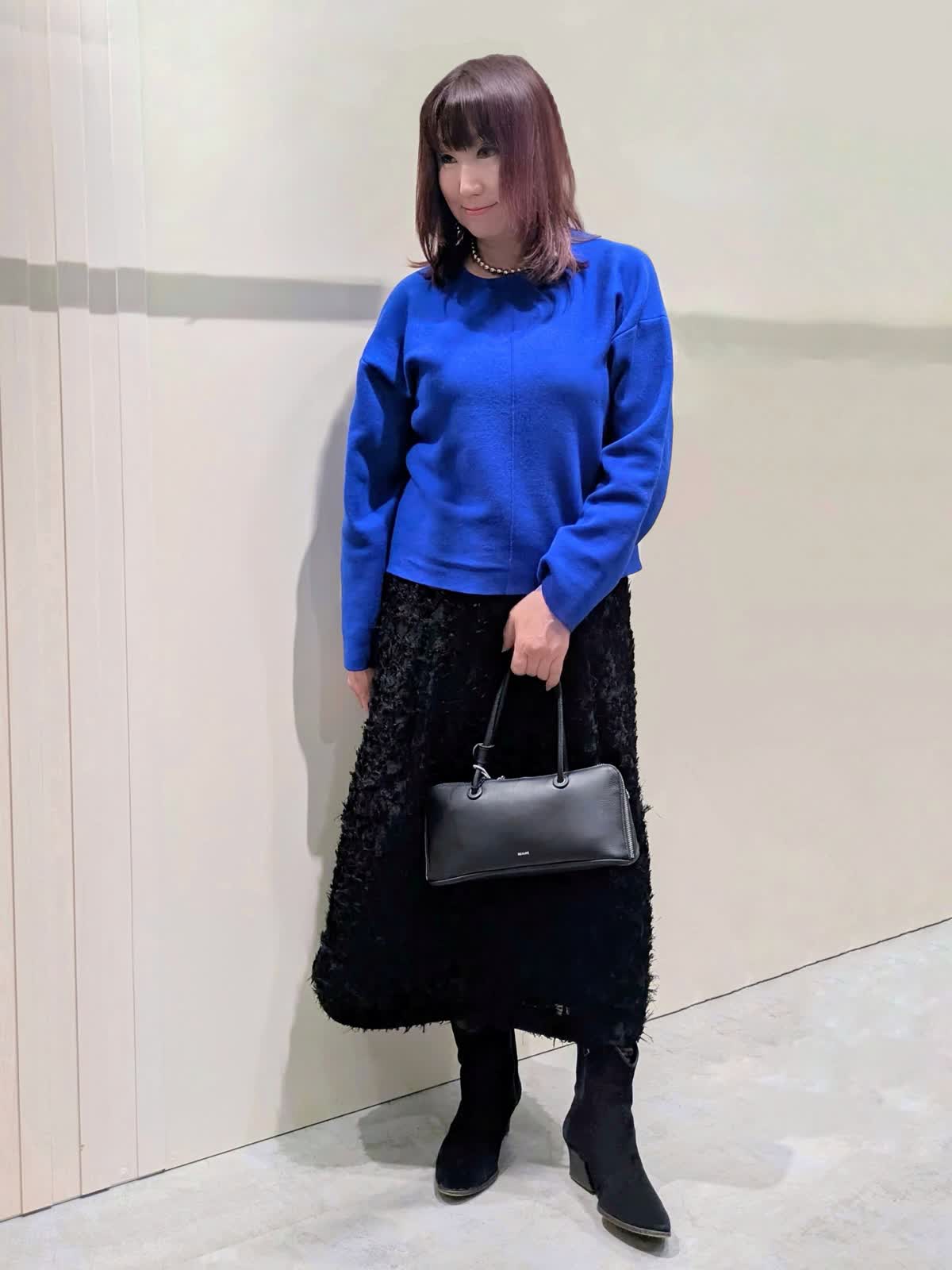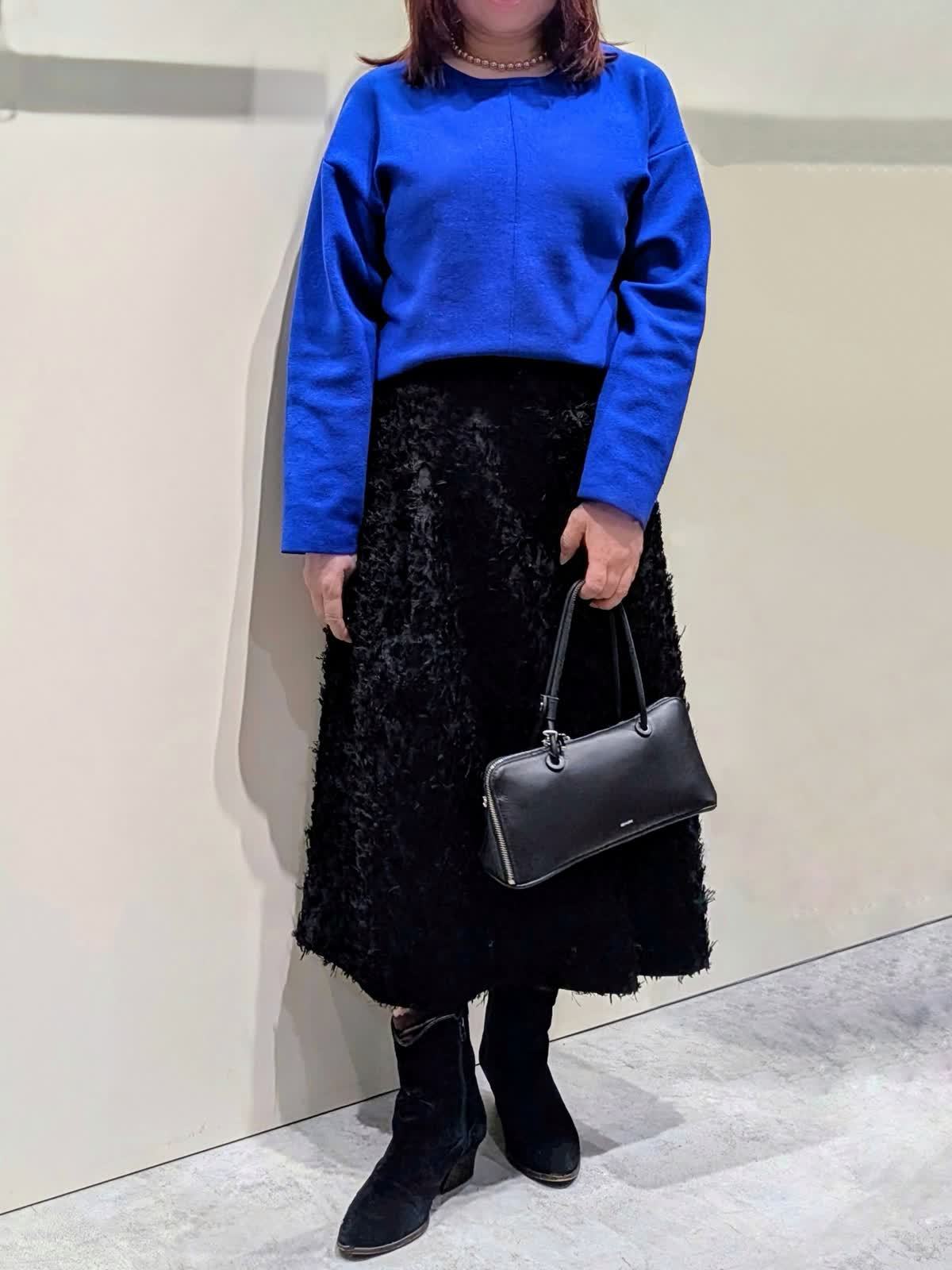 【着用サイズ】プルオーバー:フリー コート、スカート:9号【着用カラー】コート、スカート:ブラック プルオーバー:ブルー ブルーコーディネート 軽くて、保温性・撥水防水効果もある暖かダウンコートは、上品なマット生地でピーコート風のデザインがポイントです。ゆとりのあるサイズ感と程良い丈感で気軽に羽織れてボトムを選びません。鮮やかなブルーのプルオーバーは、緩すぎない程良いサイズ感ながら身体のラインを拾わず、スッキリ見せてくれます。コートインナーの差し色にもなる綺麗なお色目です。フリンジ仕様のカットジャガードのスカートは、ややストレートなフレアシルエットで、上品な印象です。ウエスト後ろゴム仕様で、快適なはき心地でサテンテープのファスナーの引手がアクセントに…存在感のあるスタイリングのアクセントになる1枚です。