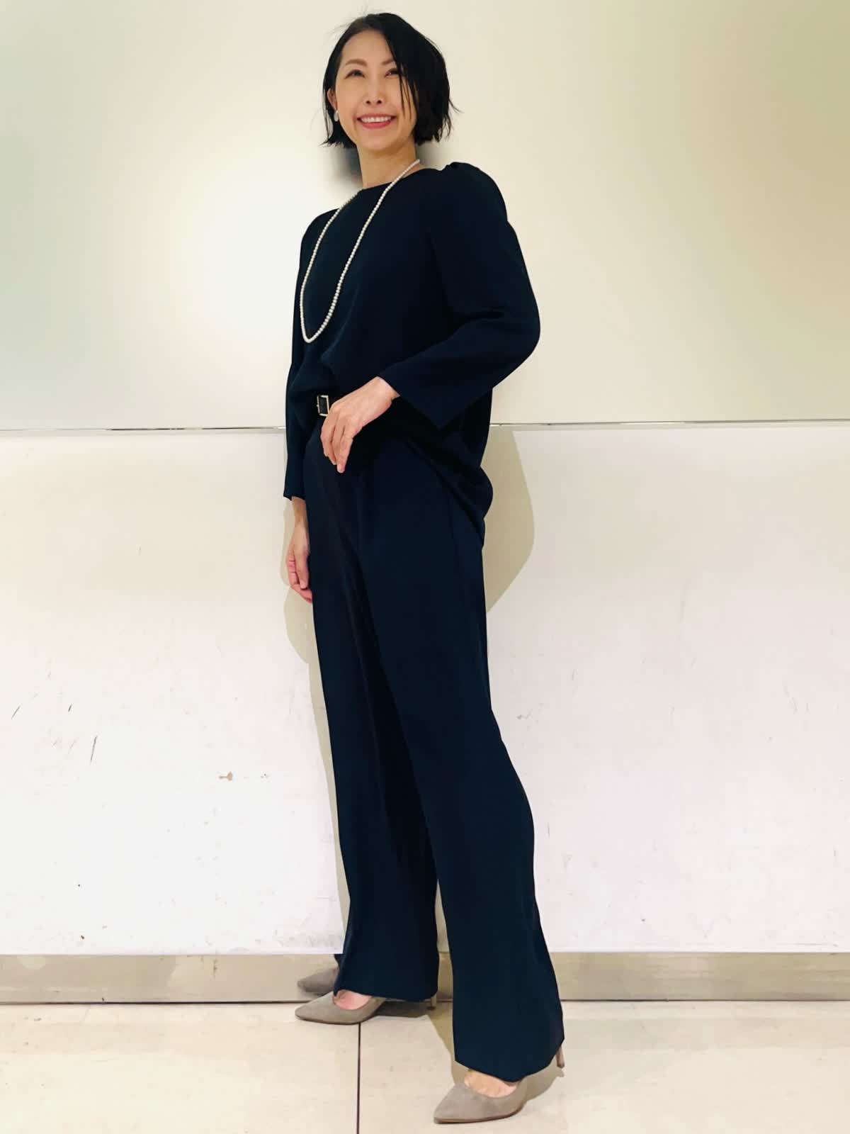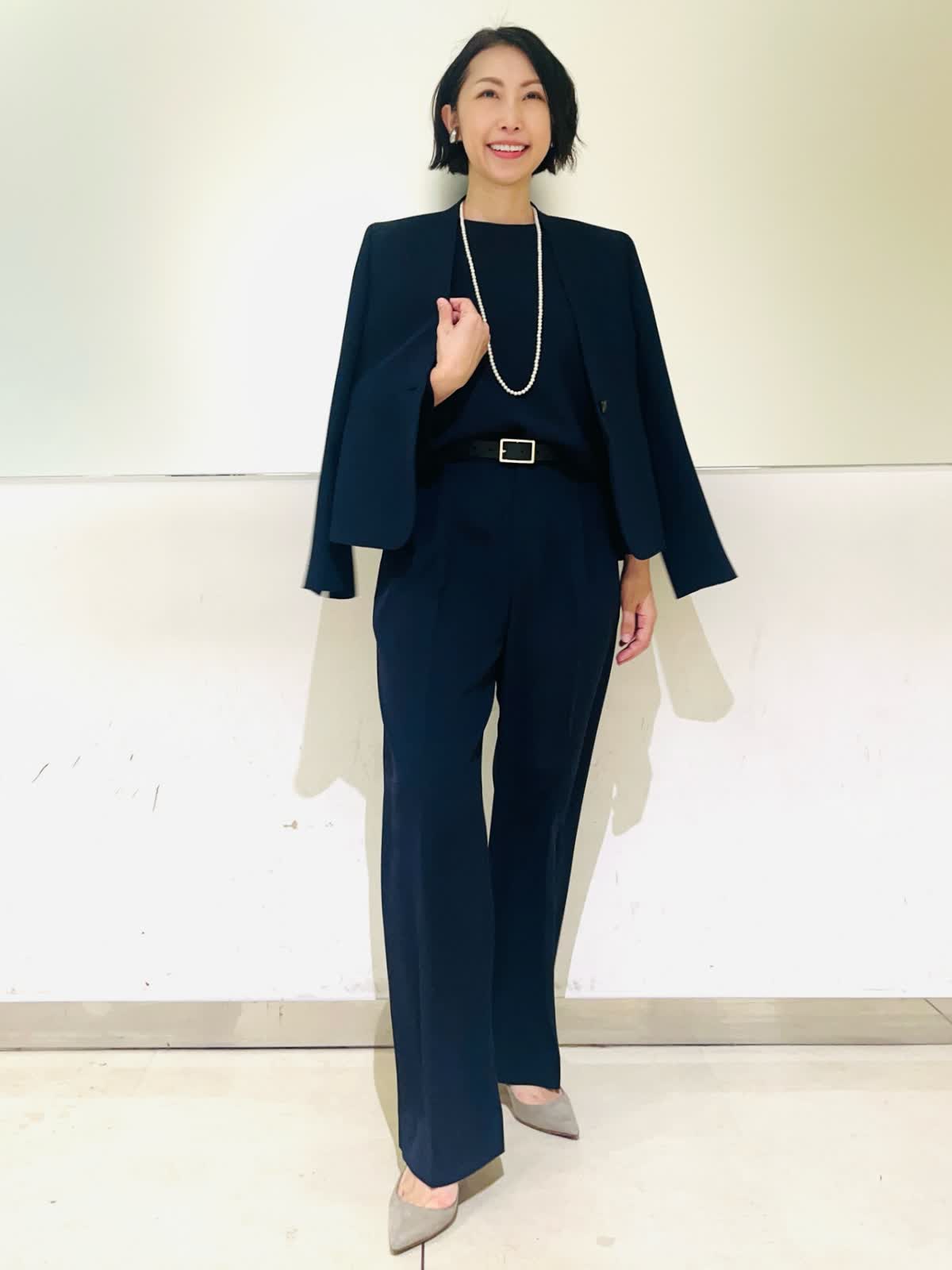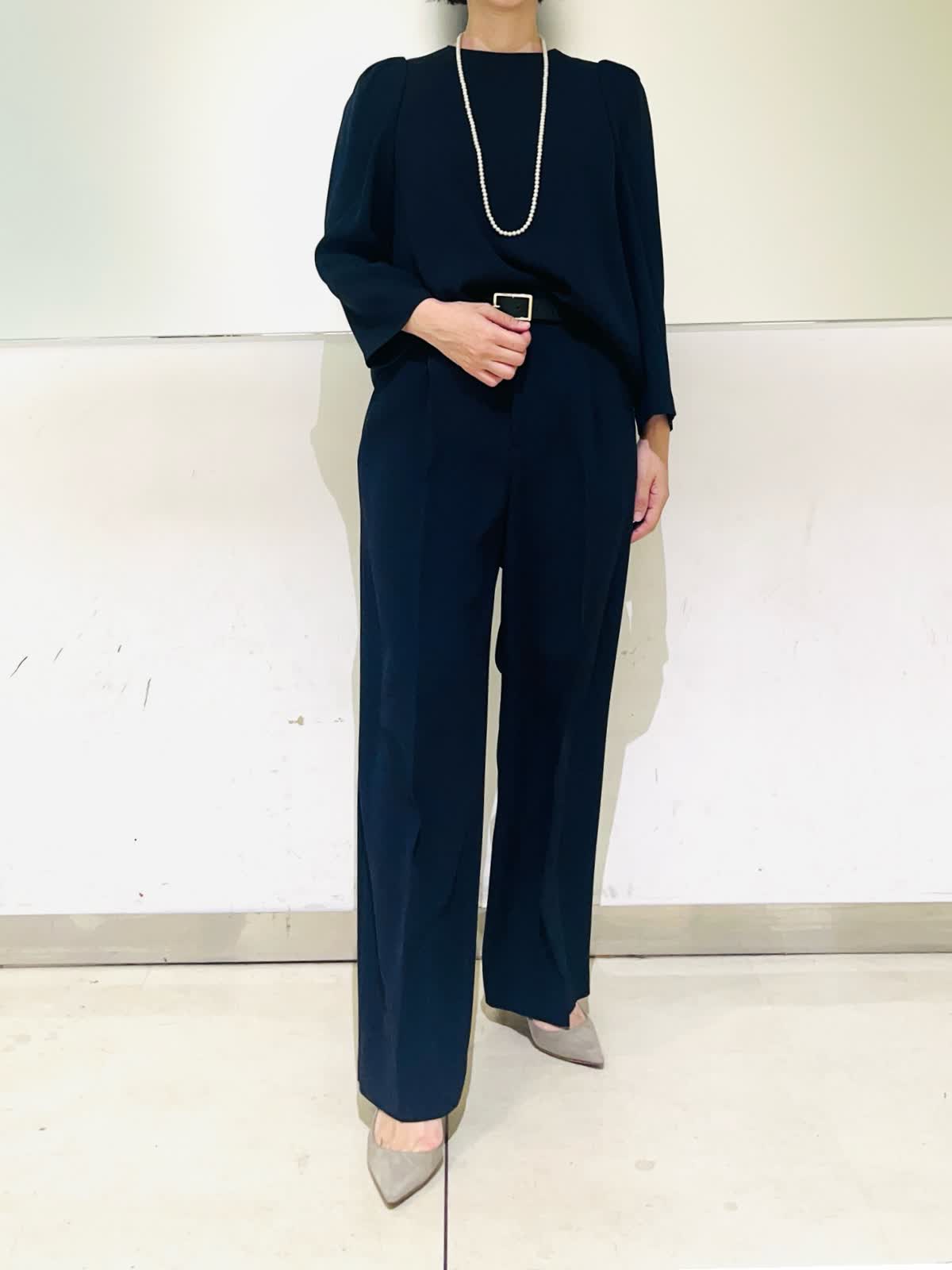 【着用アイテム/カラー】ブラウス、パンツ、ジャケット:9号/ネイビー ブラウスとパンツの2ピース。とろみのある落ち感のある生地で、上品なドレープ感が出ます。、お仕事はもちろん、お子様の送り迎えや学校行事にもおすすめ。ホームケア出来るのでデイリーに使えます。同素材でジャケットもあるので、3点セットで揃えておくと便利です。