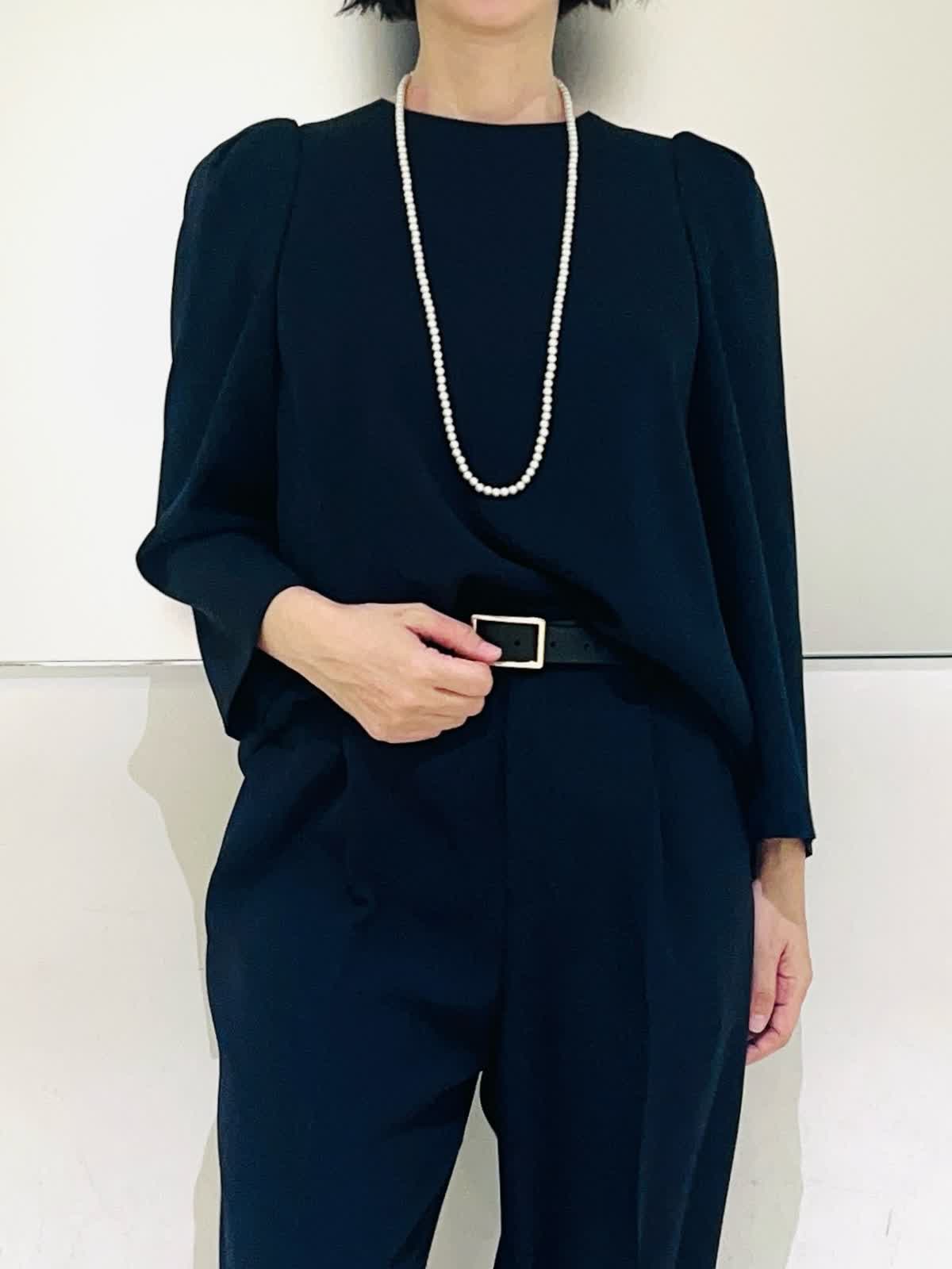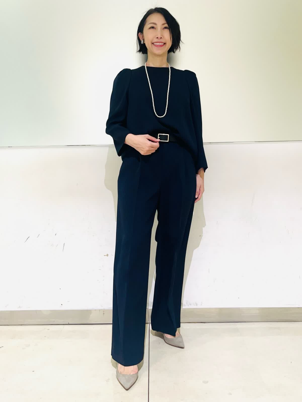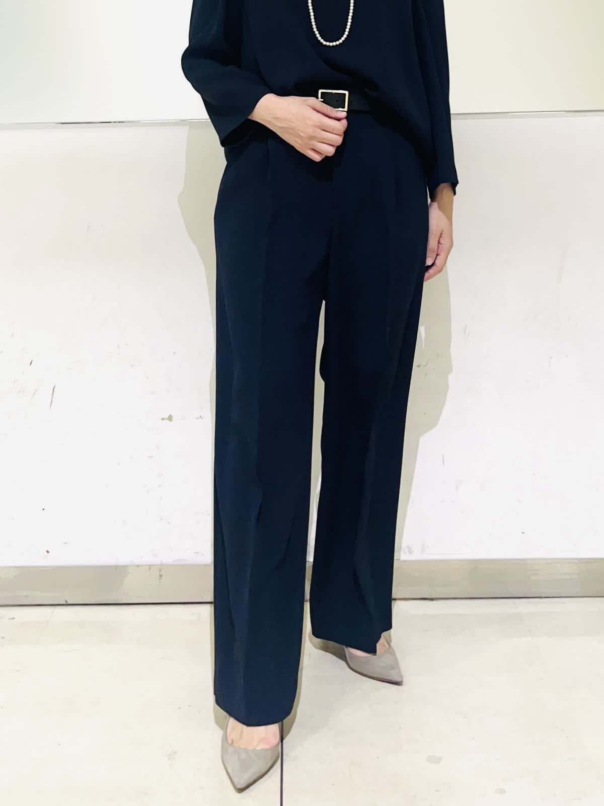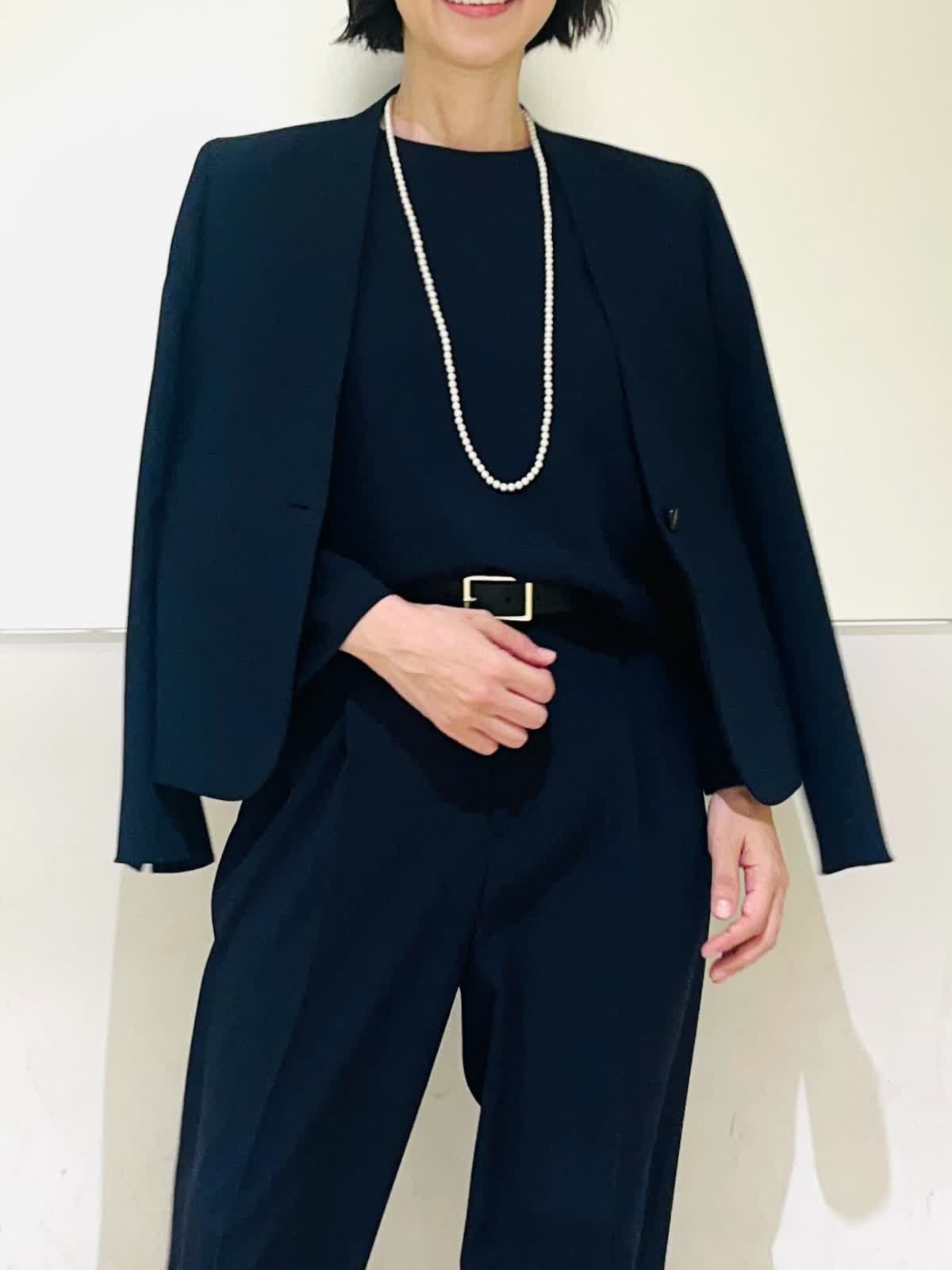 【着用アイテム/カラー】ブラウス、パンツ、ジャケット:9号/ネイビー ブラウスとパンツの2ピース。とろみのある落ち感のある生地で、上品なドレープ感が出ます。、お仕事はもちろん、お子様の送り迎えや学校行事にもおすすめ。ホームケア出来るのでデイリーに使えます。同素材でジャケットもあるので、3点セットで揃えておくと便利です。