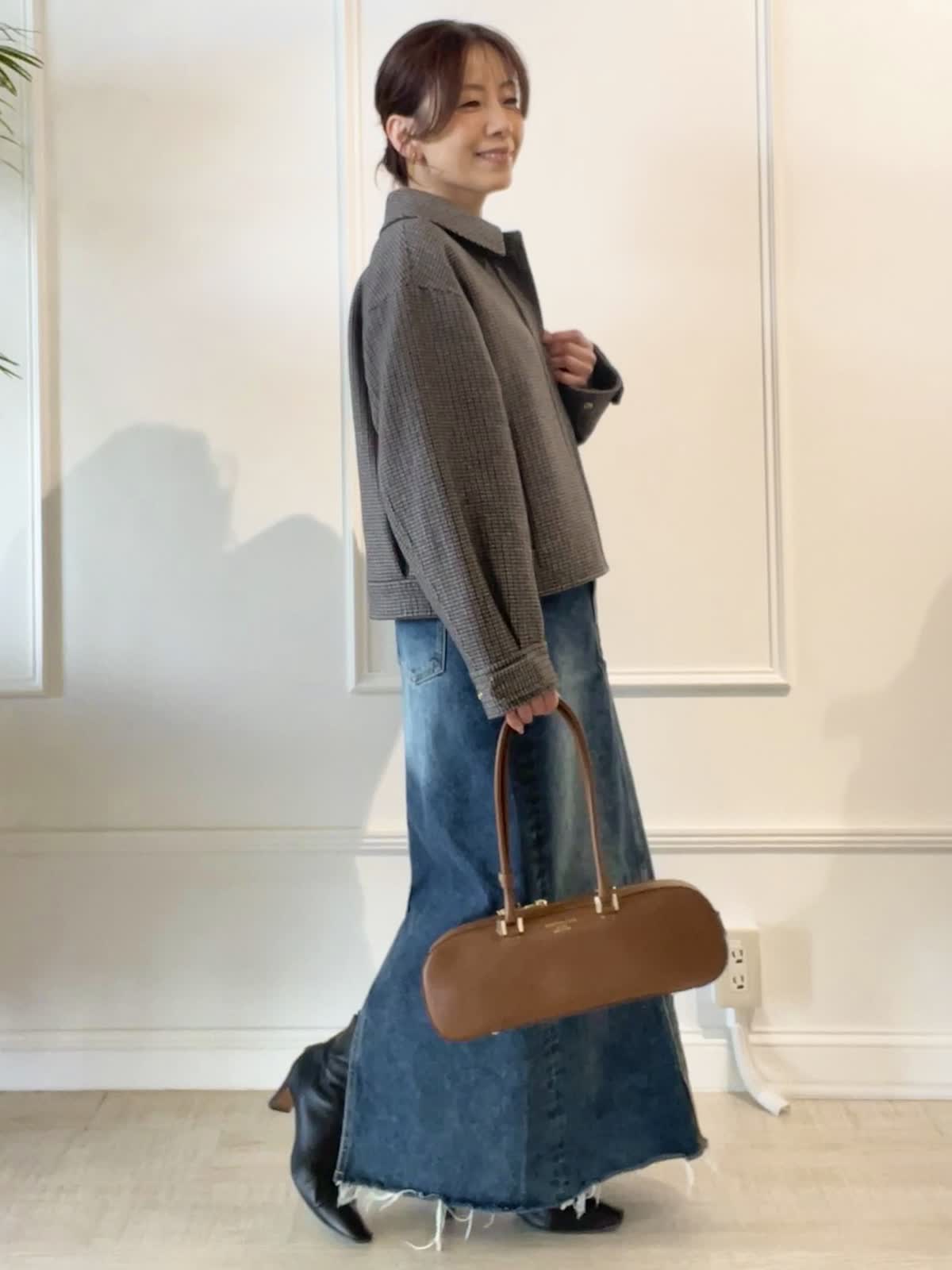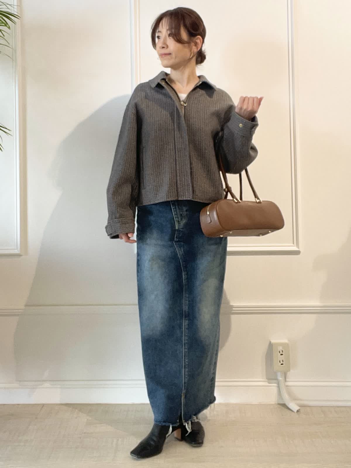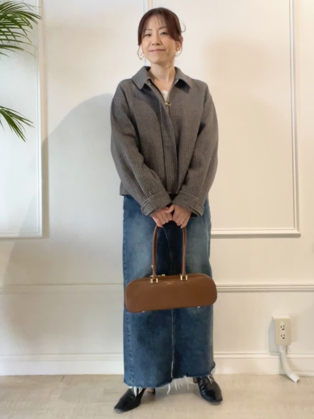 【着用アイテム:カラー/サイズ】 ウールブルゾン:柄小/9号 バッグ:キャメル 季節の変わり目にちょうどいいウール混ブルゾン。きれいめボトムと合わせればお仕事着に、デニムと合わせてカジュアルにもOK。程よいゆとりもあるので、ざっくりニットも楽々着込めます。 ChristianVillaのキャメルのパケット型バッグを合わせ、きれいめにまとめました。