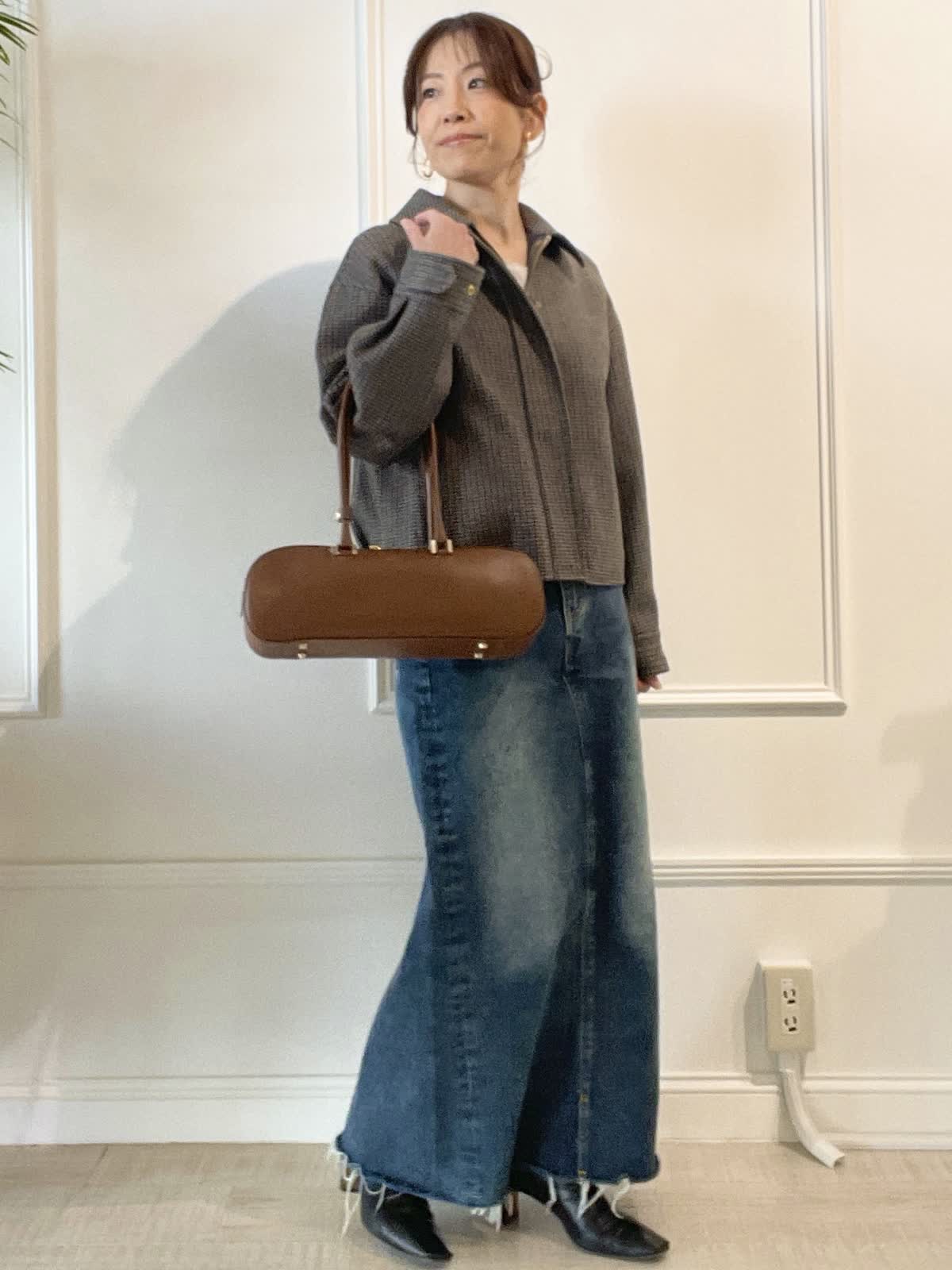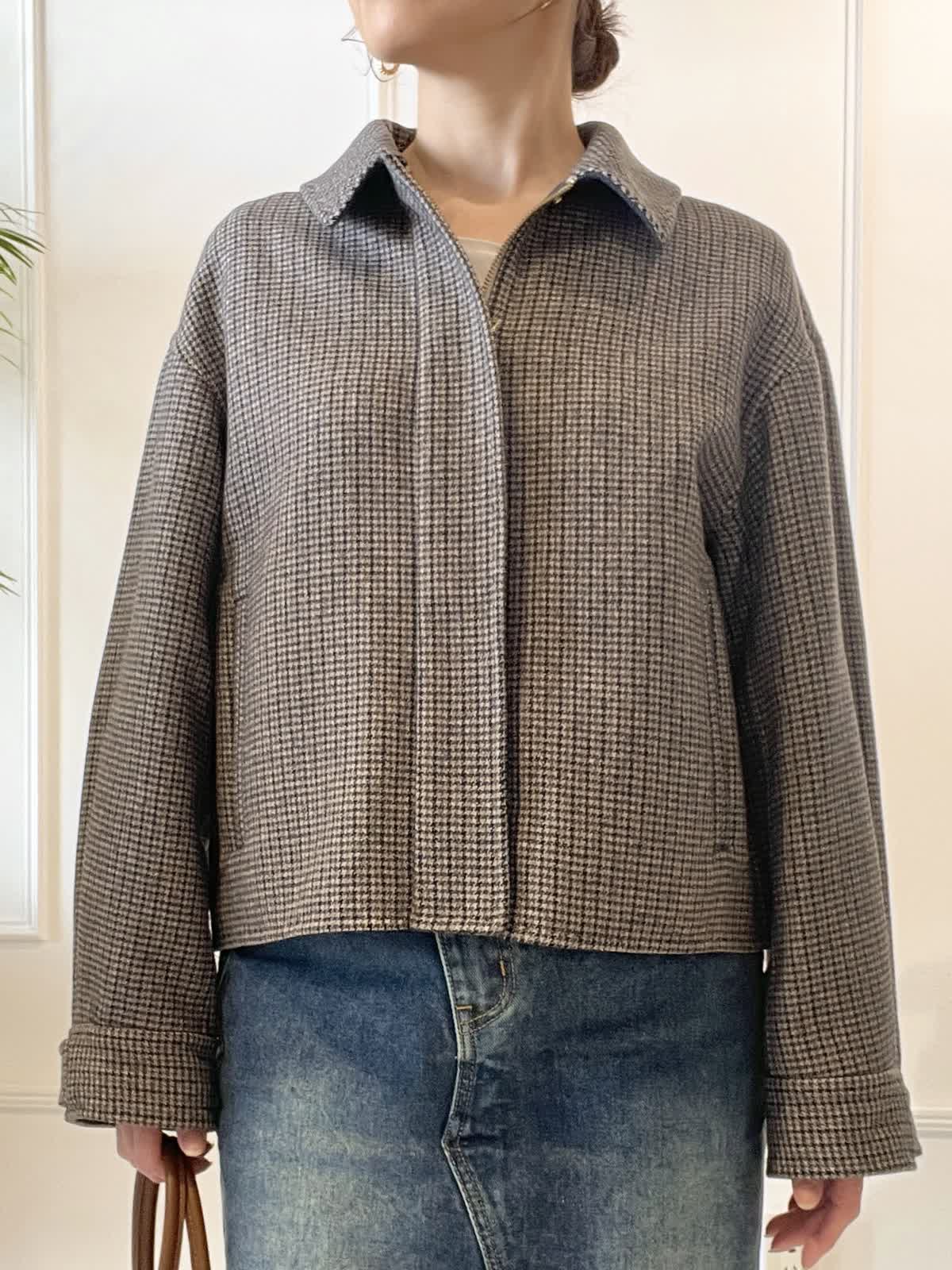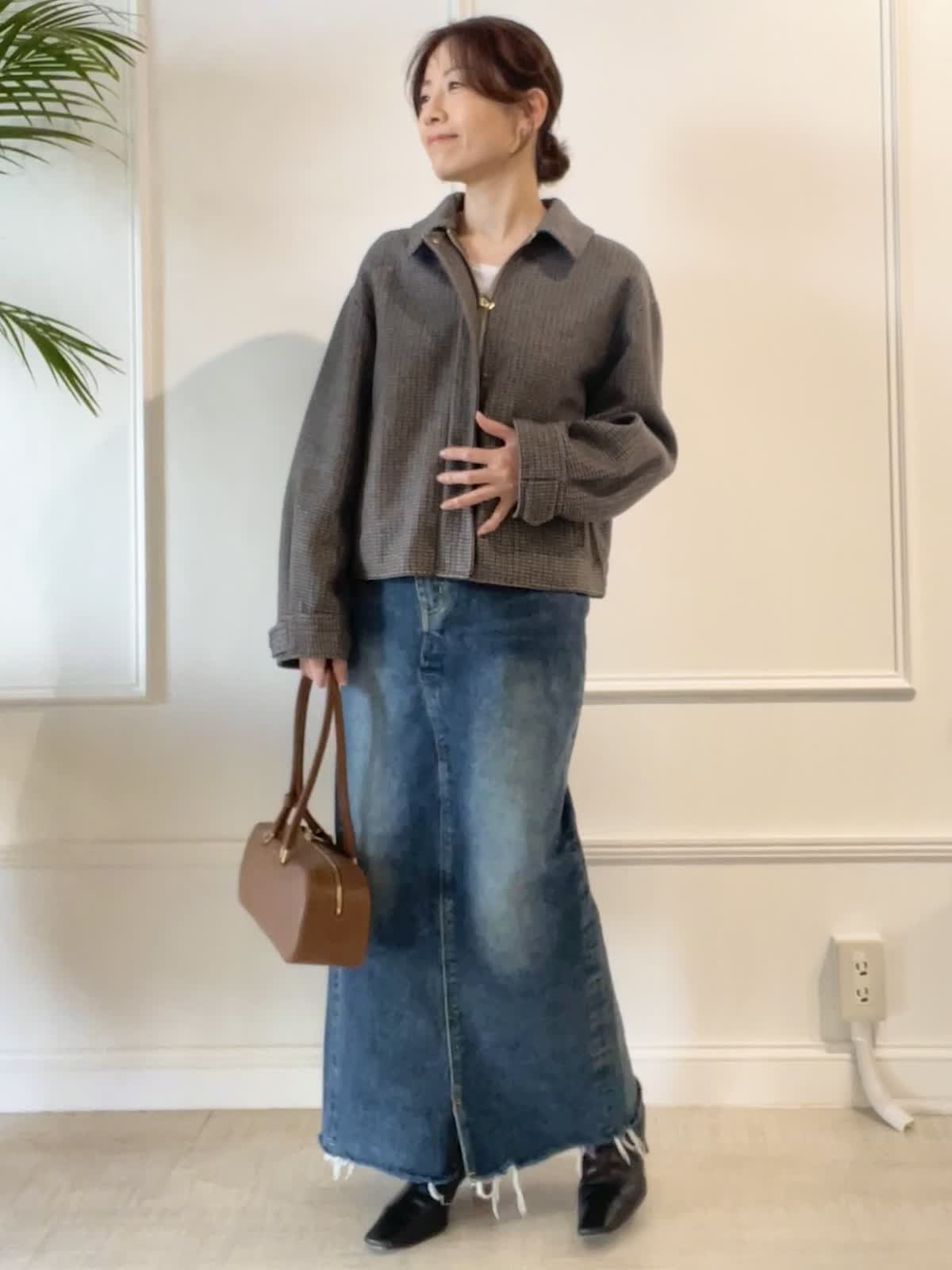 【着用アイテム:カラー/サイズ】 ウールブルゾン:柄小/9号 バッグ:キャメル 季節の変わり目にちょうどいいウール混ブルゾン。きれいめボトムと合わせればお仕事着に、デニムと合わせてカジュアルにもOK。程よいゆとりもあるので、ざっくりニットも楽々着込めます。 ChristianVillaのキャメルのパケット型バッグを合わせ、きれいめにまとめました。