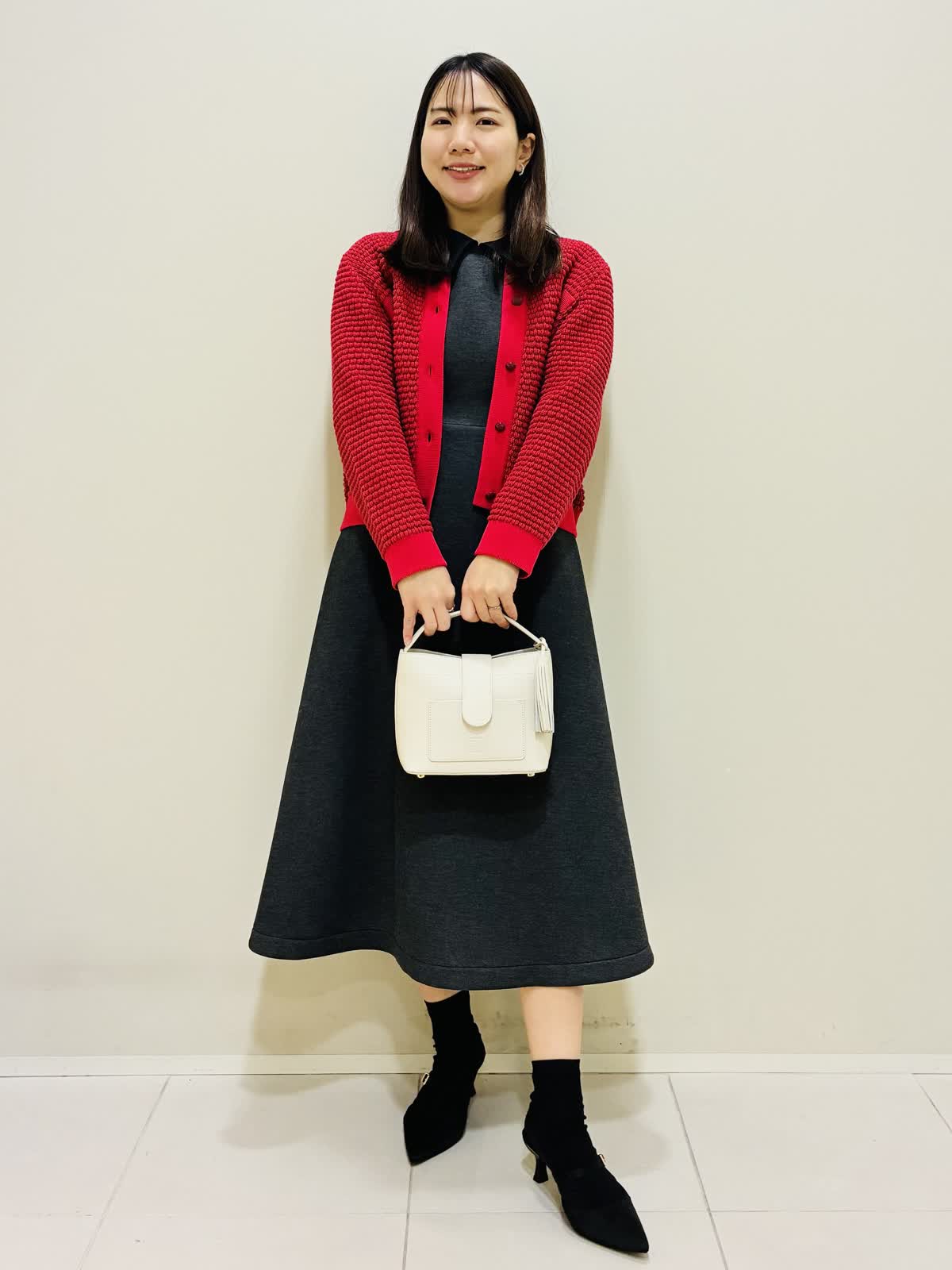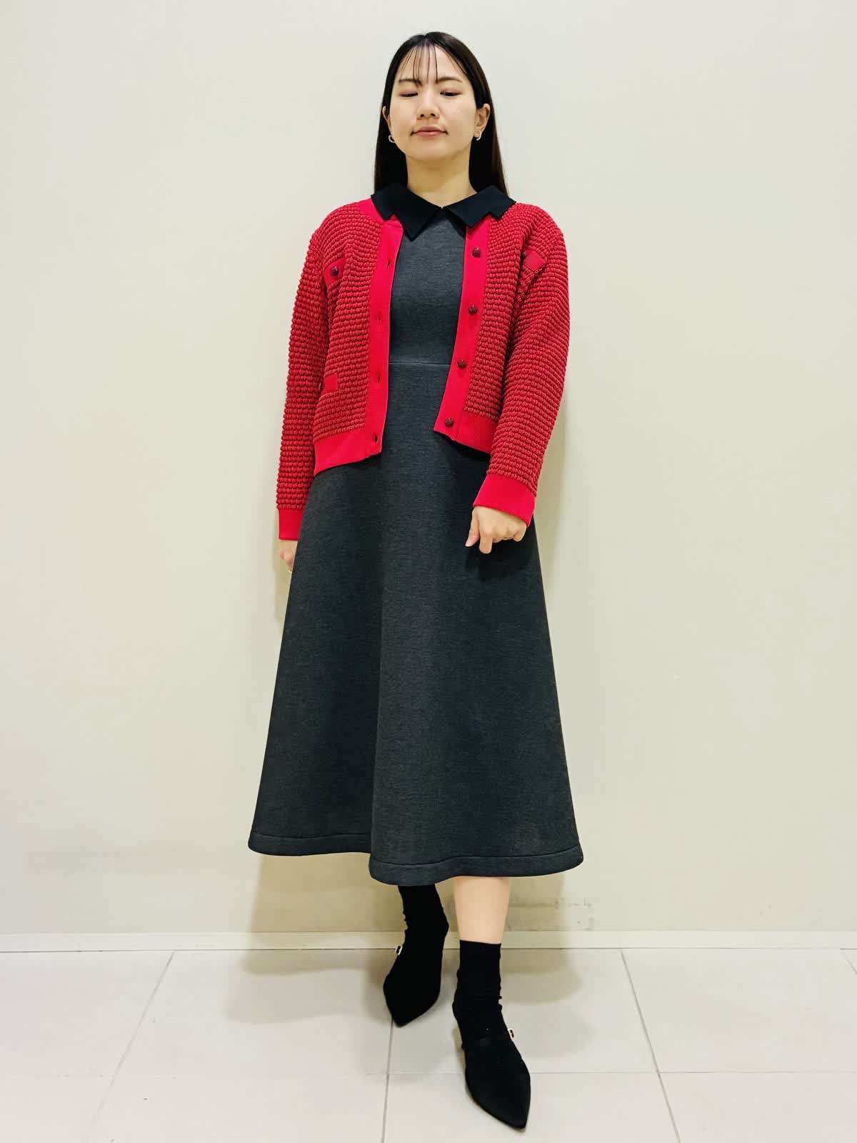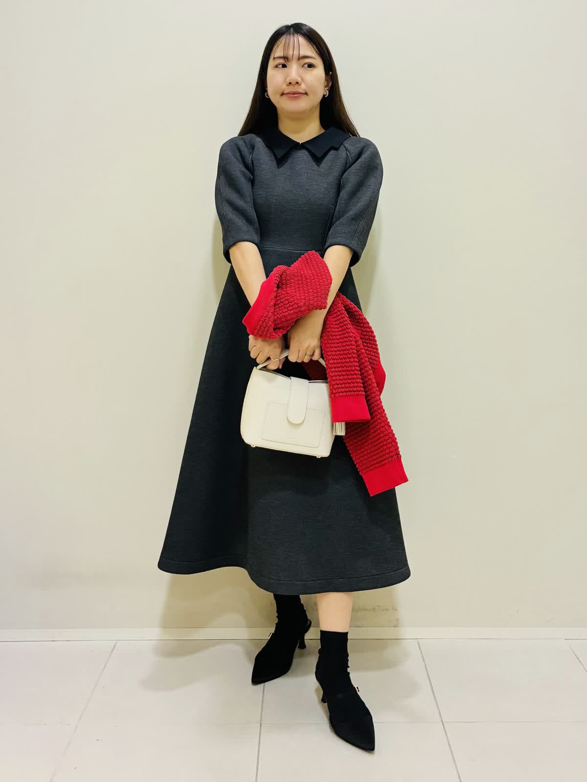 【着用サイズ】 ワンピース:グレー:9号サイズ カーディガン:レッド:9号サイズ バッグ:オフホワイト 『春先にも着れるカーディガンコーデ』 衿のかわいいワンピースにパールが散りばめられたショートコートで、ゆったり着れるデザインです。 バッグはショルダーにもなり、大きさも程よいです。