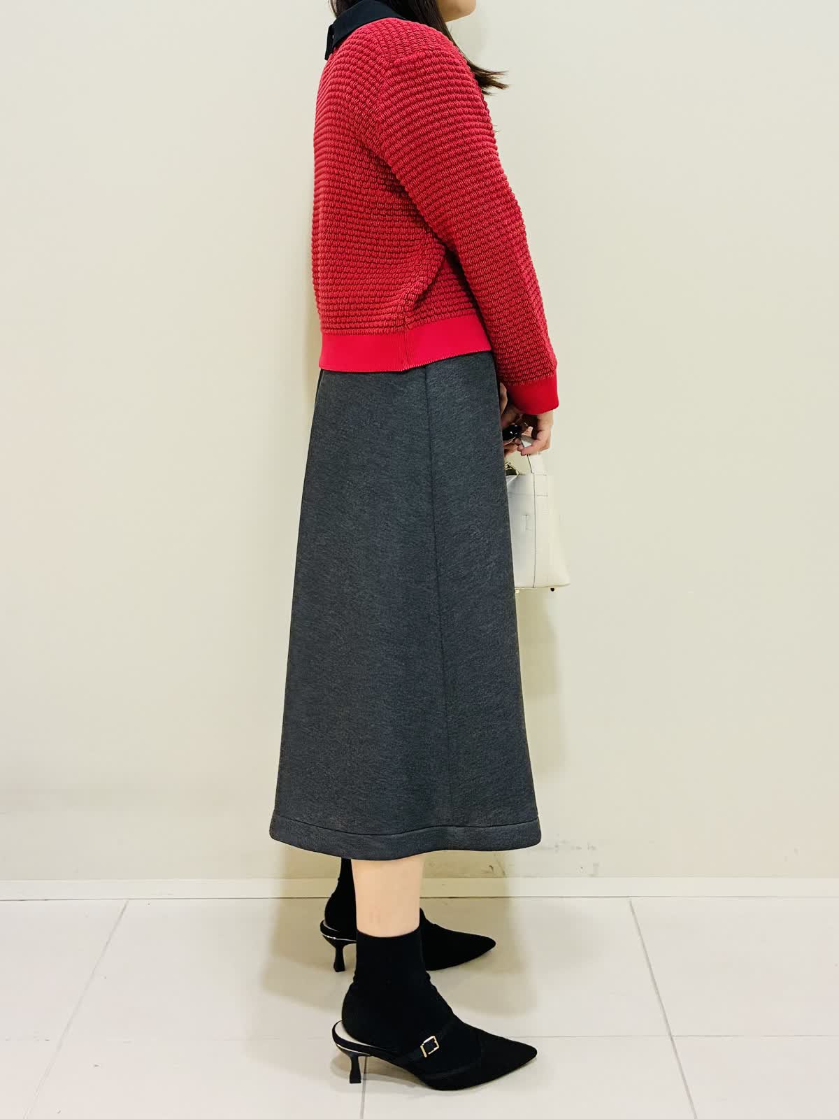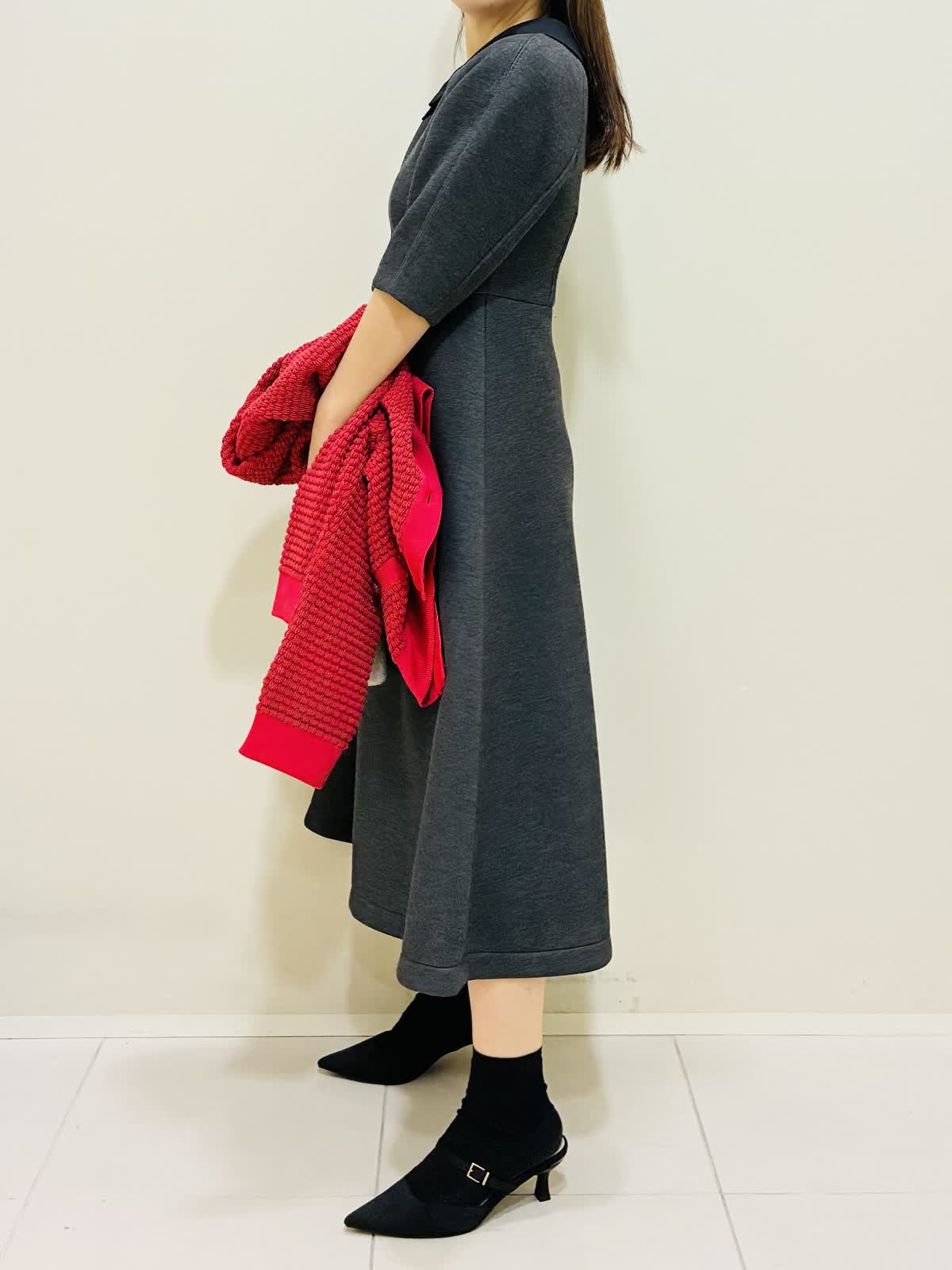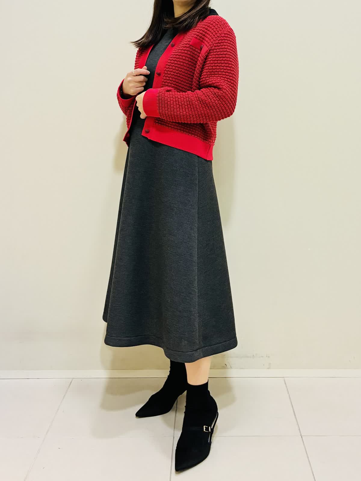 【着用サイズ】 ワンピース:グレー:9号サイズ カーディガン:レッド:9号サイズ バッグ:オフホワイト 『春先にも着れるカーディガンコーデ』 衿のかわいいワンピースにパールが散りばめられたショートコートで、ゆったり着れるデザインです。 バッグはショルダーにもなり、大きさも程よいです。