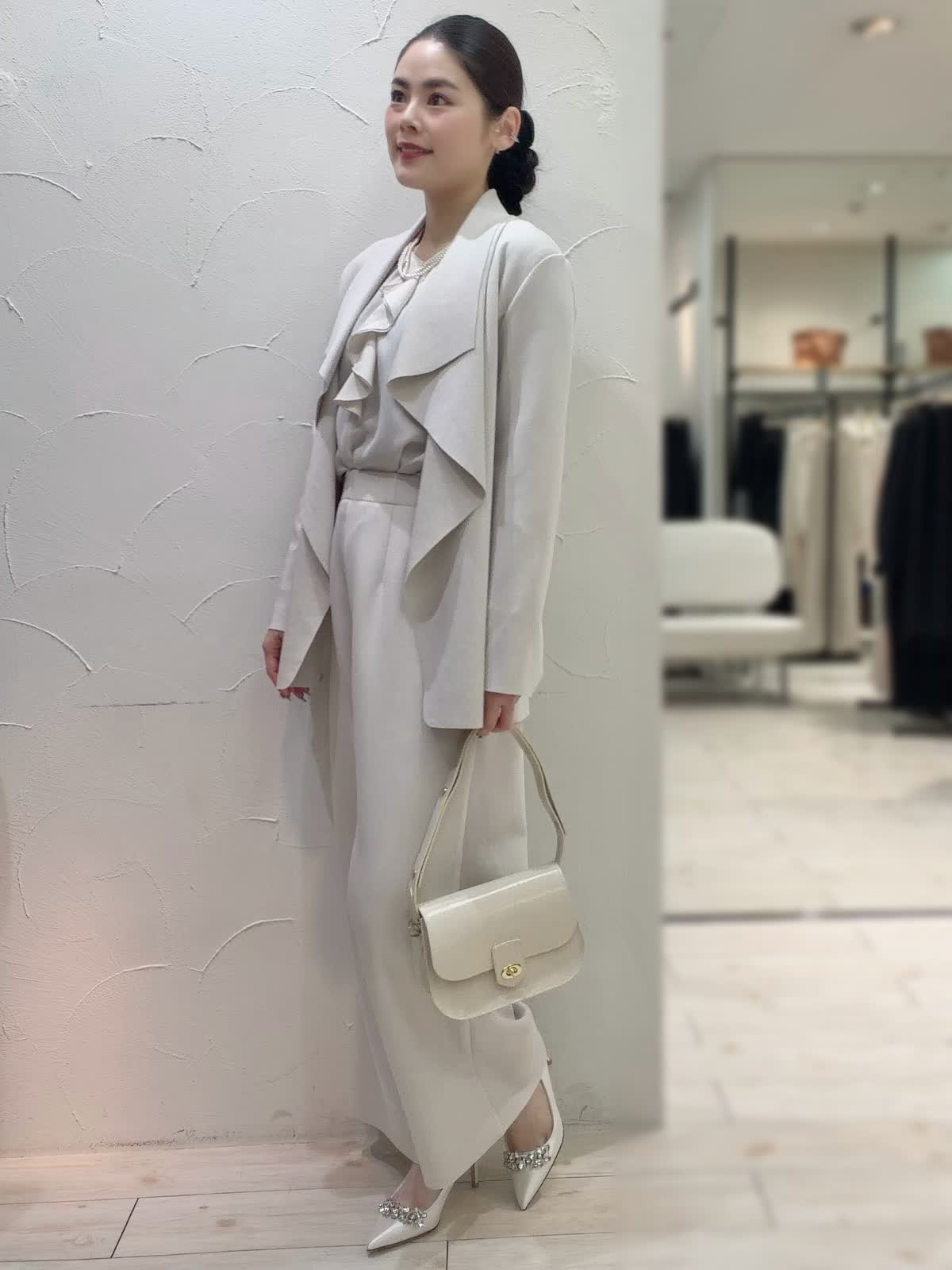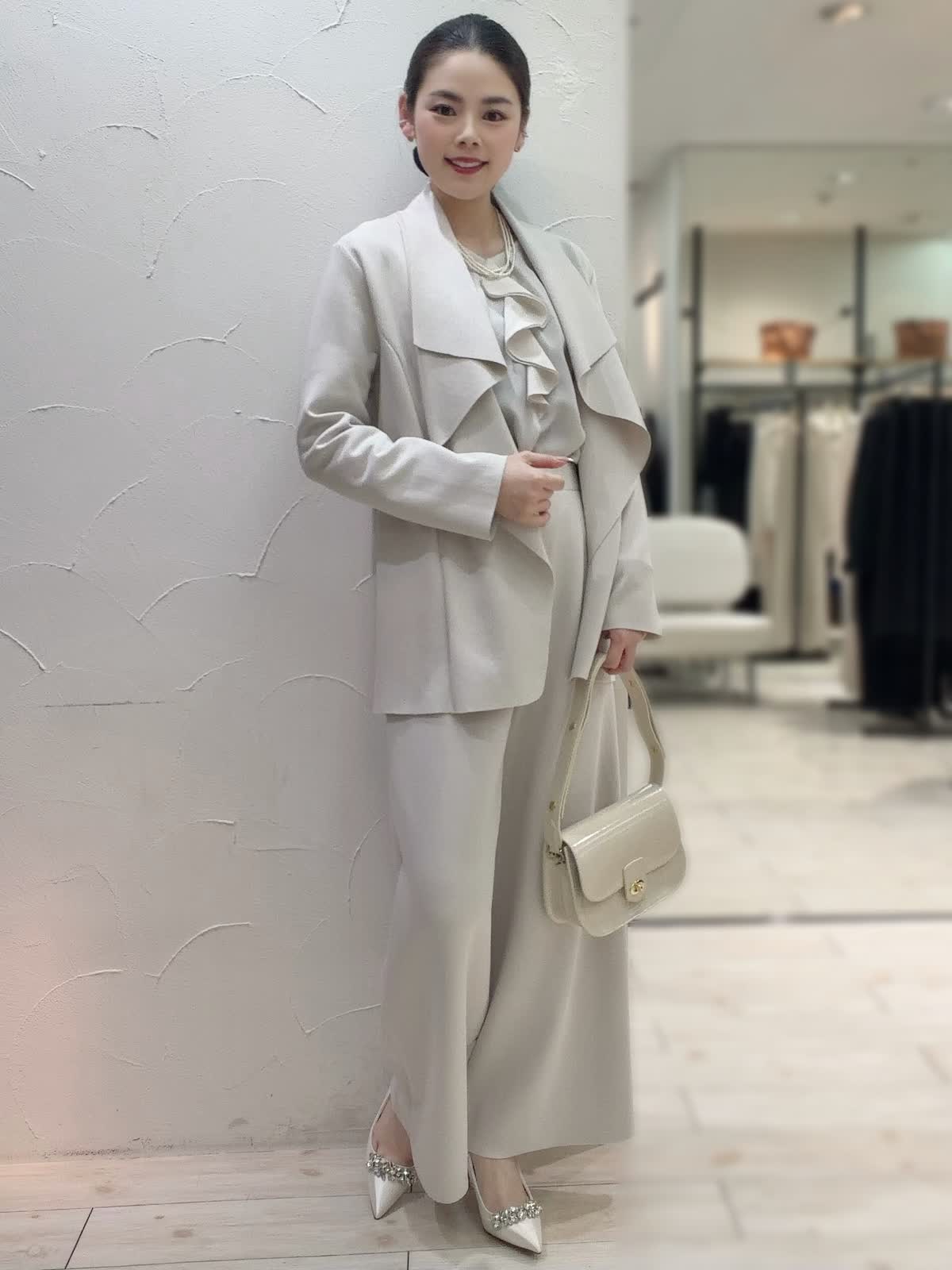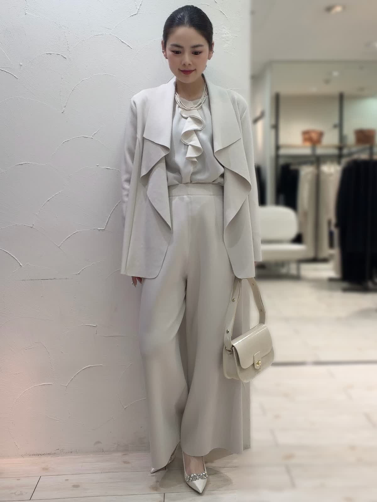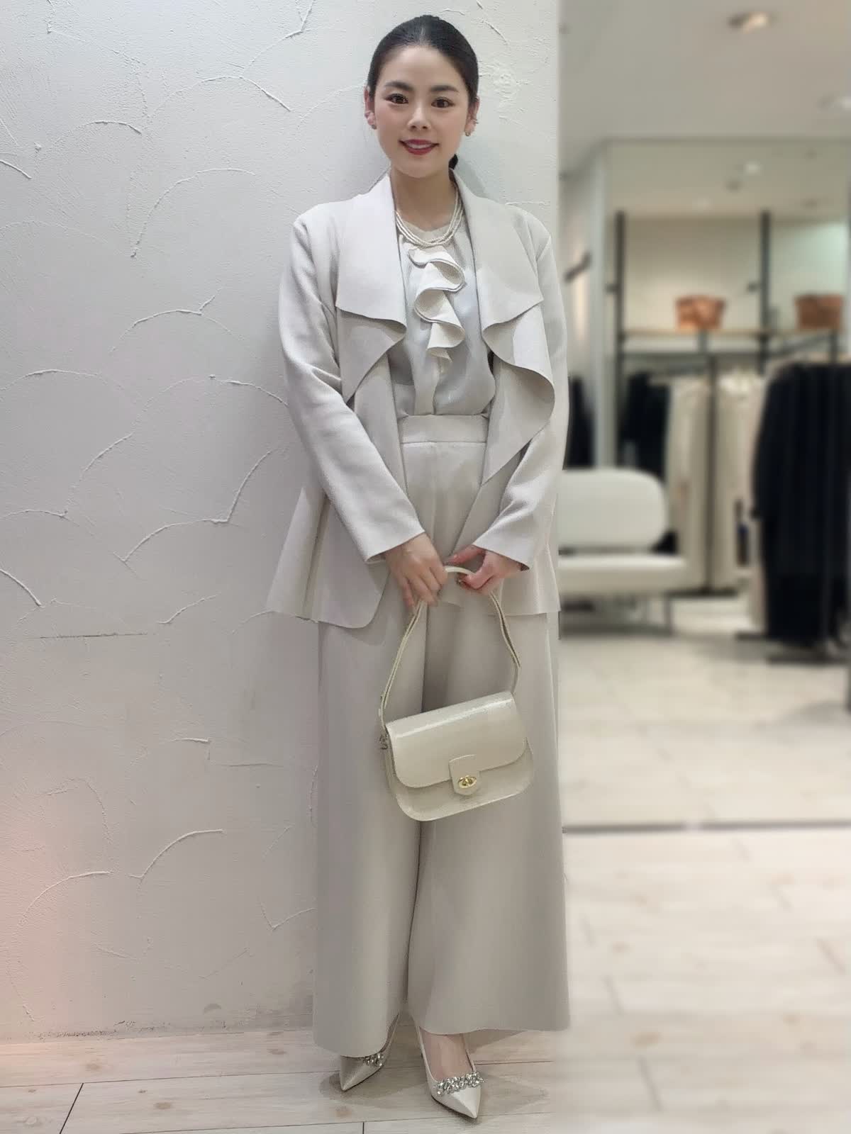 【着用サイズ】全て9号 【着用カラー】ジャケット:ベージュ ブラウス:アイボリー パンツ:ベージュ ネックレス:パール バッグ:ベージュ お呼ばれにもおすすめなセットアップ。明るいベージュで華やかな印象に仕上がるセットアップ。ストレッチ性に優れているのでストレスフリーな着