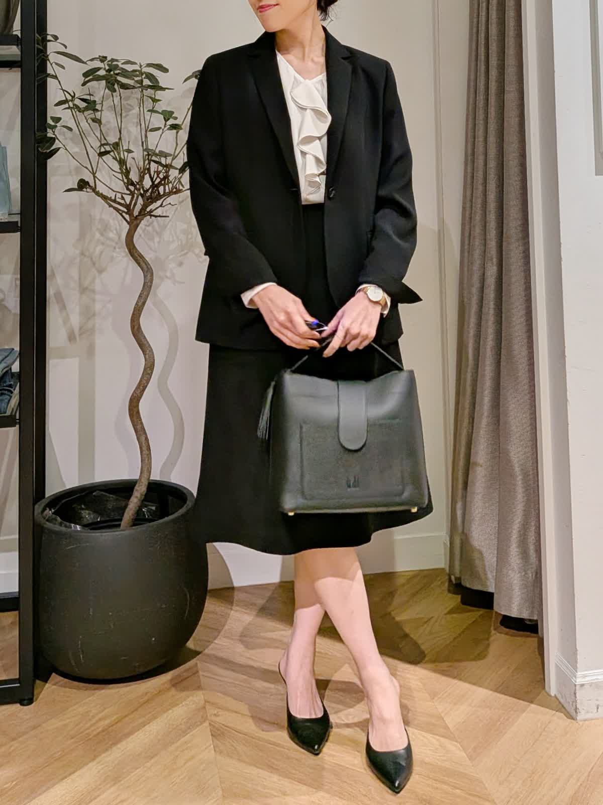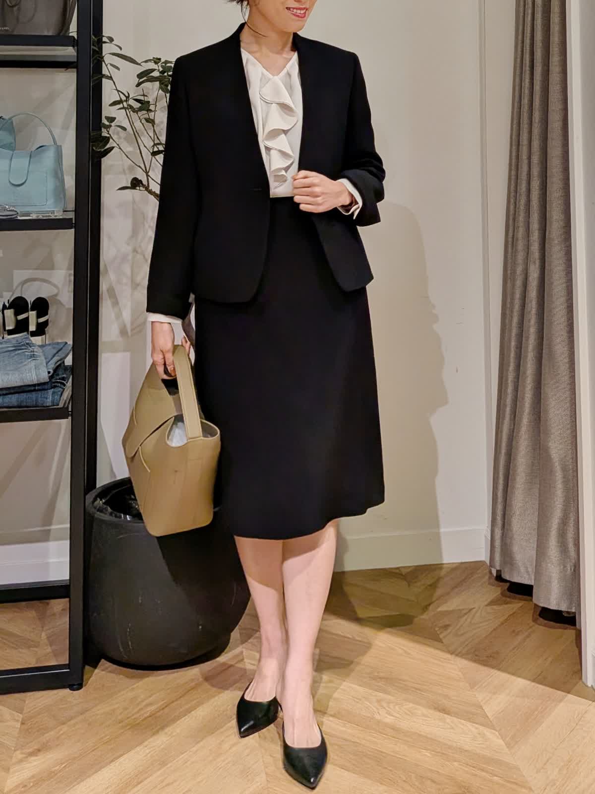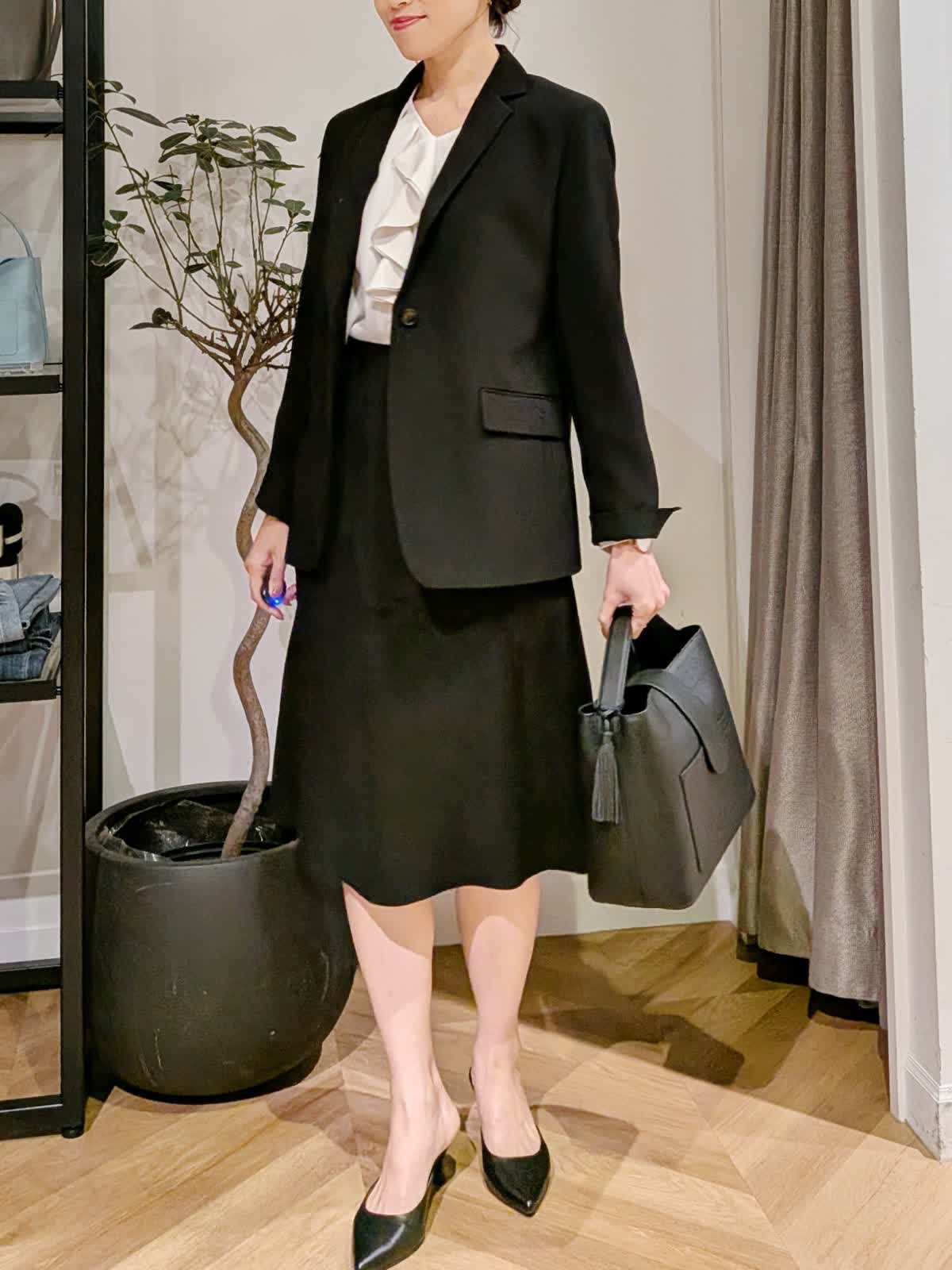 【着用サイズ】ジャケット?ブラック?9号 ブラウス?アイボリー?7号 スカート?ブラック?7号 シャープな襟でスッキリ見えのテーラードジャケット。ヒップにかかる安心丈。ウエストのシェイプも美しくストレッチも効いていて楽に着れるのに美シルエットが叶います。ヒップが気になるウエーブ体型ですが気になる所をカバーしてくれるフレアシルエットスカート。フェミニン&華やかな雰囲気を意識して胸元にフリルのあるブラウスをチョイスしてみました。セレモニーでも入学式などにも使える組み合わせ。同じ素材でパンツ2種類、カラーレスジャケットもご用意しております。