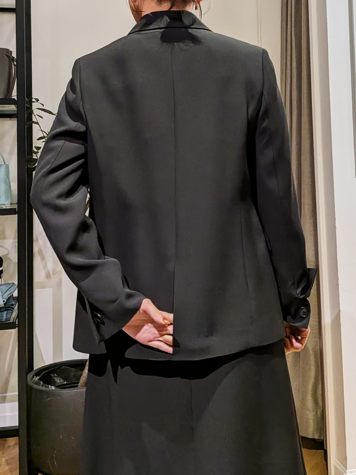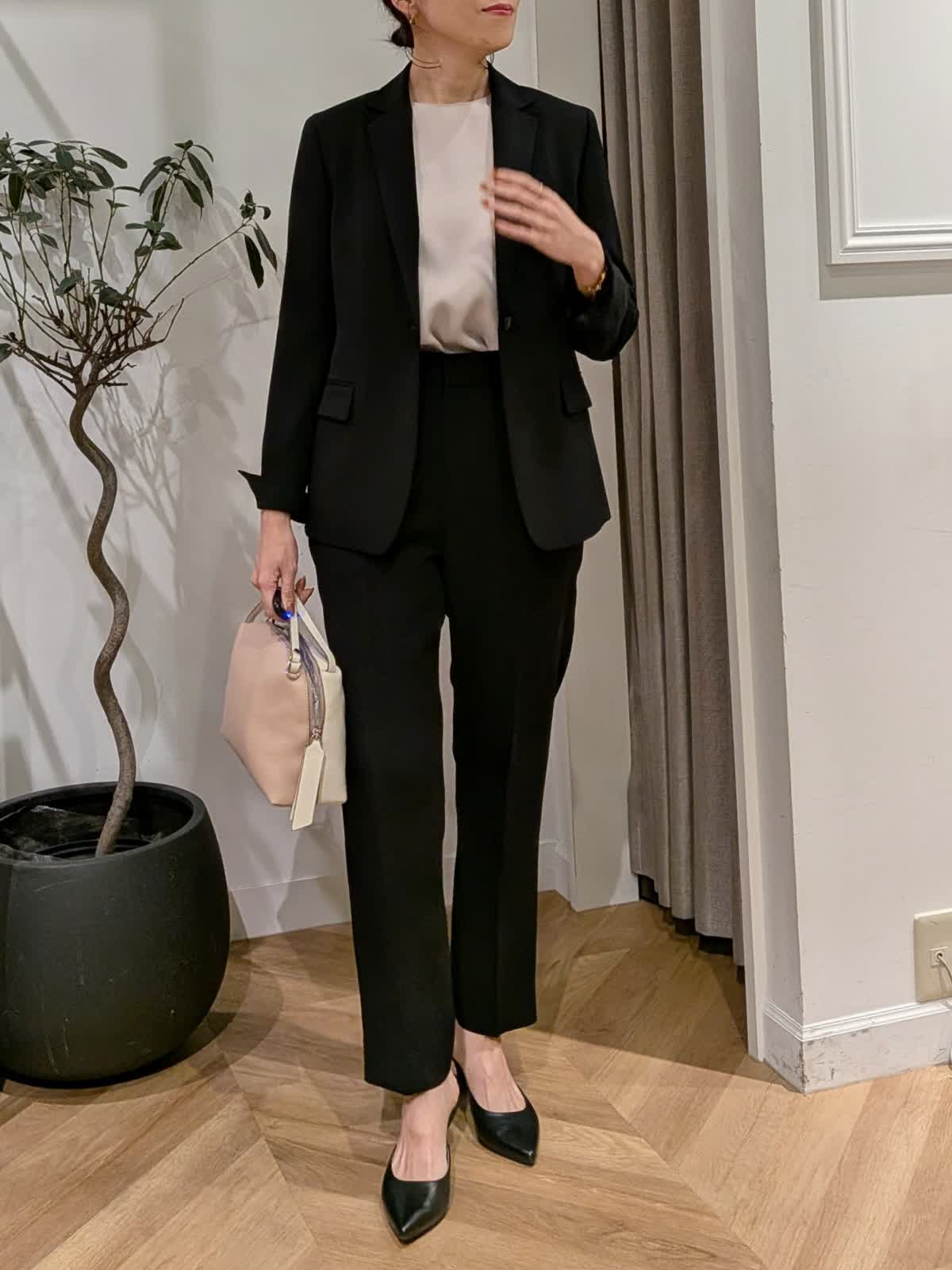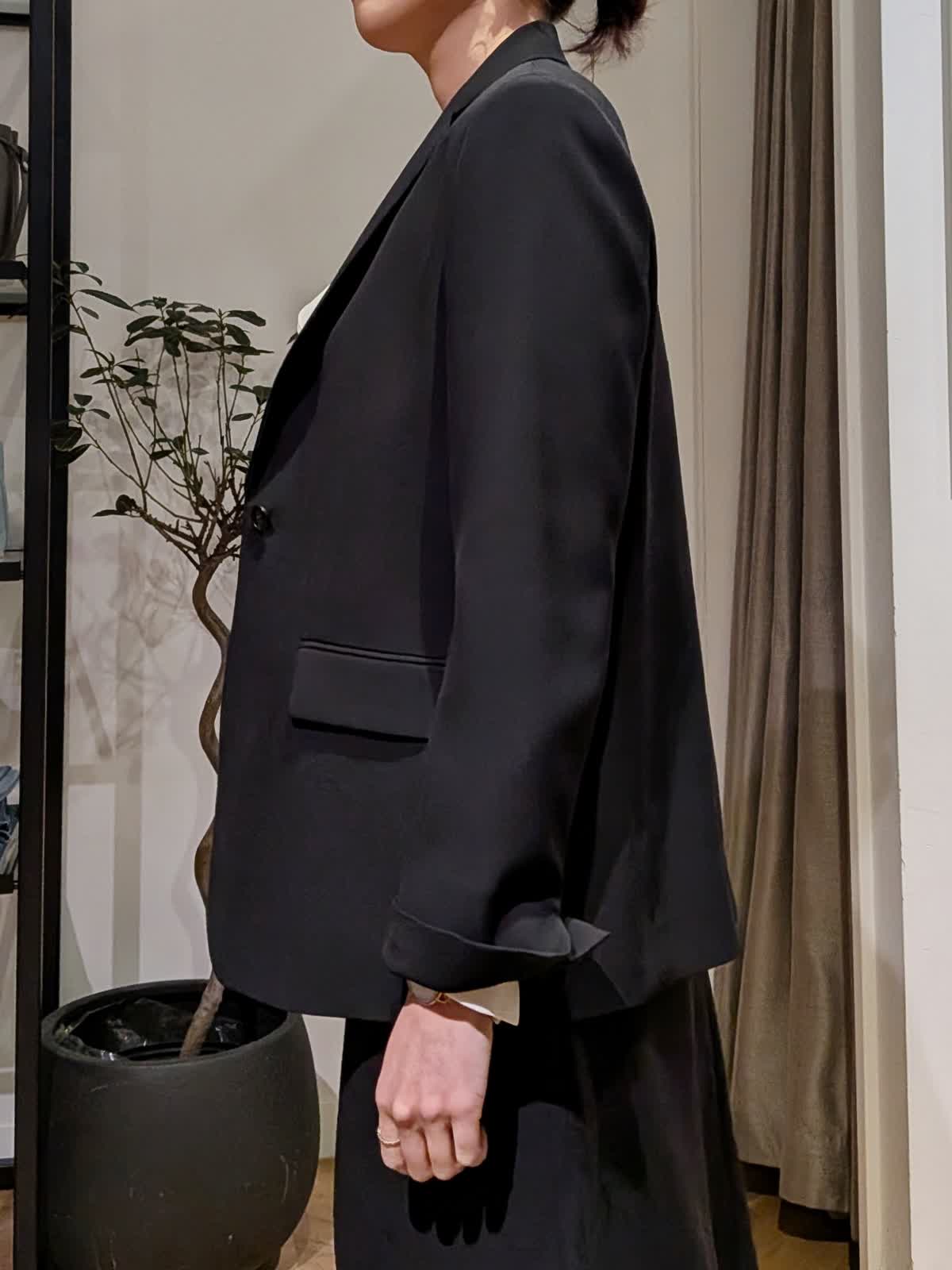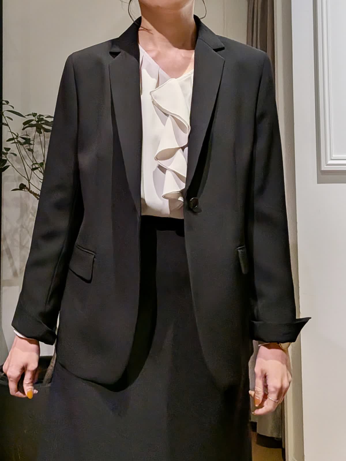 【着用サイズ】ジャケット?ブラック?9号 ブラウス?アイボリー?7号 スカート?ブラック?7号 シャープな襟でスッキリ見えのテーラードジャケット。ヒップにかかる安心丈。ウエストのシェイプも美しくストレッチも効いていて楽に着れるのに美シルエットが叶います。ヒップが気になるウエーブ体型ですが気になる所をカバーしてくれるフレアシルエットスカート。フェミニン&華やかな雰囲気を意識して胸元にフリルのあるブラウスをチョイスしてみました。セレモニーでも入学式などにも使える組み合わせ。同じ素材でパンツ2種類、カラーレスジャケットもご用意しております。