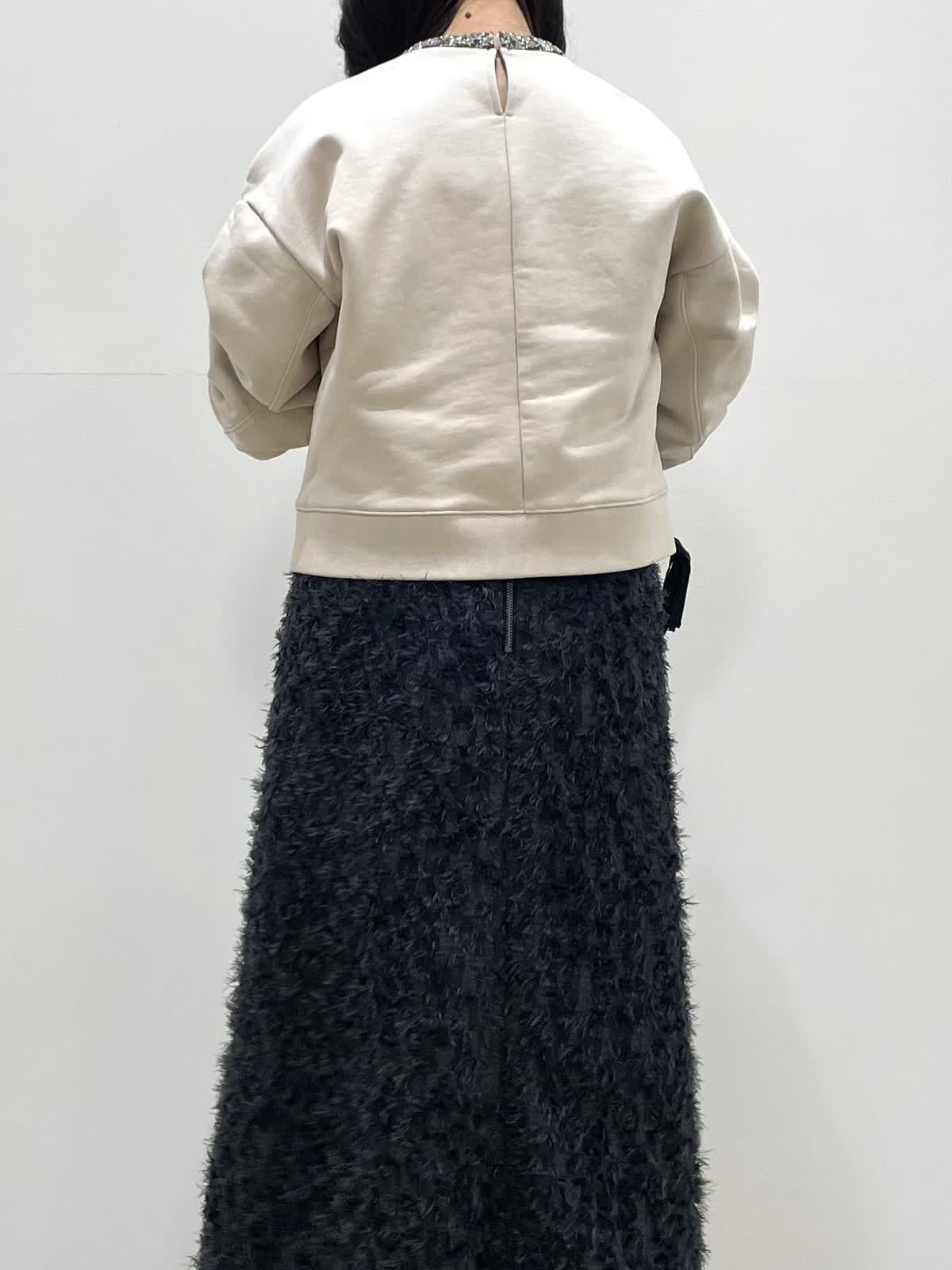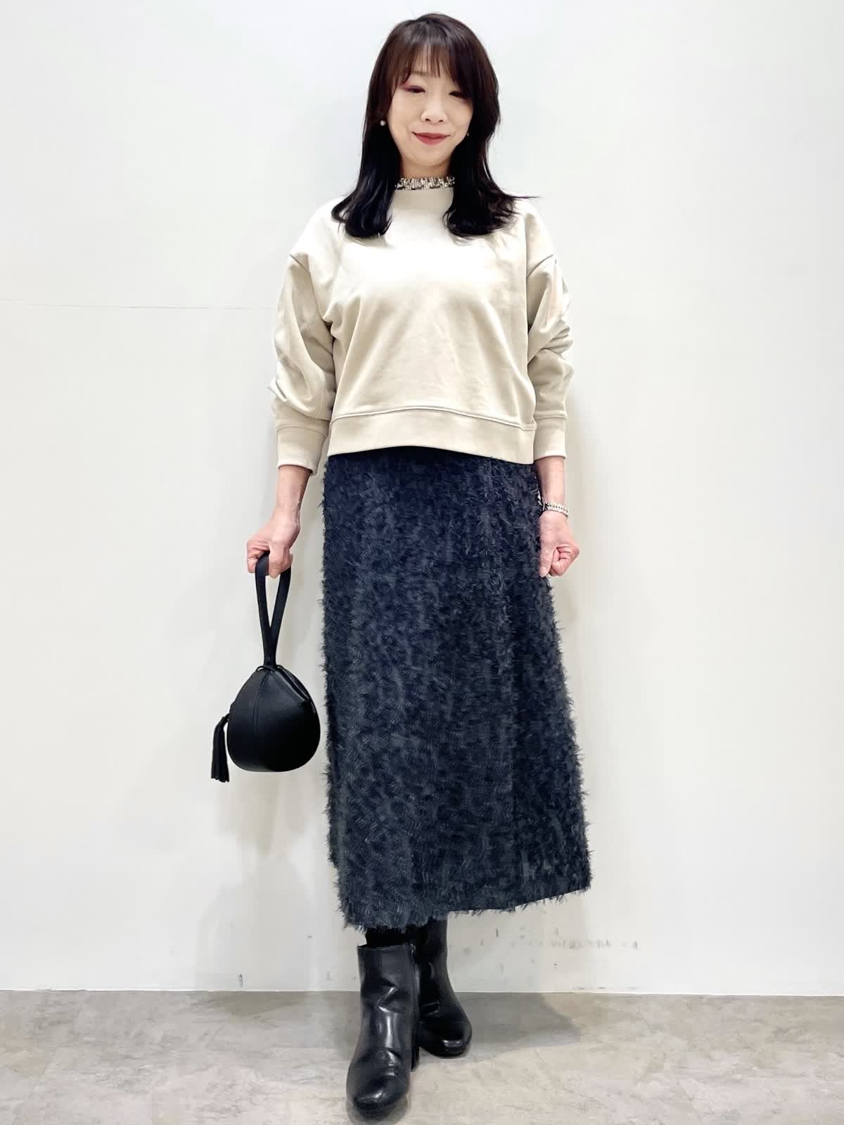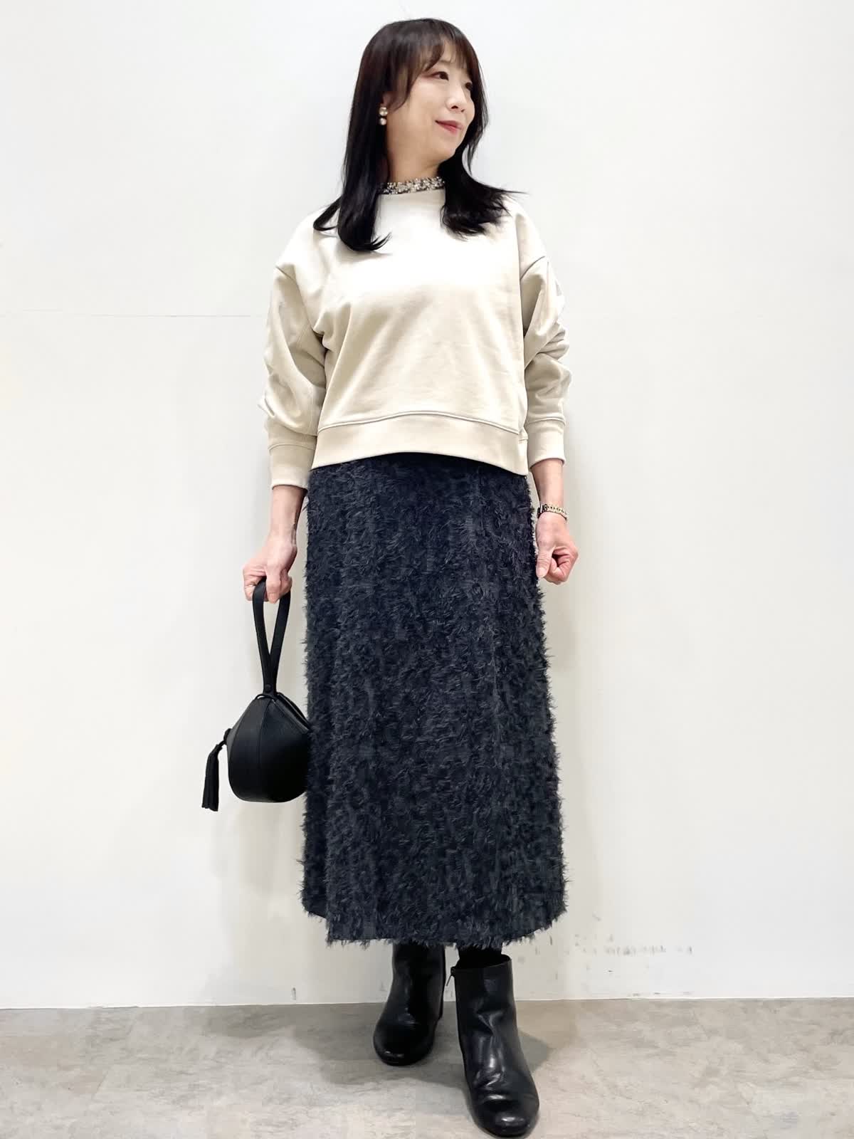 【着用サイズ】全て9号 【着用カラー】カットソー: グレーベージュ スカート:チャコールグレー 襟元のビジューがポイントのカットソー。しっかりと厚みのあるスポンディッシュな素材です。コンパクトな着丈でスカートやワイドパンツにぴったりです。ジャガードスカートは広がりすぎないシルエット。立体的な表面感がオシャレです。