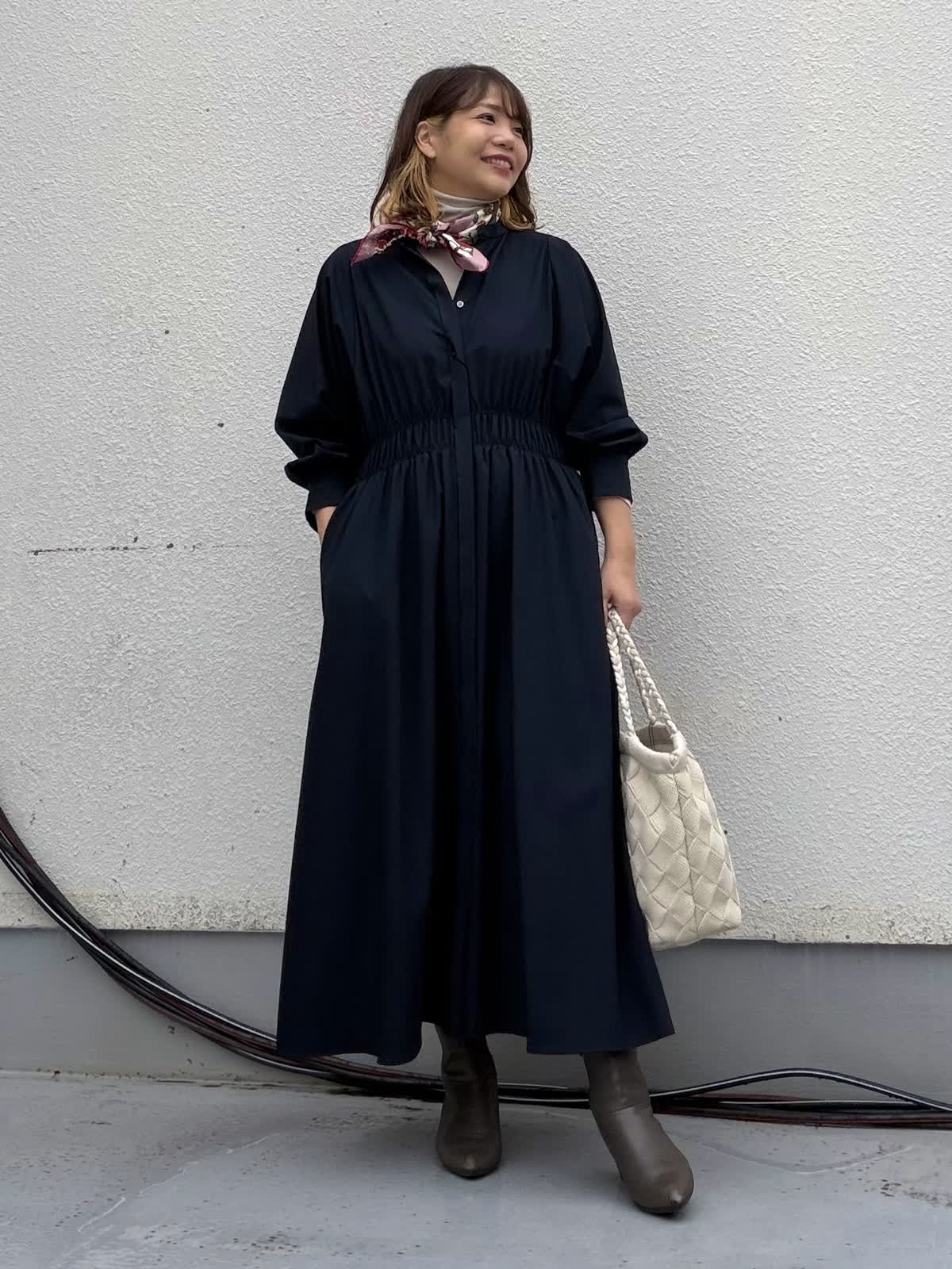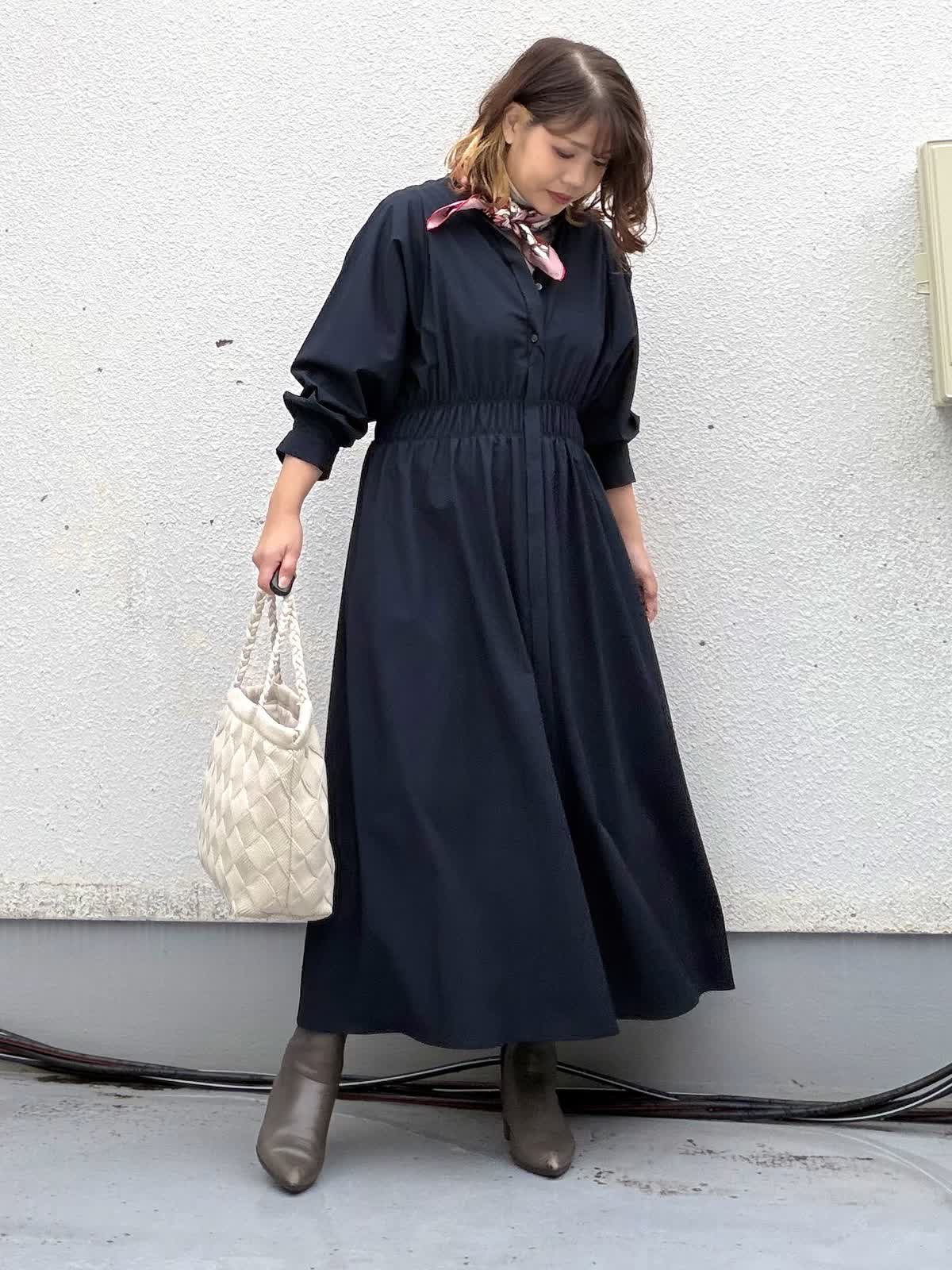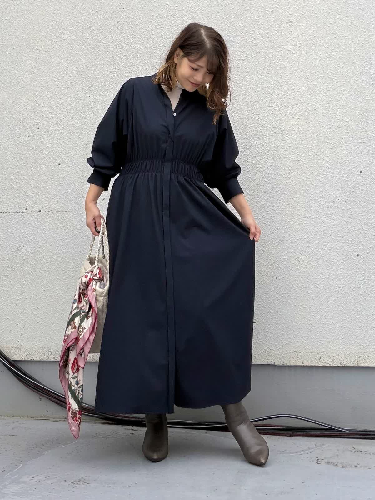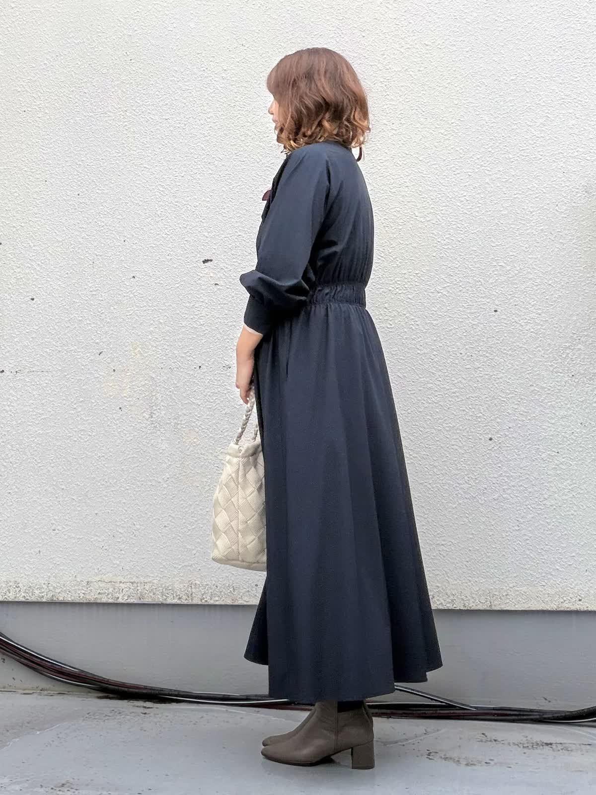 【着用アイテム:カラー/サイズ】 ワンピース:ネイビー/9号 カットソー:グレー/9号 程よい落ち感が美しいロングワンピースは、1枚でサマになる優秀アイテム。 ウエスト部分はさりげなくシェイプされており、締め付け感なく自然にスタイルアップが叶います。 インナーにはタートルネックを重ねることで、寒いシーズンにも着て頂けるアイテムとなっております。
