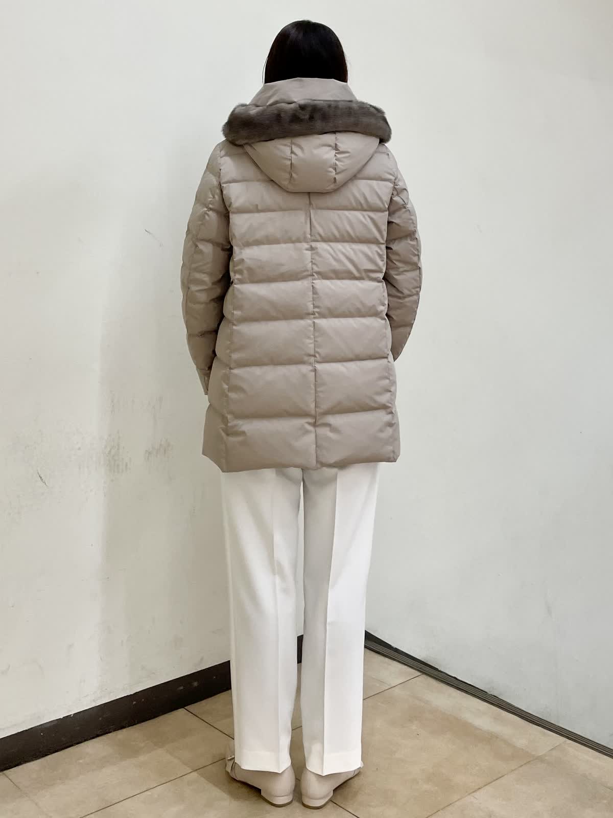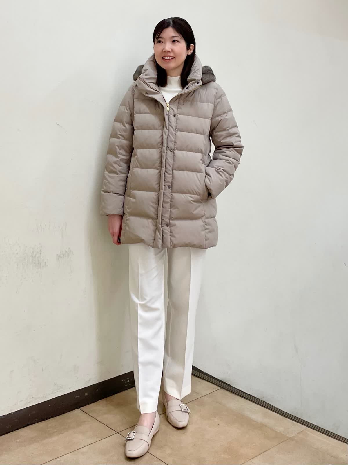 【着用サイズ】ダウン:9号 ニット:フリー パンツ:9号? コンパクトなサイズ感のダウン。細身なのでインナーは薄手がおすすめです。フード・ファーは取り外し可能。袖口も風が入ってこないよう内側にゴムが入ってます。ポケットもあたたかい素材になっているのが嬉しいポイントです。