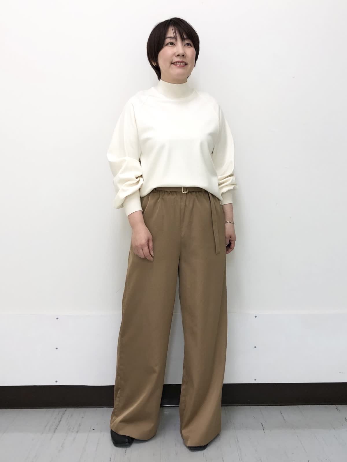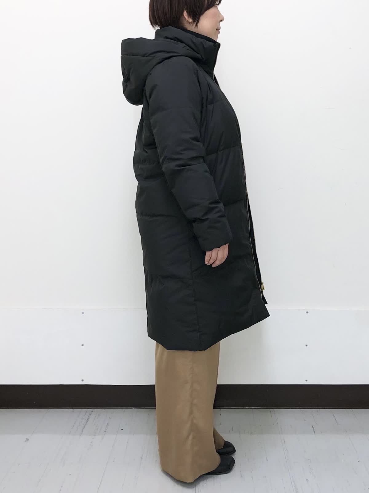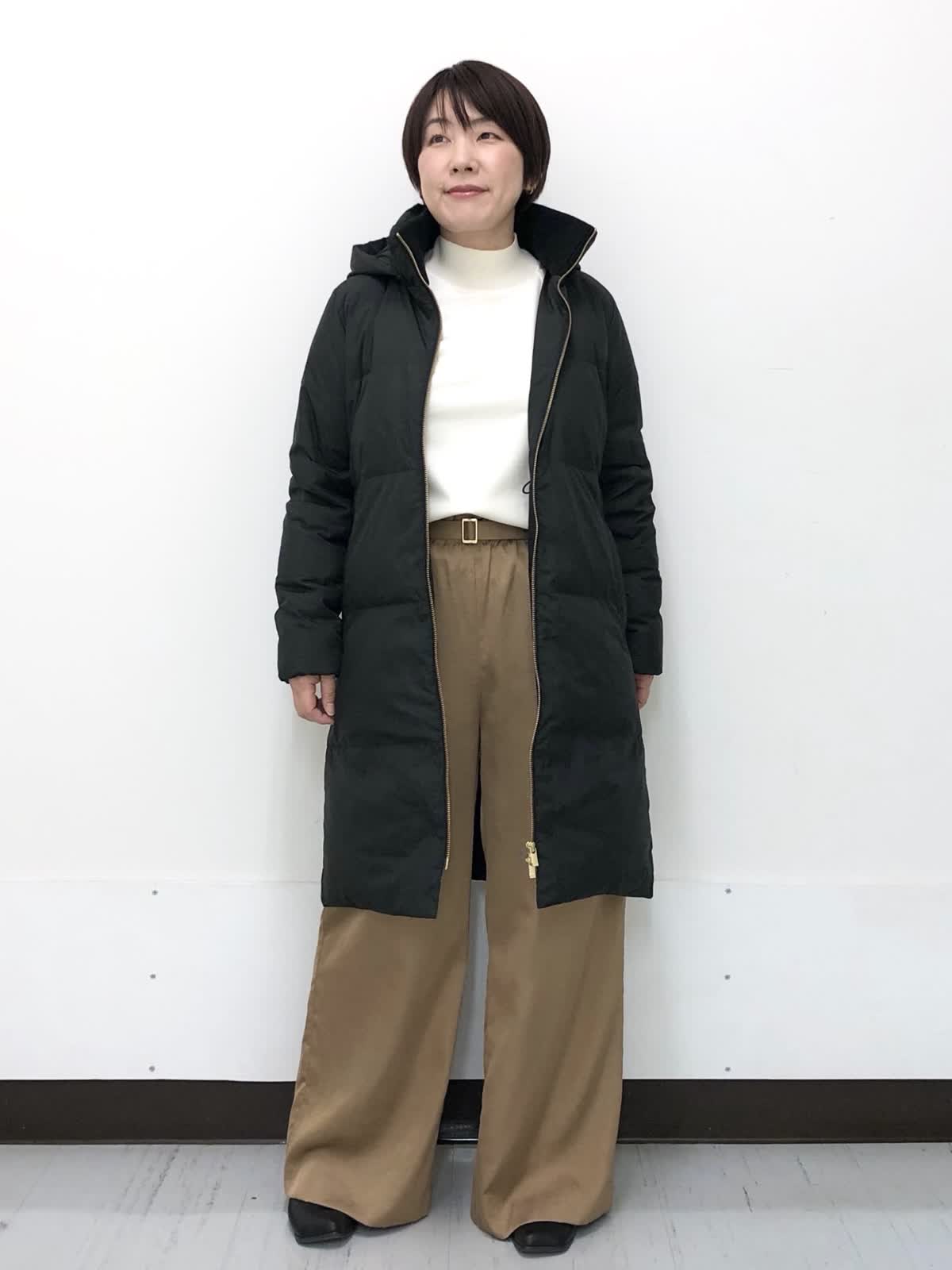 【着用サイズ】すべて9号【着用カラー】コート:ブラック ニット:アイボリー パンツ:モカチャ 休日お出かけスタイリング。この時期に欠かせない「ダウンコート」。襟元のリブと見せファスナーがアクセント。膝上まですっぽり覆って寒さから守ってくれるので休日のレジャーにもおすすめです。