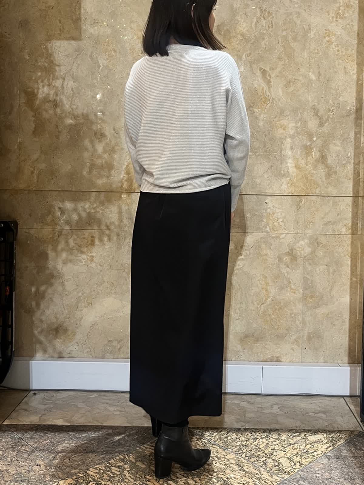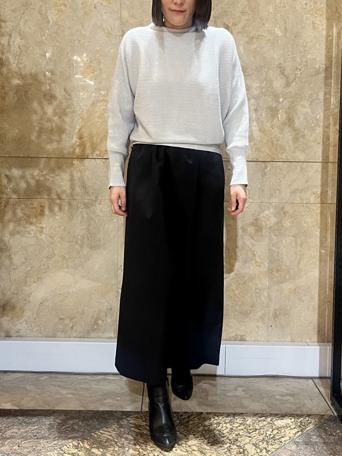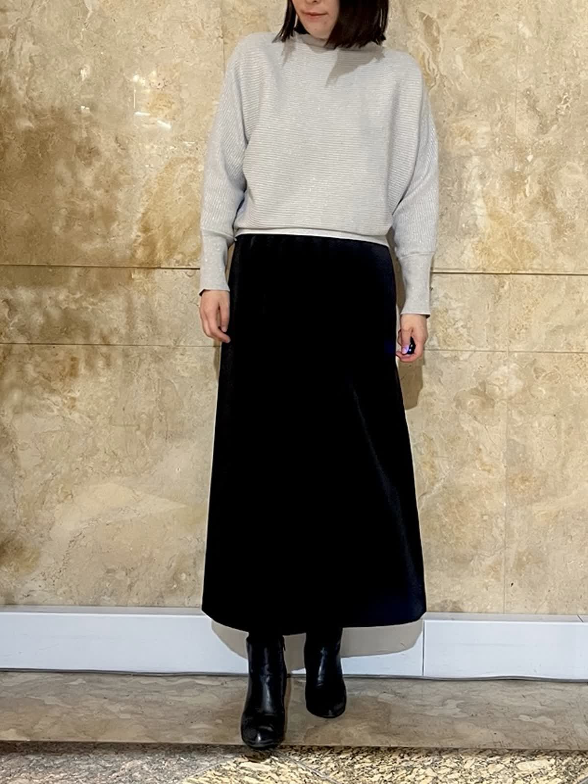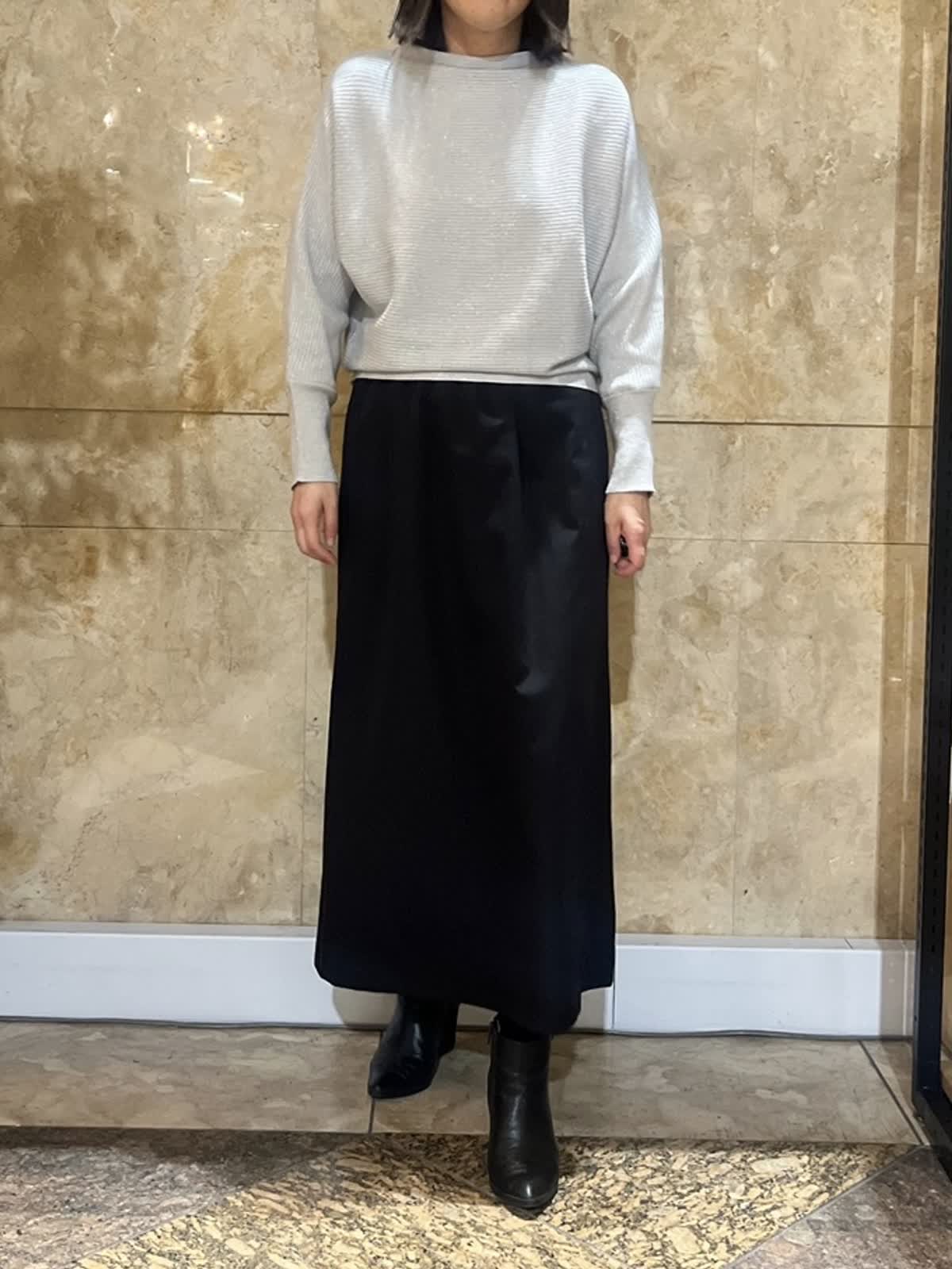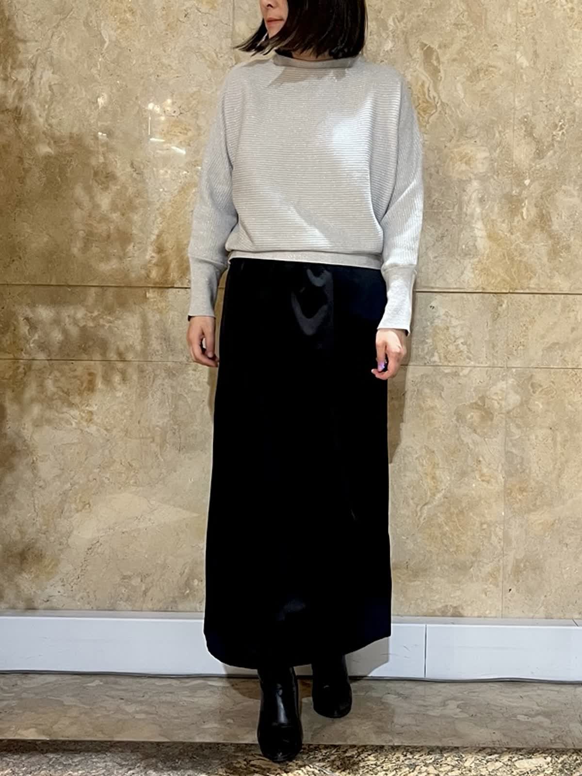 【着用サイズ/カラー】ニット:フリーサイズ/グレー スカート:9号/ブラック 上品なラメニットは、ほどよい厚みと落ち感があり、身体のラインを拾いにくい一枚です。首元は詰まりすぎず、顔まわりをすっきりと見せてくれるデザイン。 ベーシックスカートと合わせることで、縦のラインがスッキリ。落ち着きのある大人のスタイリングに仕上がります。 春まで気兼ねなくご利用していただけます。