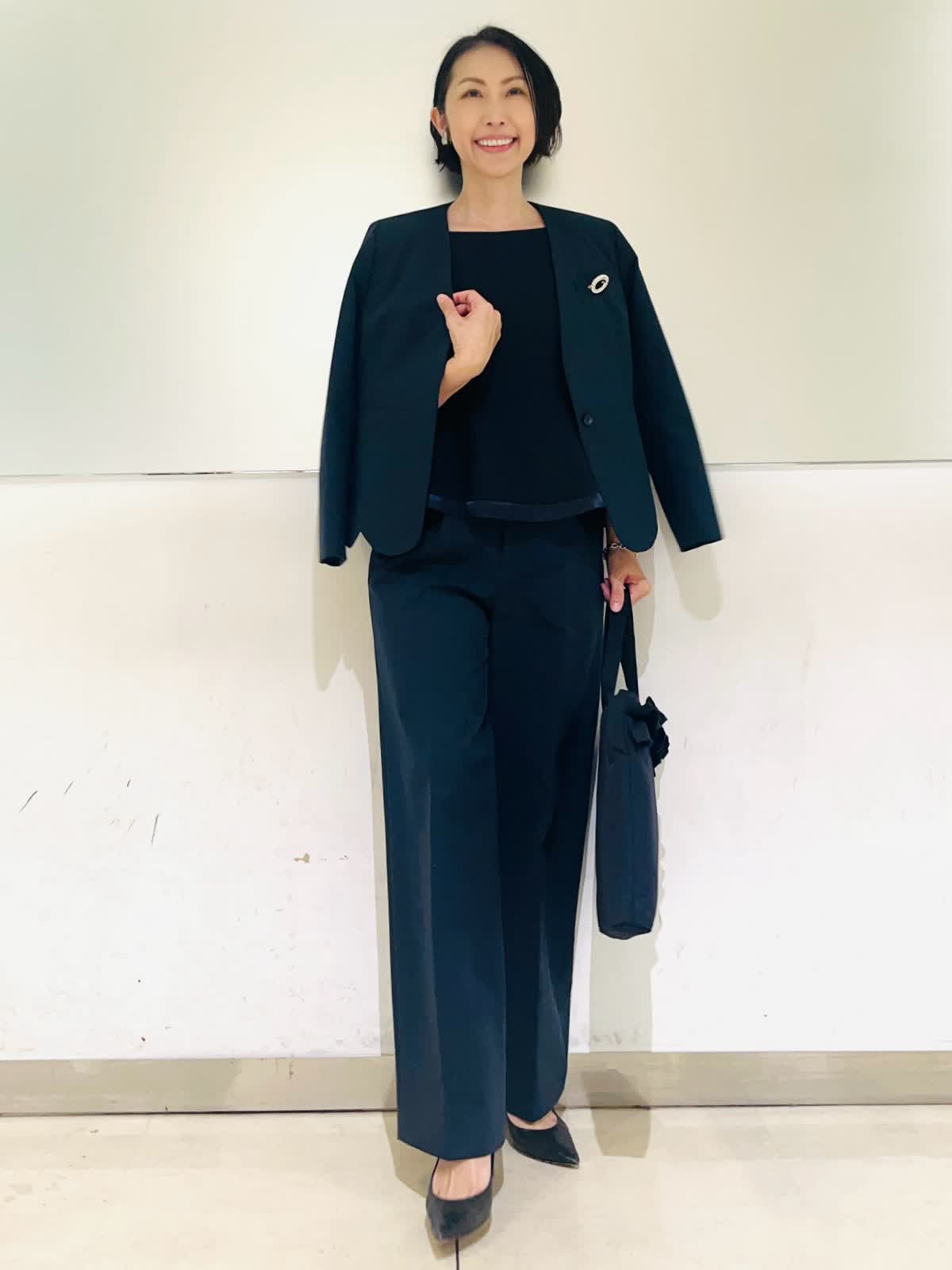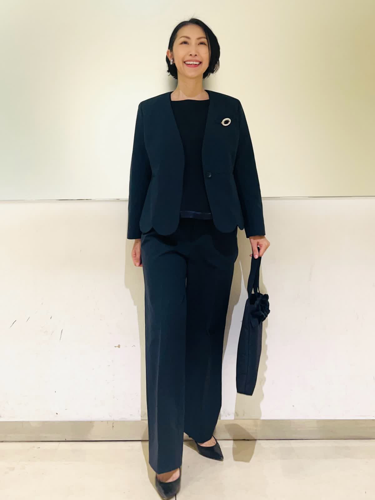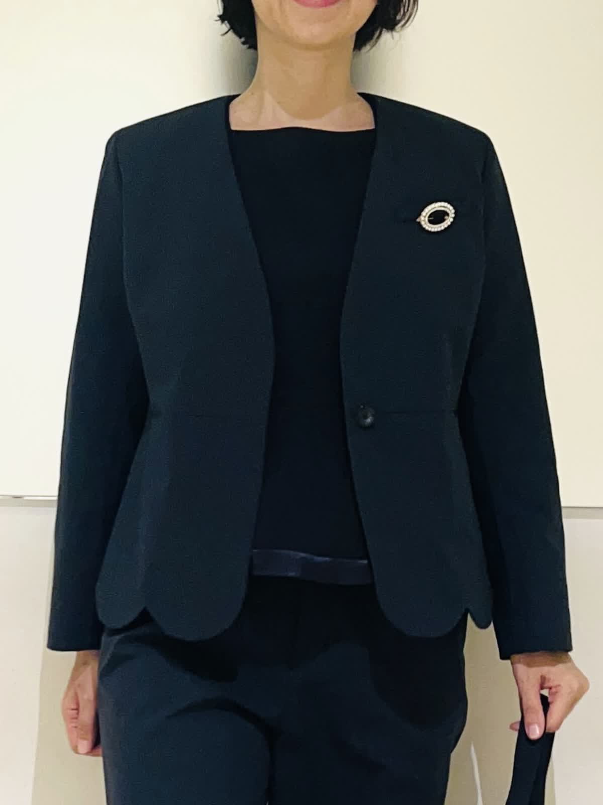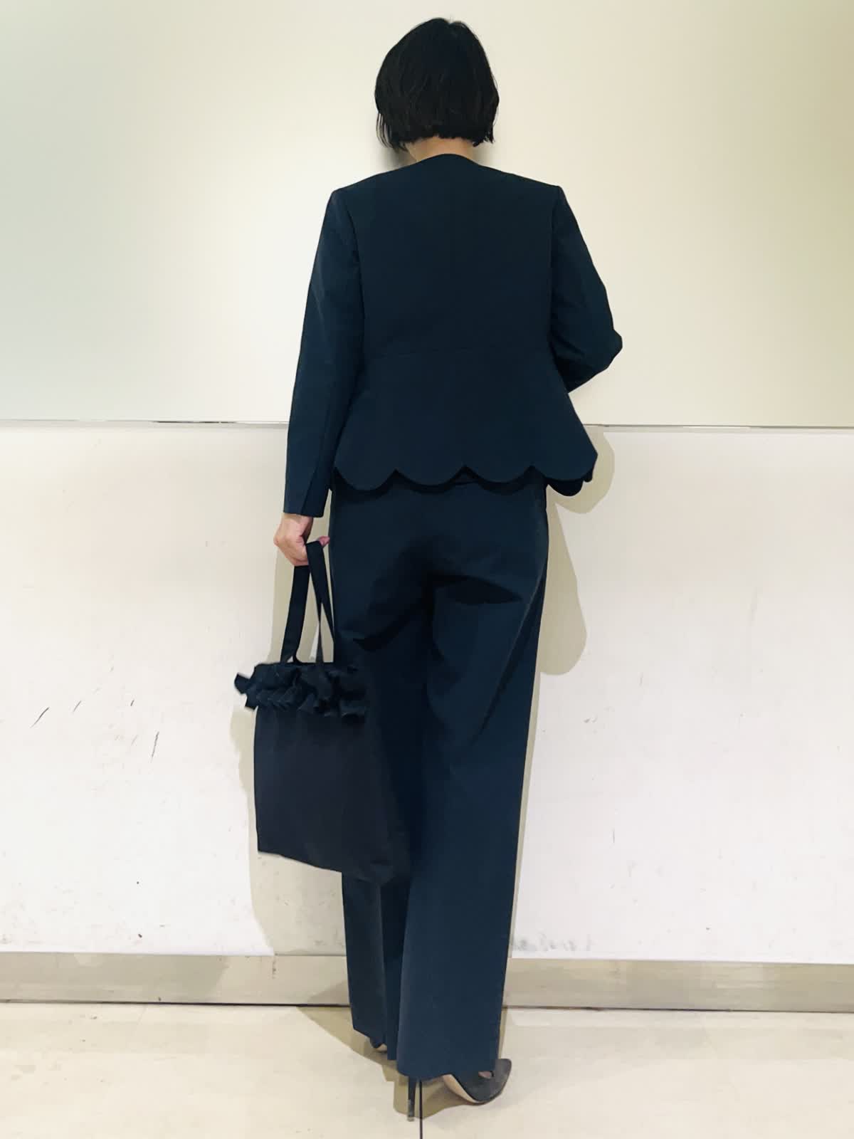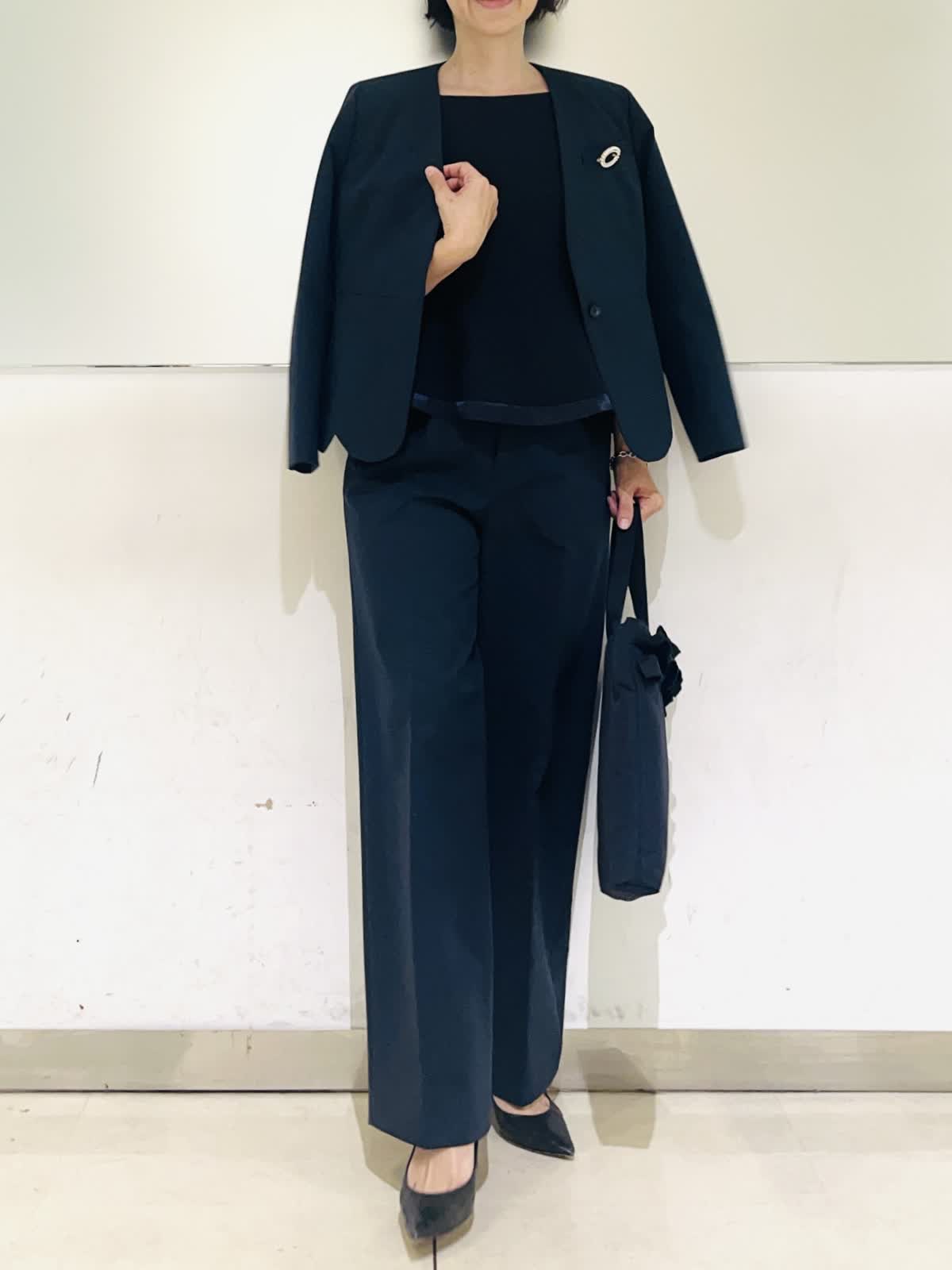 【着用アイテム/カラー】ジャケット、ブラウス、パンツ:9号/ネイビー お仕事からセレモニーまでマルチに使えるパーフェクトスーツ。カラーレスのジャケットは裾のペプラムラインが可愛いデザイン。ハンサムな印象の中にちょっとした可愛らしさがあります。軽い着心地で動きやすく、ご自宅で洗えるのも嬉しいポイント。ジャケットを脱いで学校行事習い事の送り迎えにもおすすめです。