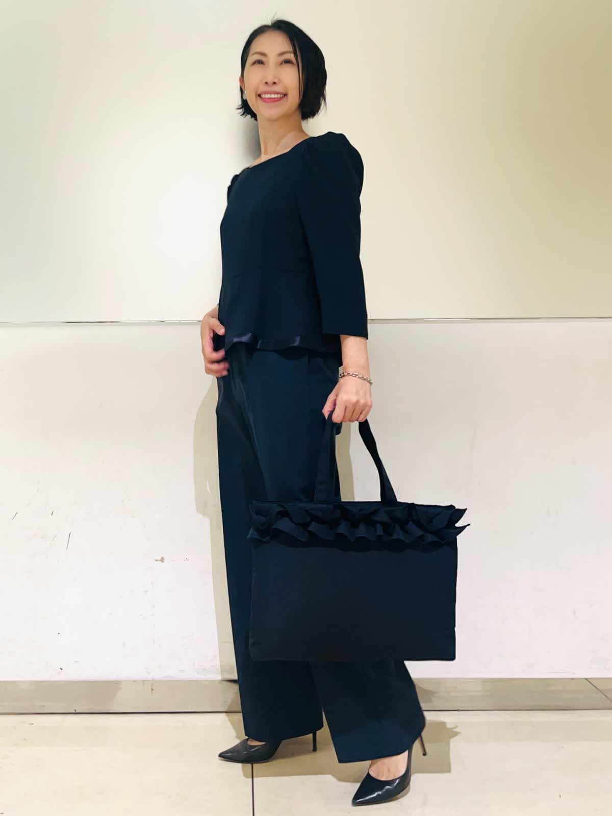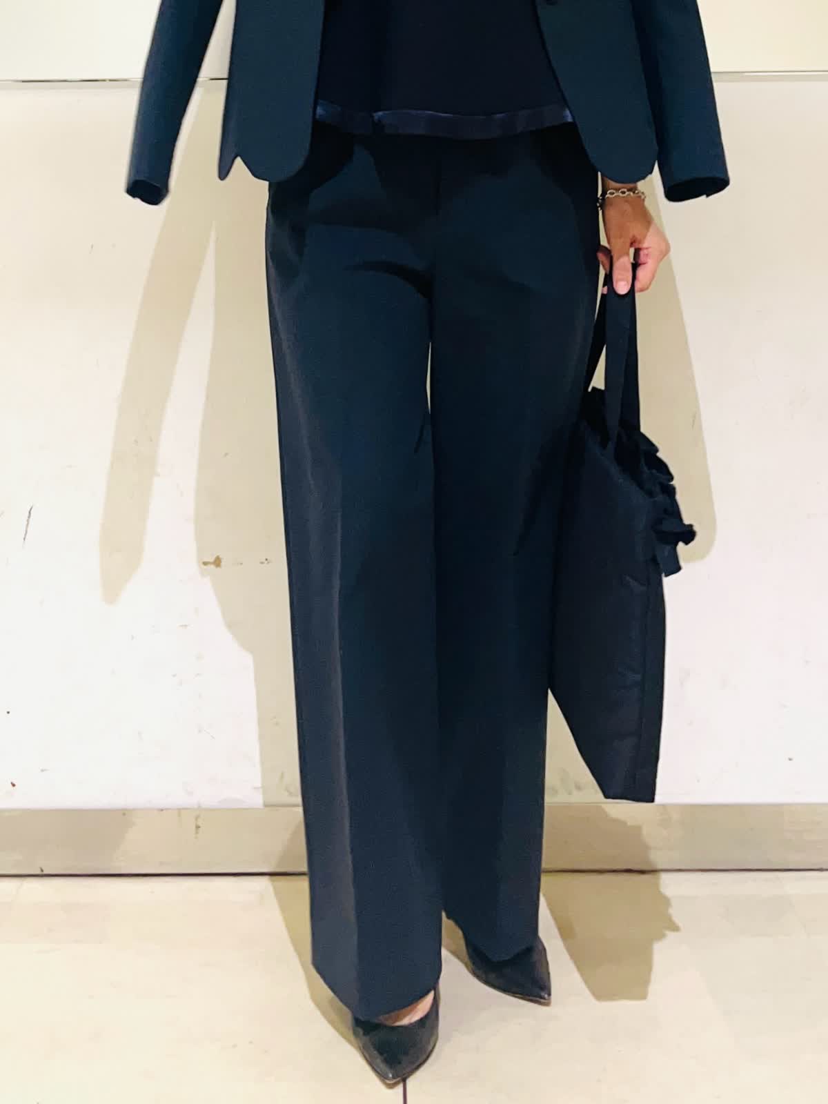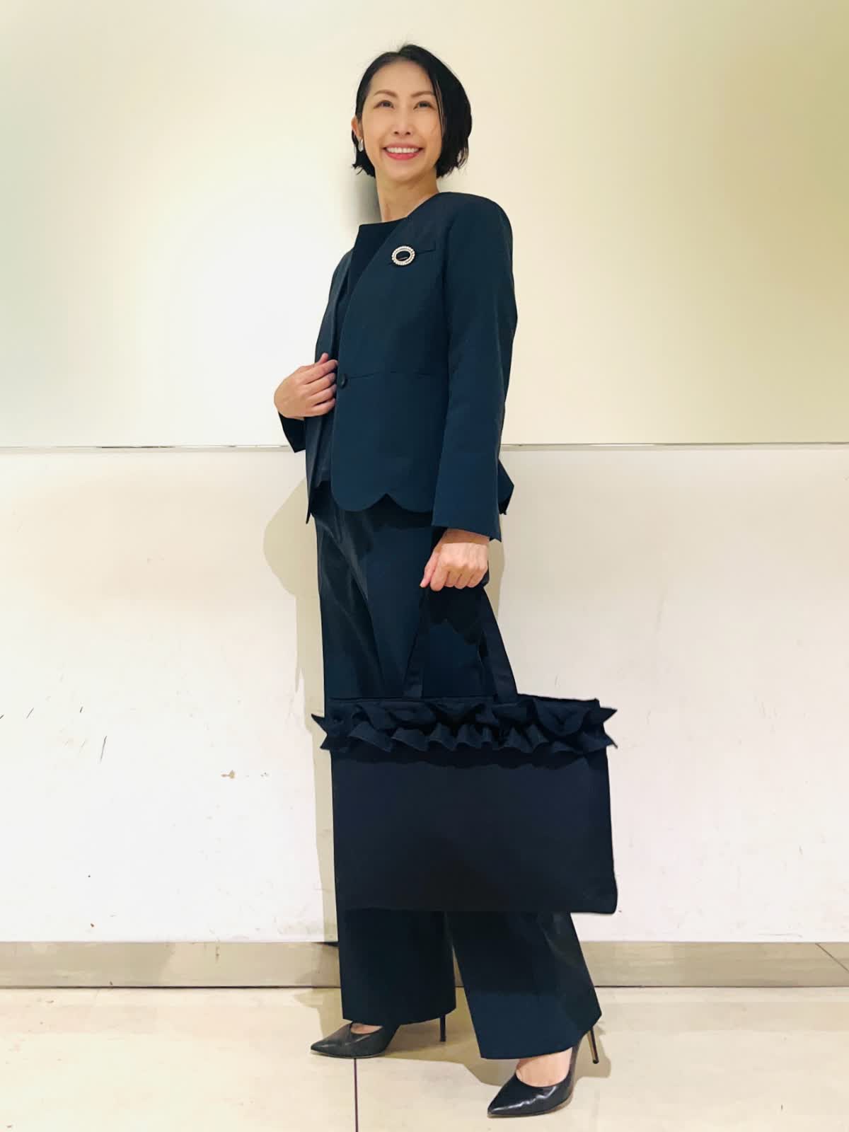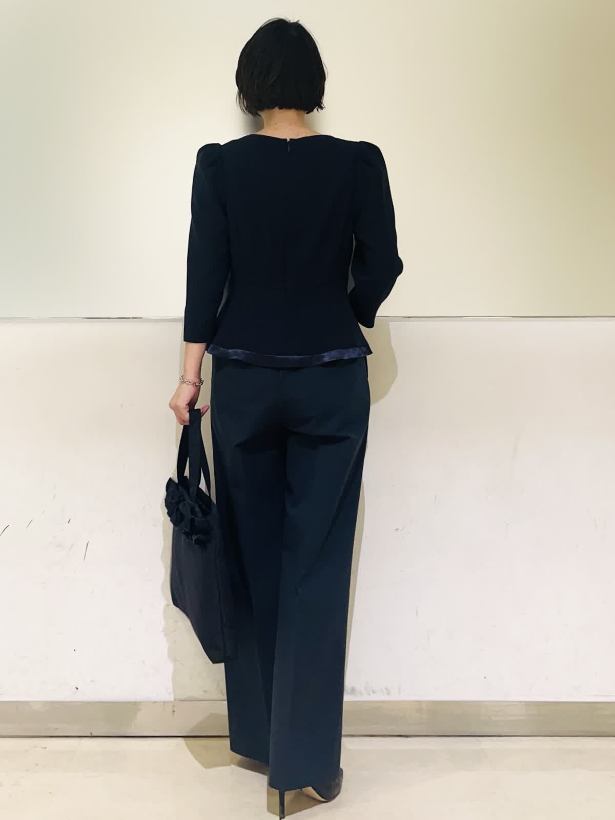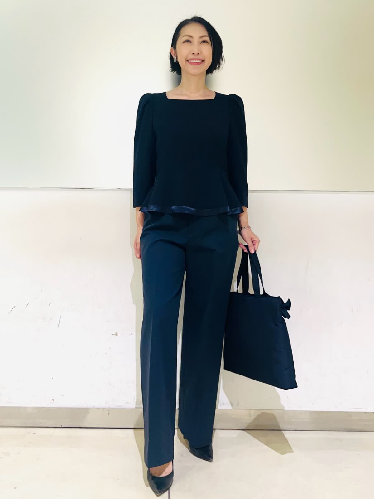 【着用アイテム/カラー】ジャケット、ブラウス、パンツ:9号/ネイビー お仕事からセレモニーまでマルチに使えるパーフェクトスーツ。カラーレスのジャケットは裾のペプラムラインが可愛いデザイン。ハンサムな印象の中にちょっとした可愛らしさがあります。軽い着心地で動きやすく、ご自宅で洗えるのも嬉しいポイント。ジャケットを脱いで学校行事習い事の送り迎えにもおすすめです。