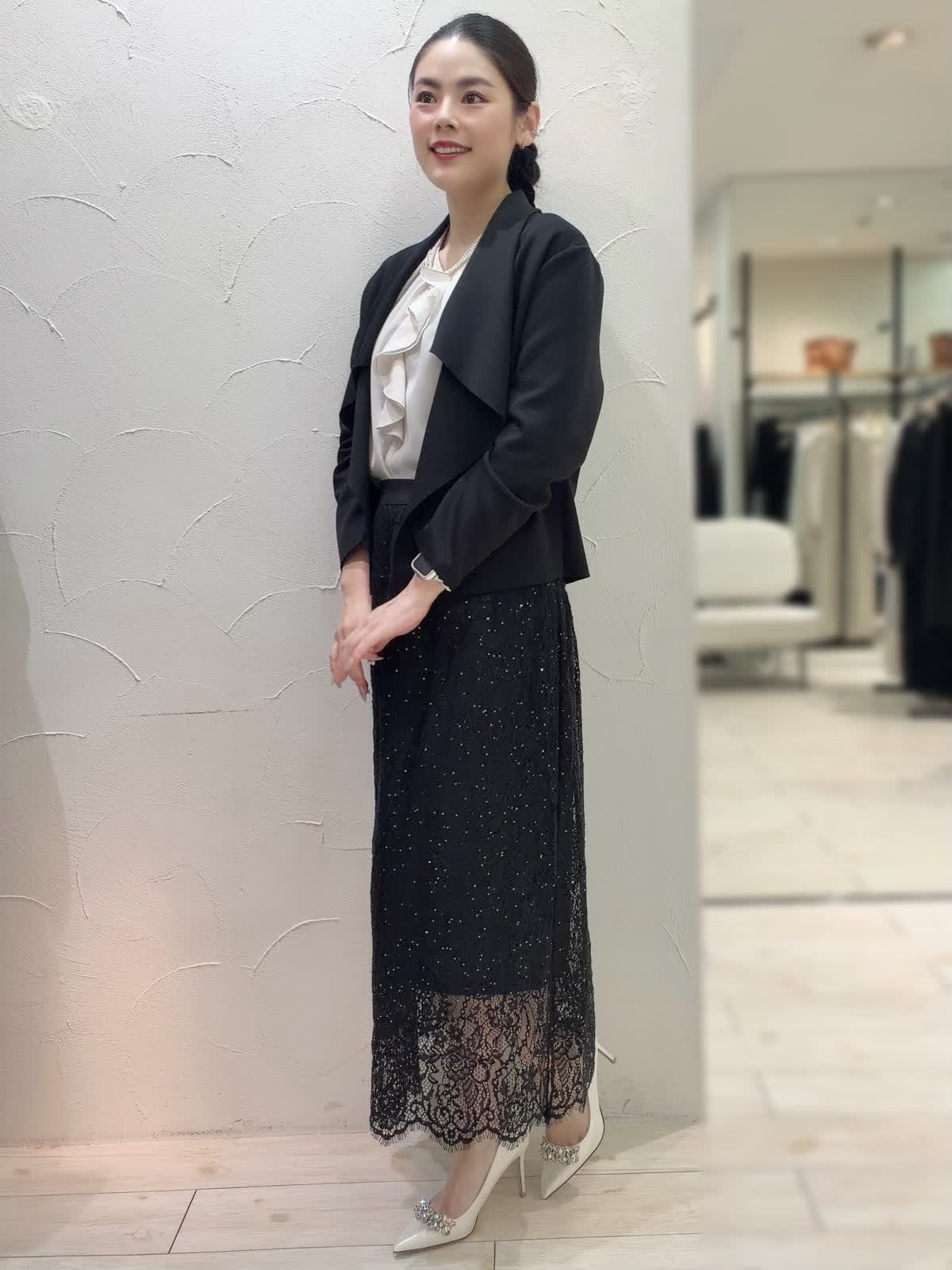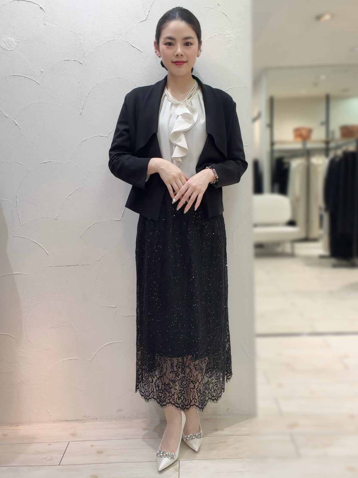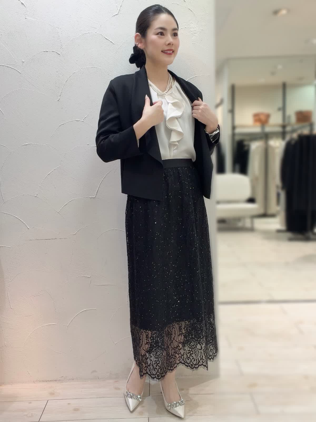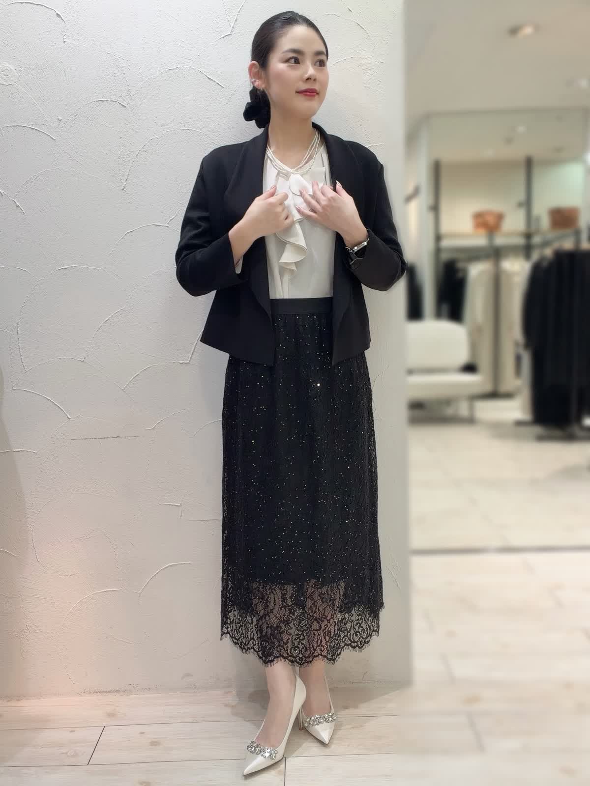 【着用サイズ】全て9号 【着用カラー】ジャケット:ブラック ブラウス:アイボリー スカート:ブラック ネックレス:パール お呼ばれスタイリング。華やかなレーススカートが上品な印象のセレモニースタイル。ショート丈のジャケットでスッキリとスタイルアップが叶います。やわらかな印象のブラウスを合わせて女性らしい雰囲気に。