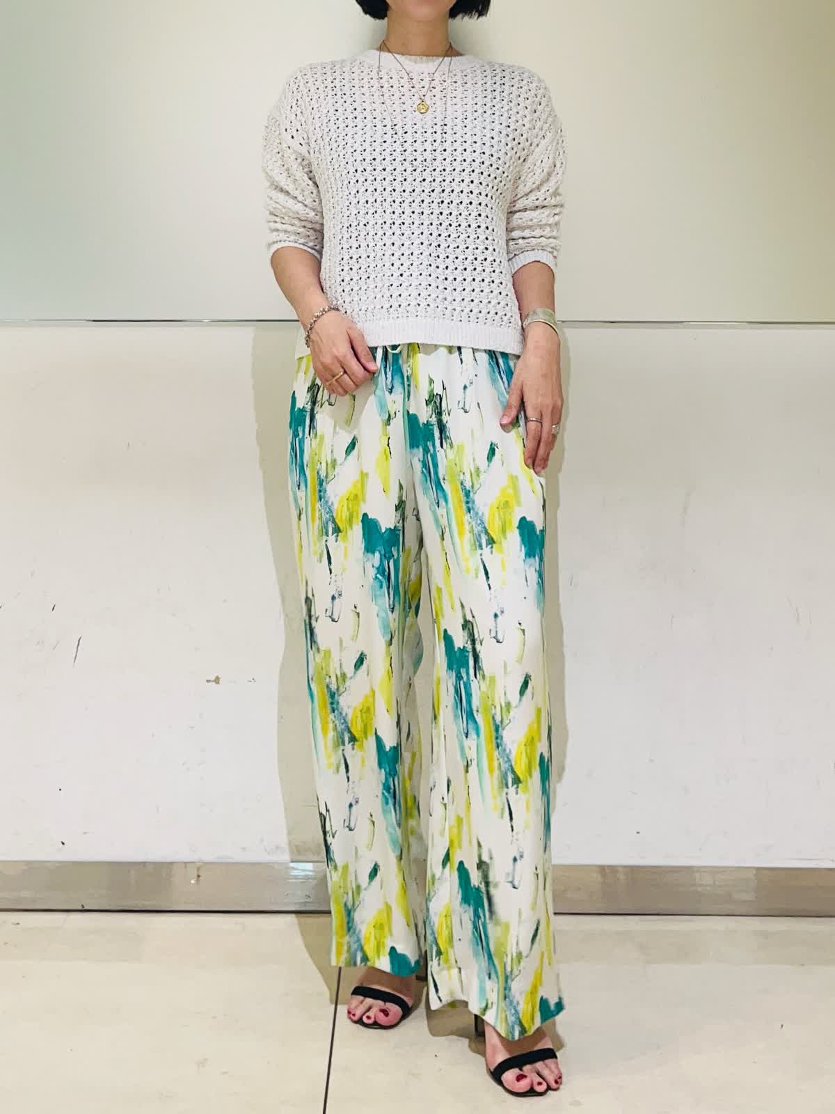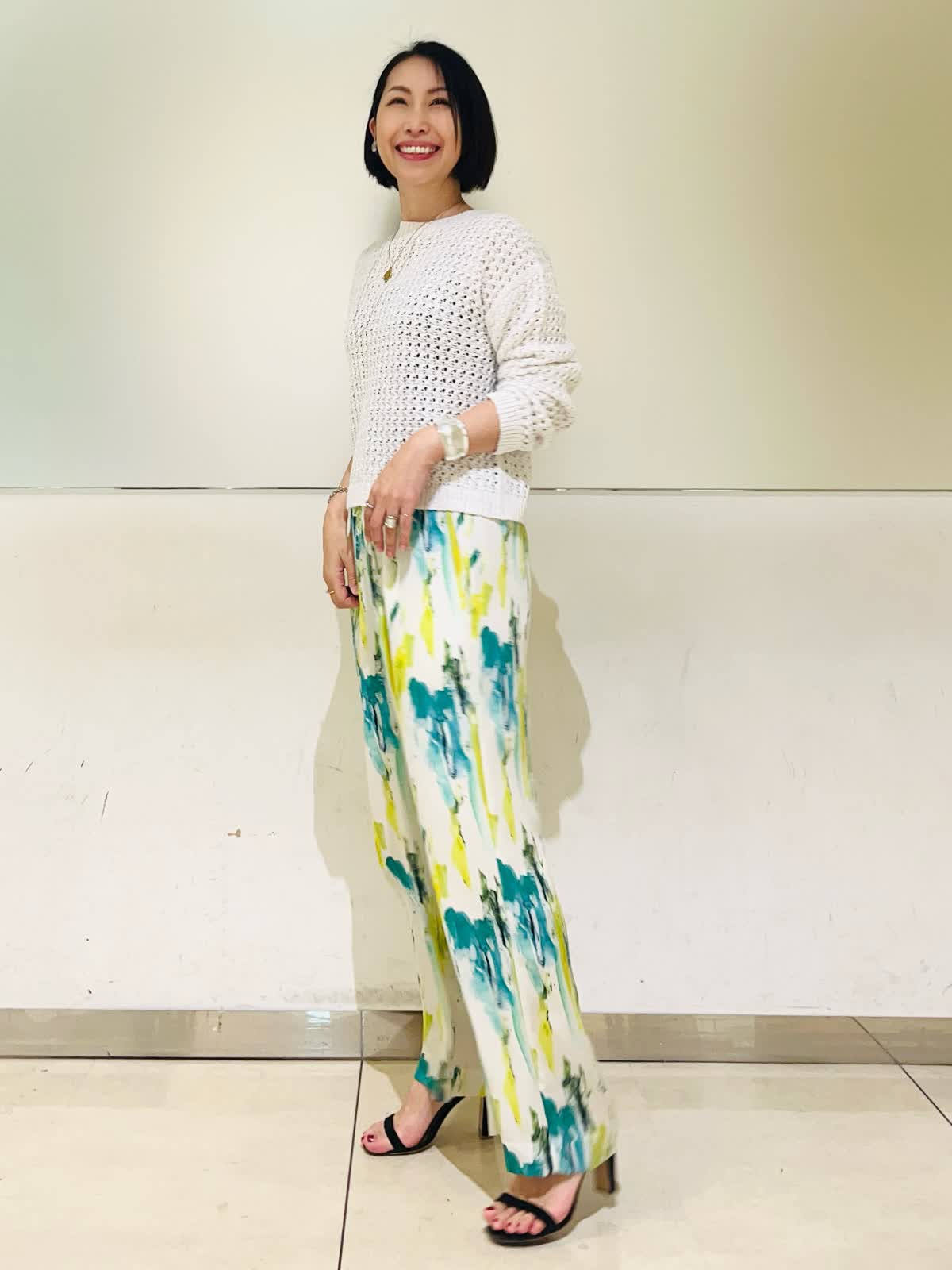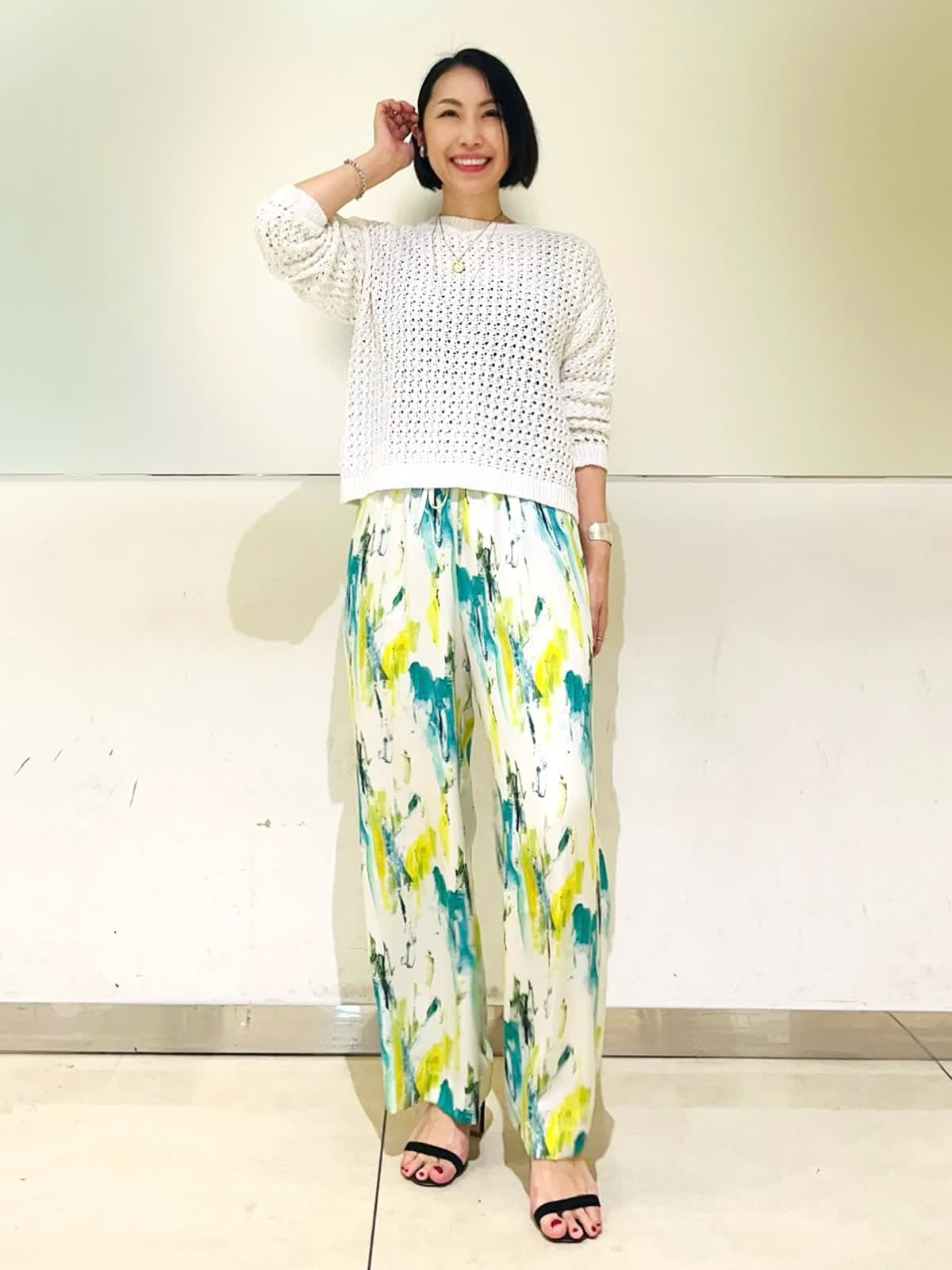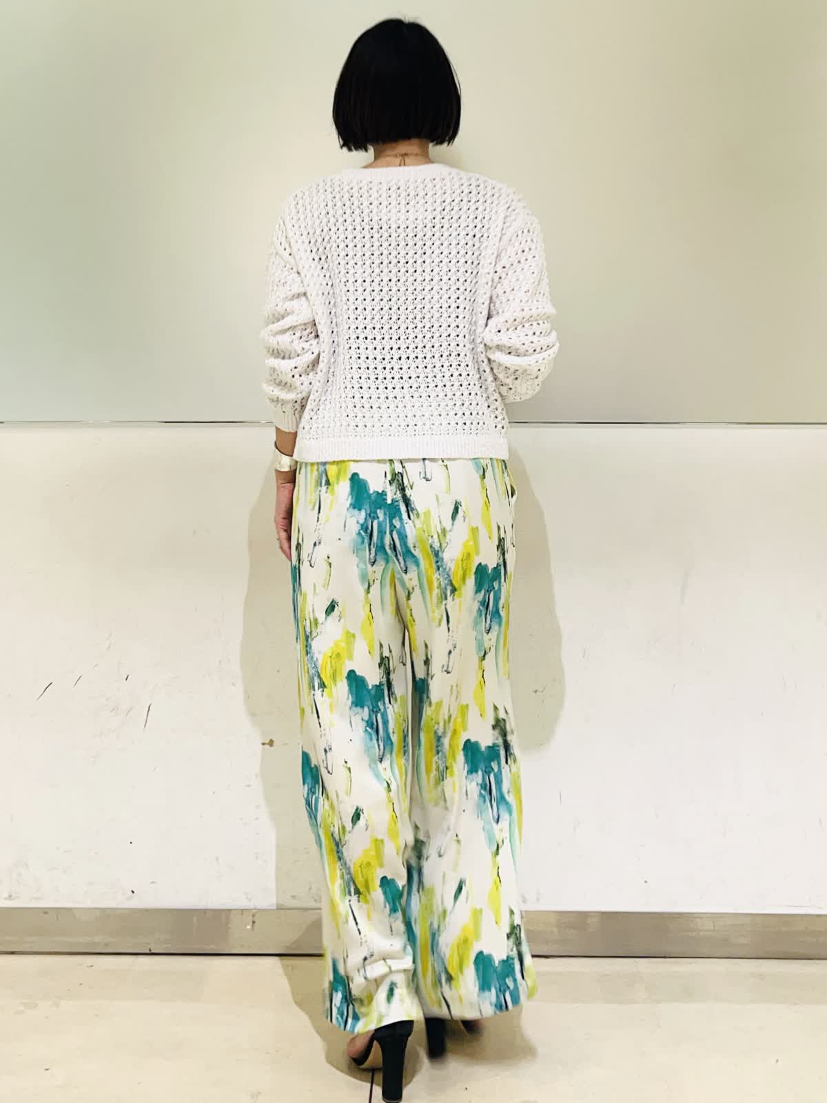 【着用アイテム】すべて9号 【着用カラー】ニット:.オフホワイト パンツ:ペパーミント 春になると着たくなるプリントパンツ。白地にイエローとグリーンの柄が鮮やかで目をひくパンツ。テロッとした落ち感のある素材で、ウエストがドロスト仕様なのでストレスフリーな履き心地。パンツの柄がひき立つようにトップスはあえて白のニットを合わせました。キラキラ光るスパンコールが心ときめくニットです。