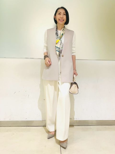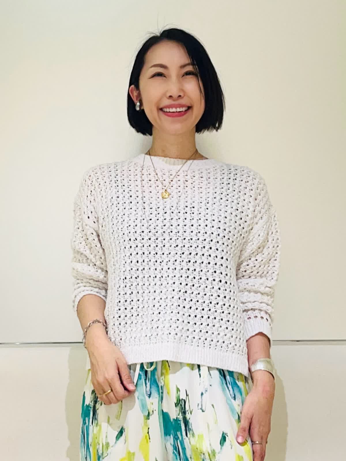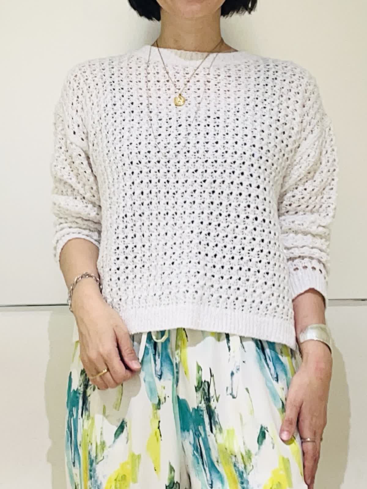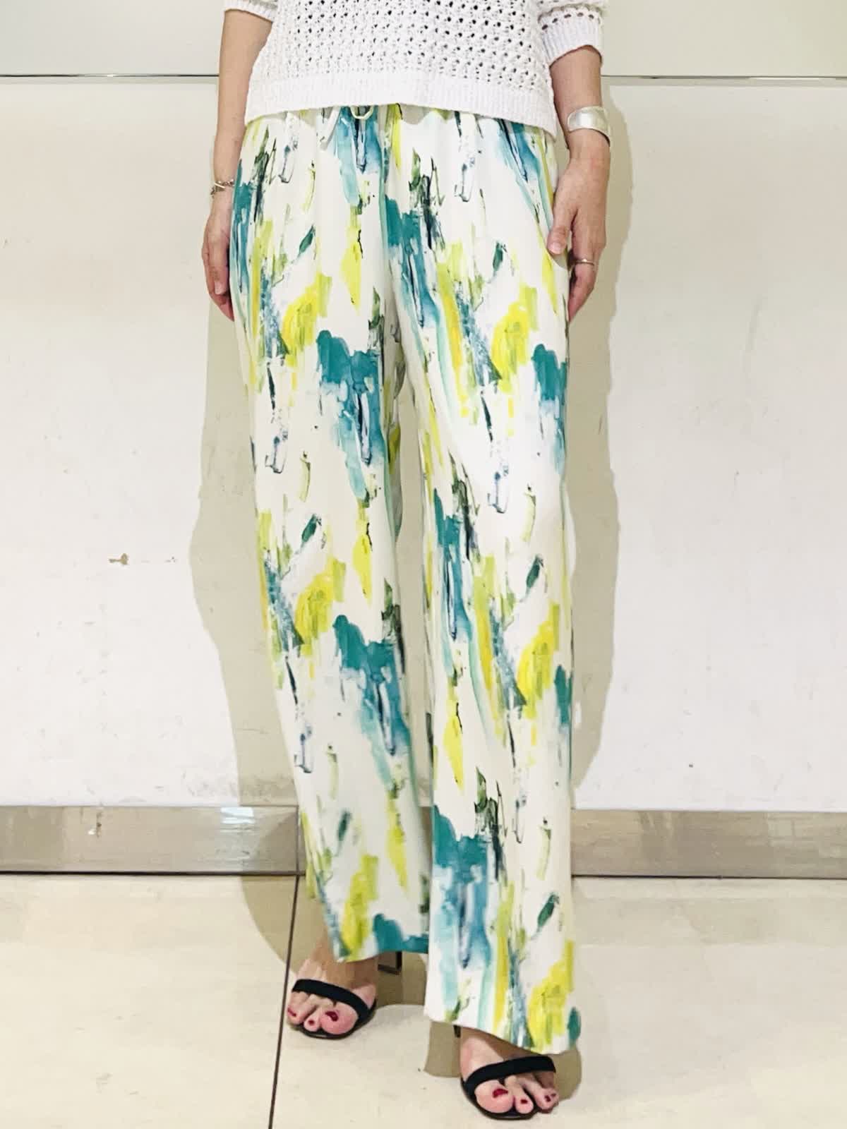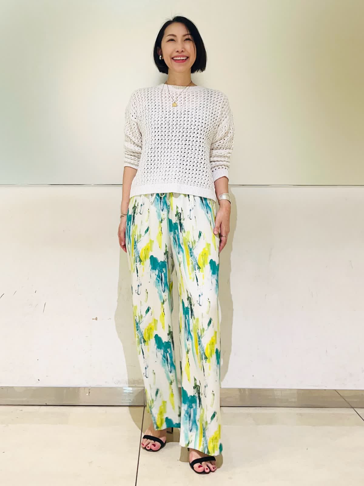 【着用アイテム】すべて9号 【着用カラー】ニット:.オフホワイト パンツ:ペパーミント 春になると着たくなるプリントパンツ。白地にイエローとグリーンの柄が鮮やかで目をひくパンツ。テロッとした落ち感のある素材で、ウエストがドロスト仕様なのでストレスフリーな履き心地。パンツの柄がひき立つようにトップスはあえて白のニットを合わせました。キラキラ光るスパンコールが心ときめくニットです。