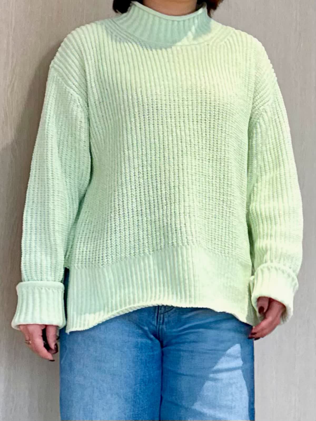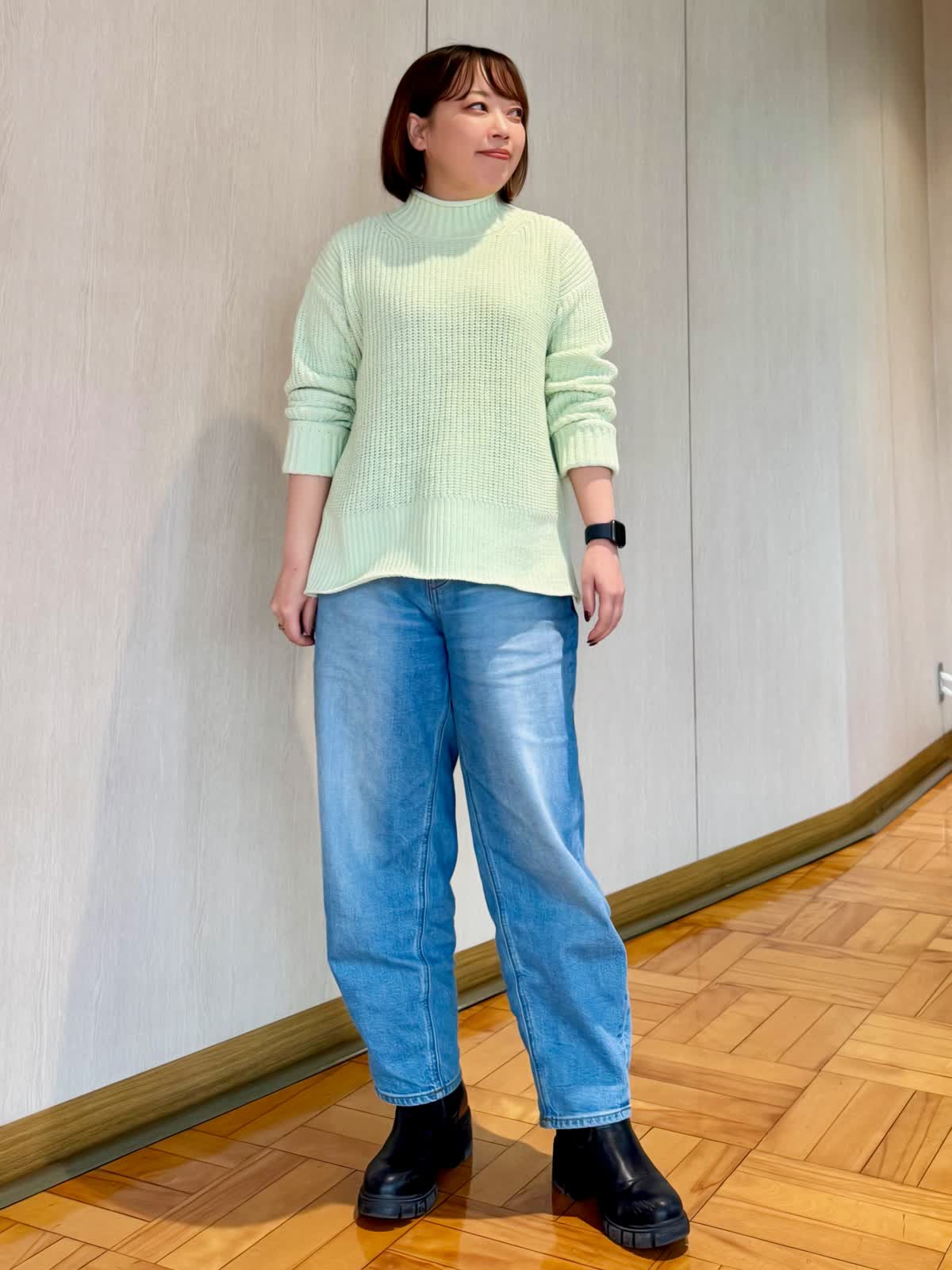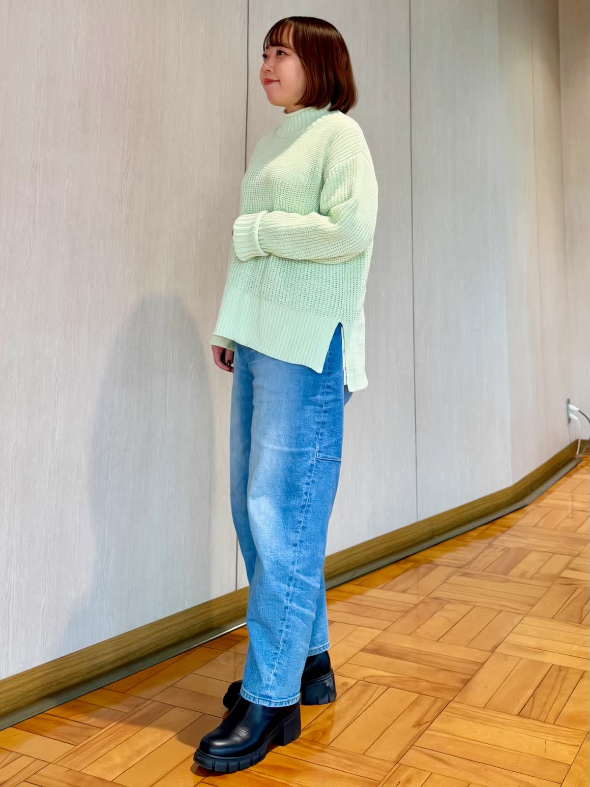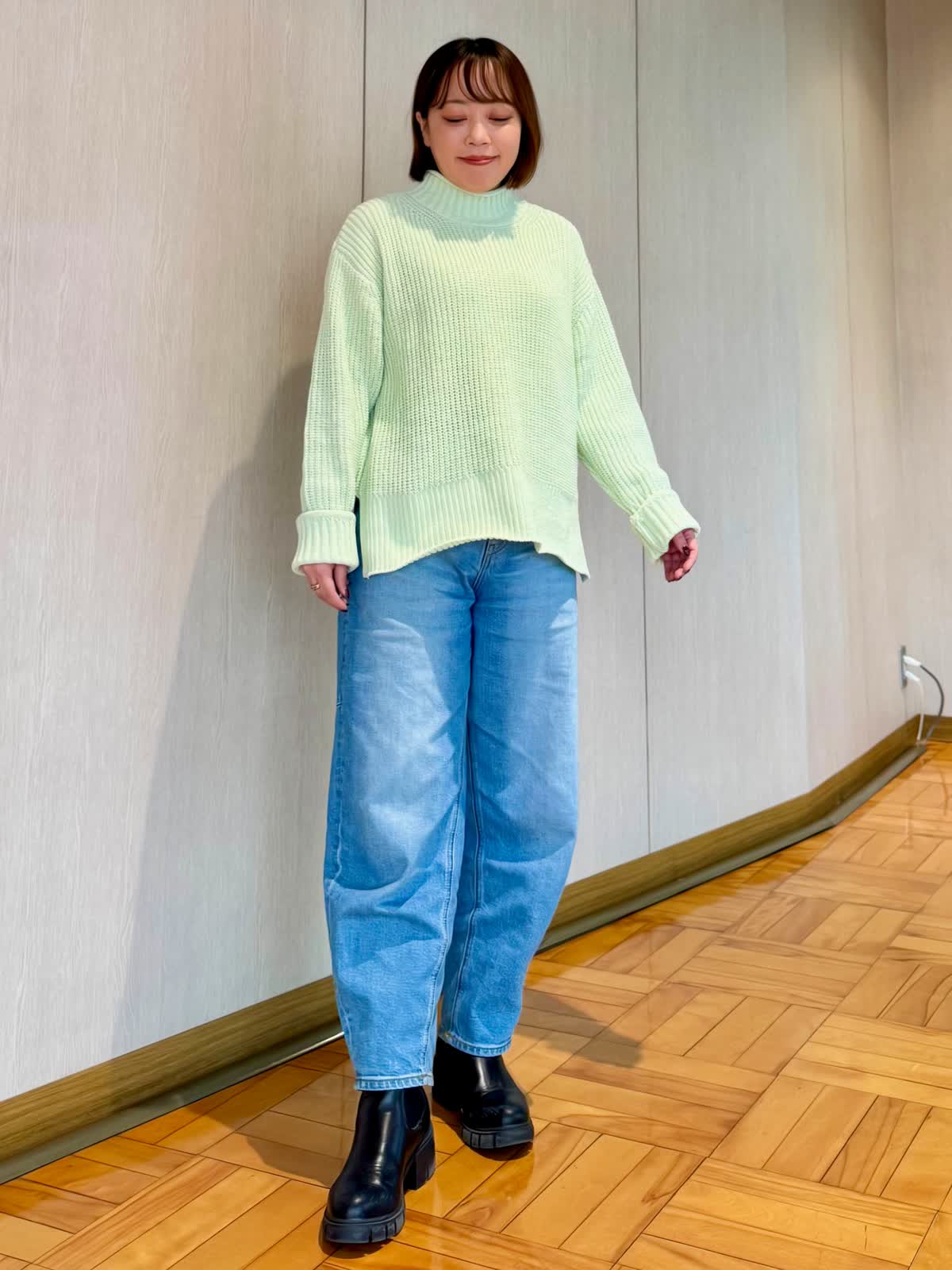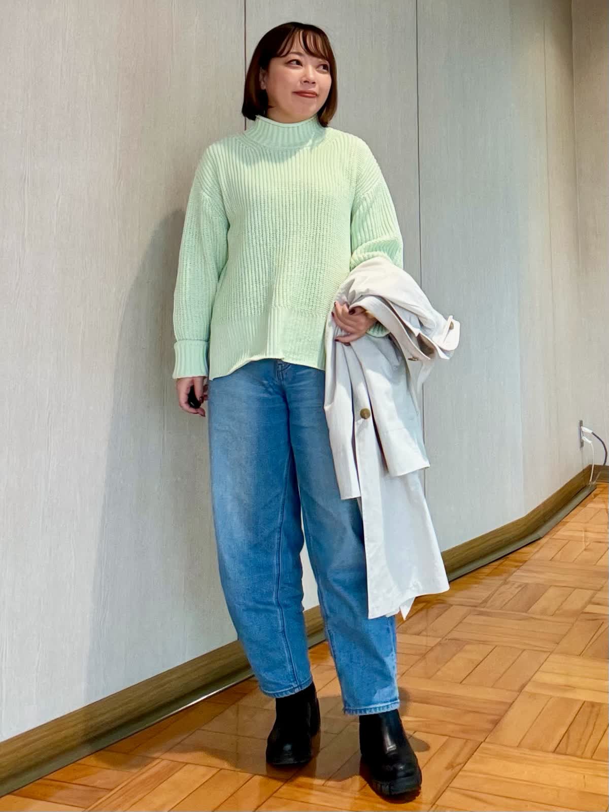 【着用カラー/サイズ】 ニット:キミドリ/フリー パンツ:ブルー/7号 コート:アイボリー/フリー 春まで着られるニットスタイル。 綺麗なカラーとラメ系が入った生地の洗えるニット。ざっくりデザインなのでボディラインも拾いにくいです!