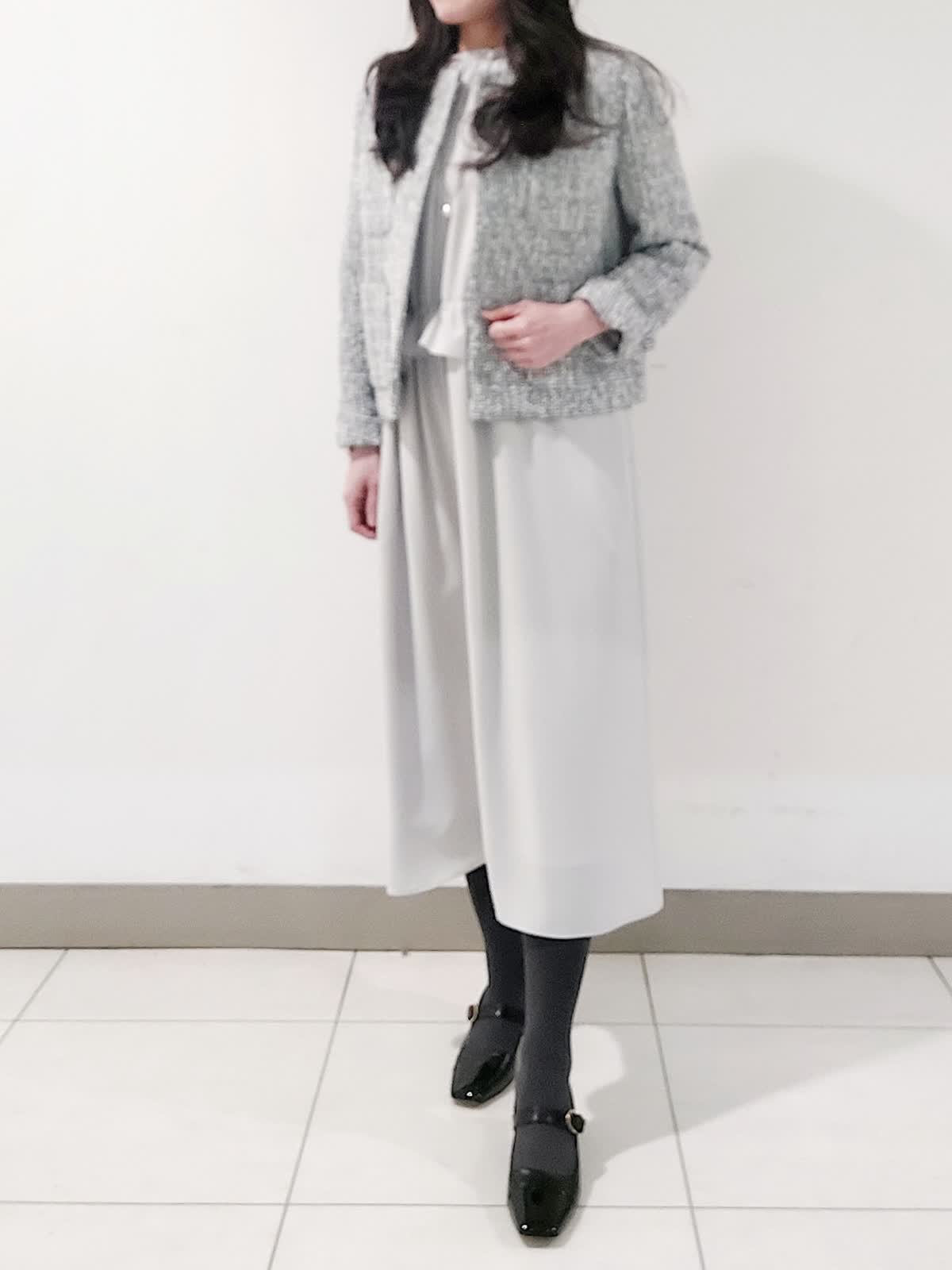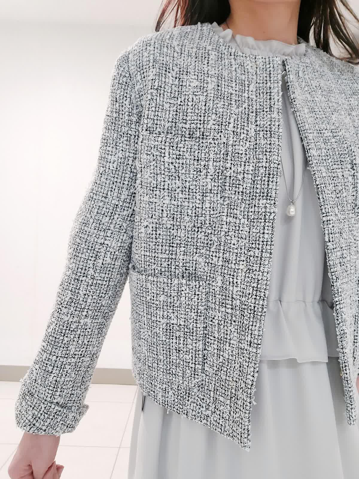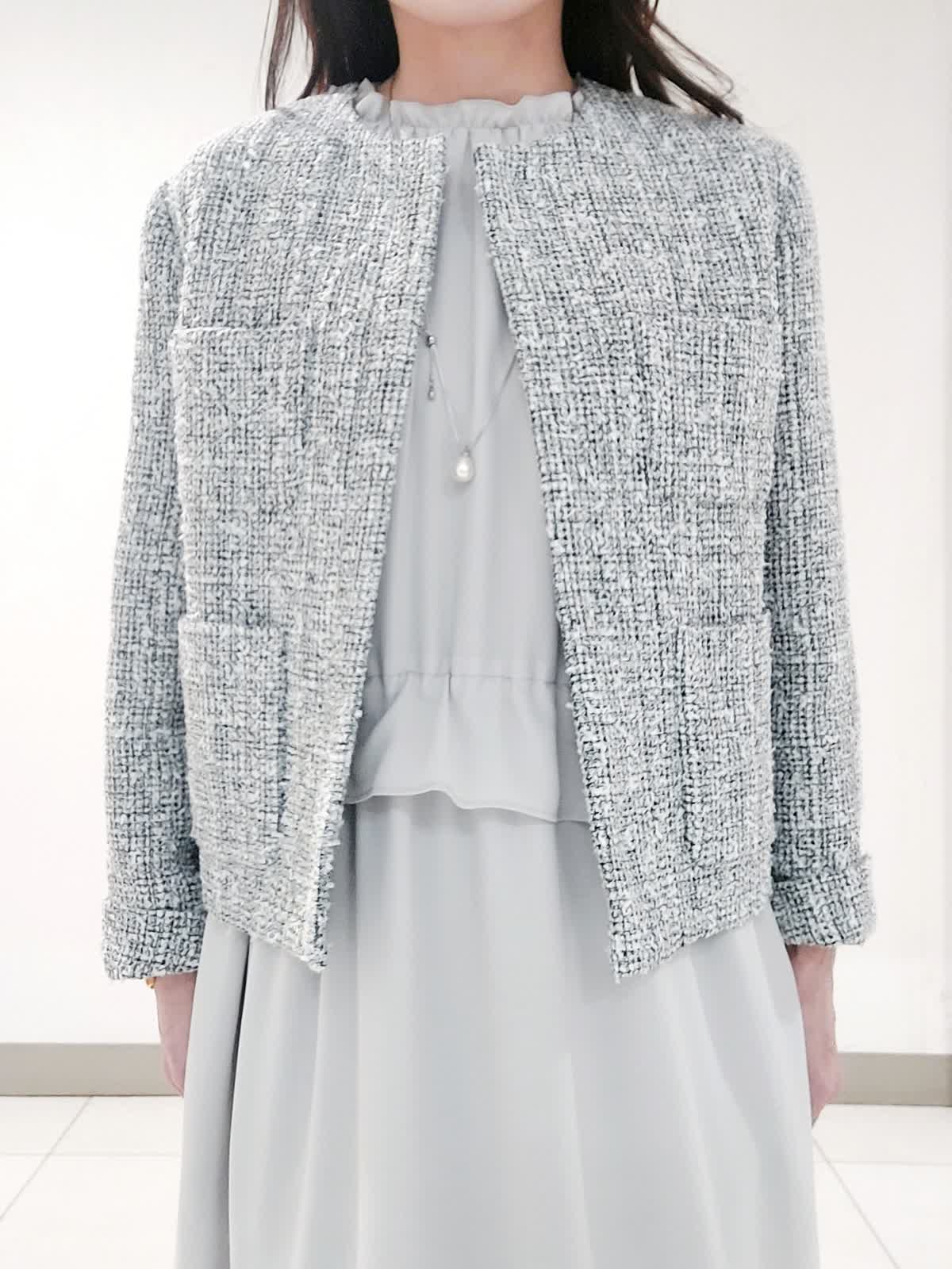 【着用サイズ】ジャケット・ワンピース:9号 表情豊かなメランジ感が上品なツイードを使用したノーカラージャケット。やや短めのコンパクトなフォルムと4つのポケットをアクセントにしました。セレモニーやオフィスシーンはもちろん、カジュアルなコーディネートのアクセントにも使える春先の軽い羽織りにぴったりのジャケットです。ギャザーを効かせたディテールが豊かな表情のワンピース。ペプラムのフリルや襟元もさりげないアクセントで、顔まわりを華やかに演出します。ウエストはゴム仕様でストレスフリー、ソフトな肌触りと軽くしなやかなストレッチ性が着心地の良さを叶えます。お手入れもご自宅で可能です。