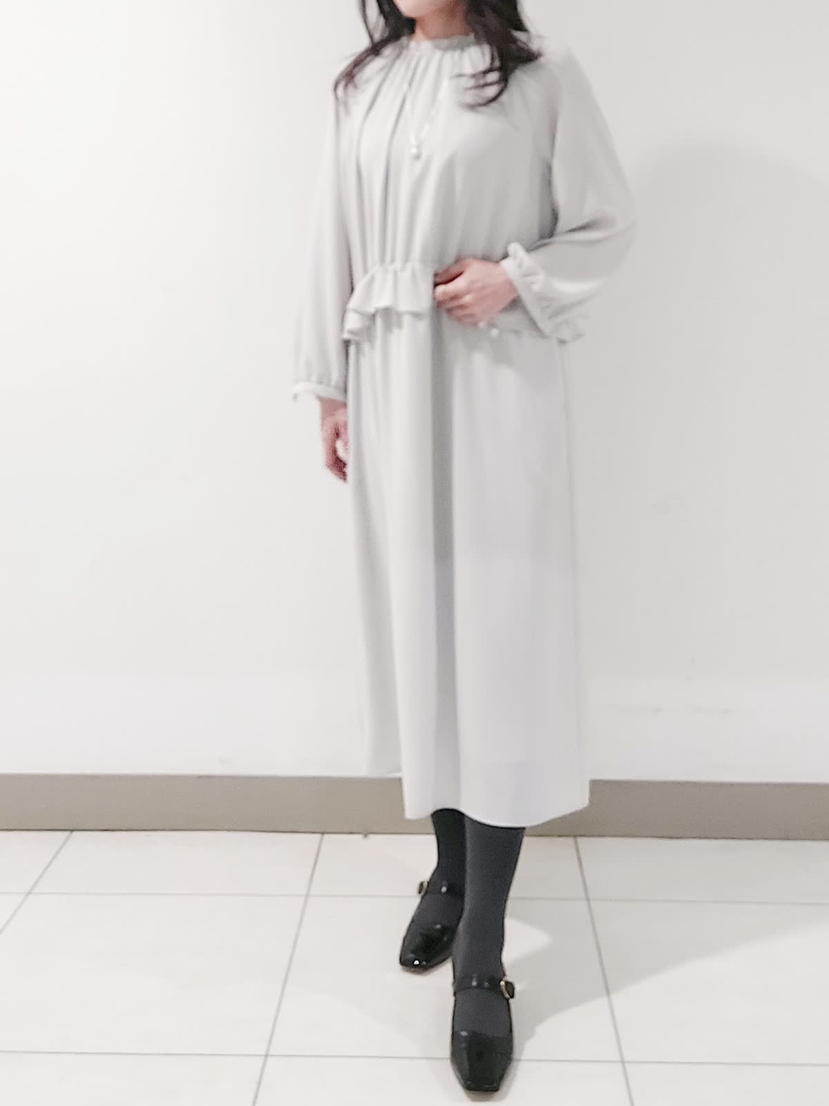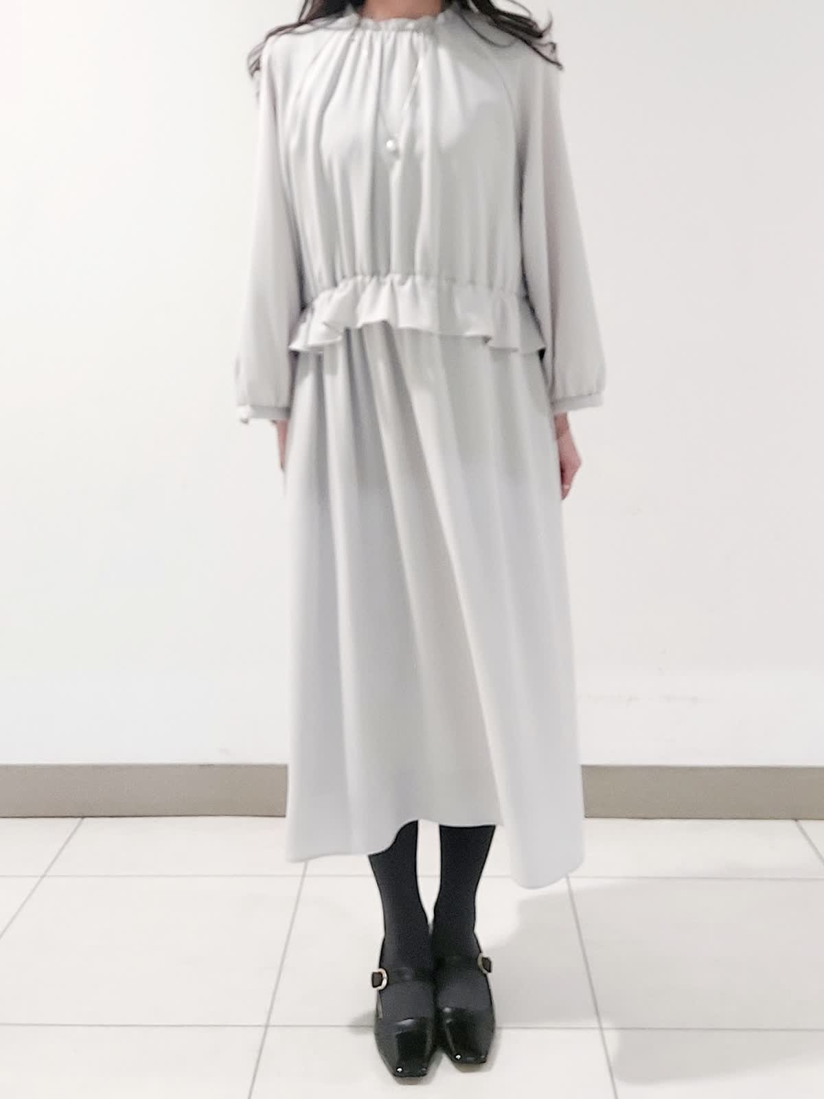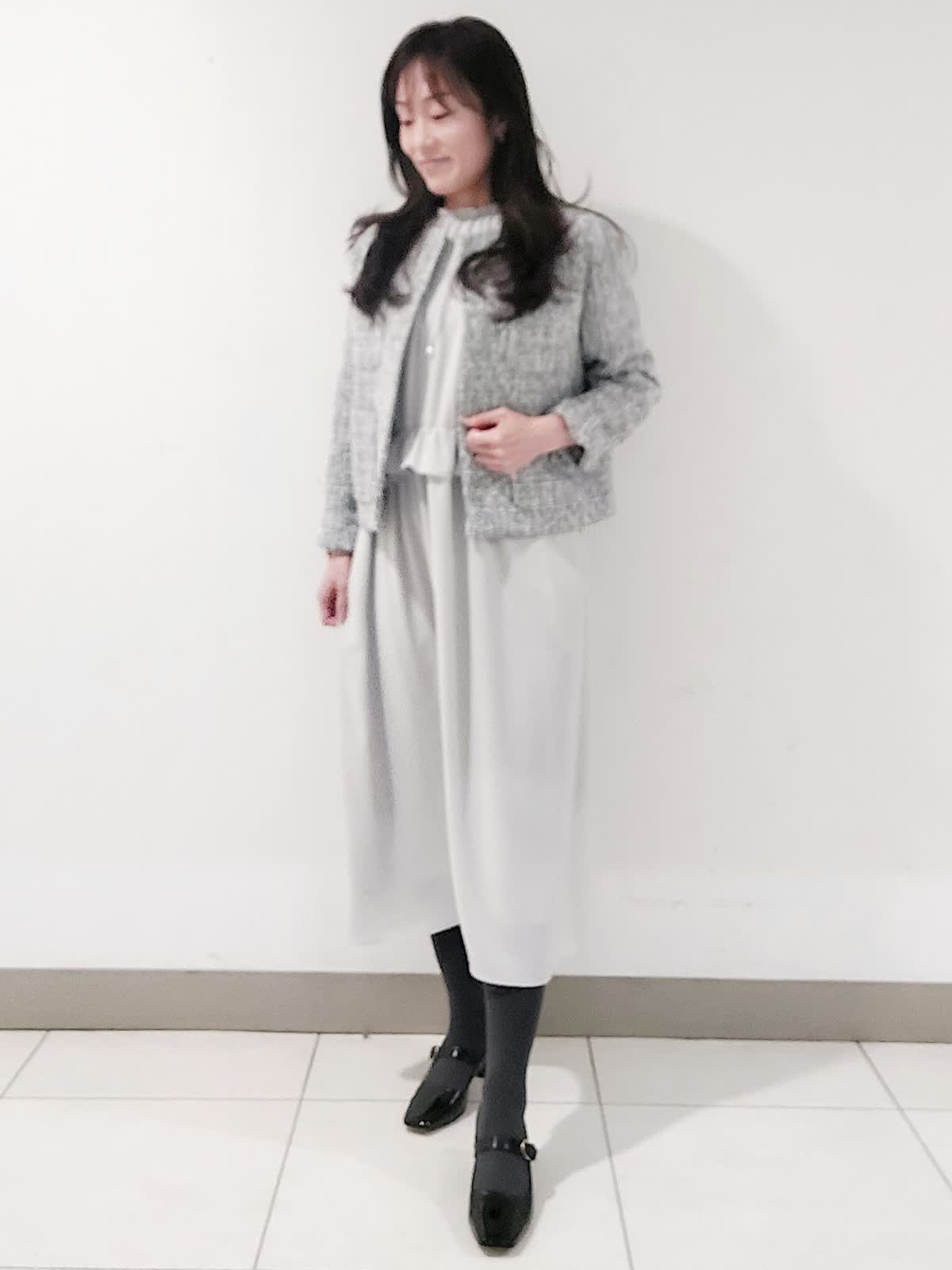 【着用サイズ】ジャケット・ワンピース:9号 表情豊かなメランジ感が上品なツイードを使用したノーカラージャケット。やや短めのコンパクトなフォルムと4つのポケットをアクセントにしました。セレモニーやオフィスシーンはもちろん、カジュアルなコーディネートのアクセントにも使える春先の軽い羽織りにぴったりのジャケットです。ギャザーを効かせたディテールが豊かな表情のワンピース。ペプラムのフリルや襟元もさりげないアクセントで、顔まわりを華やかに演出します。ウエストはゴム仕様でストレスフリー、ソフトな肌触りと軽くしなやかなストレッチ性が着心地の良さを叶えます。お手入れもご自宅で可能です。