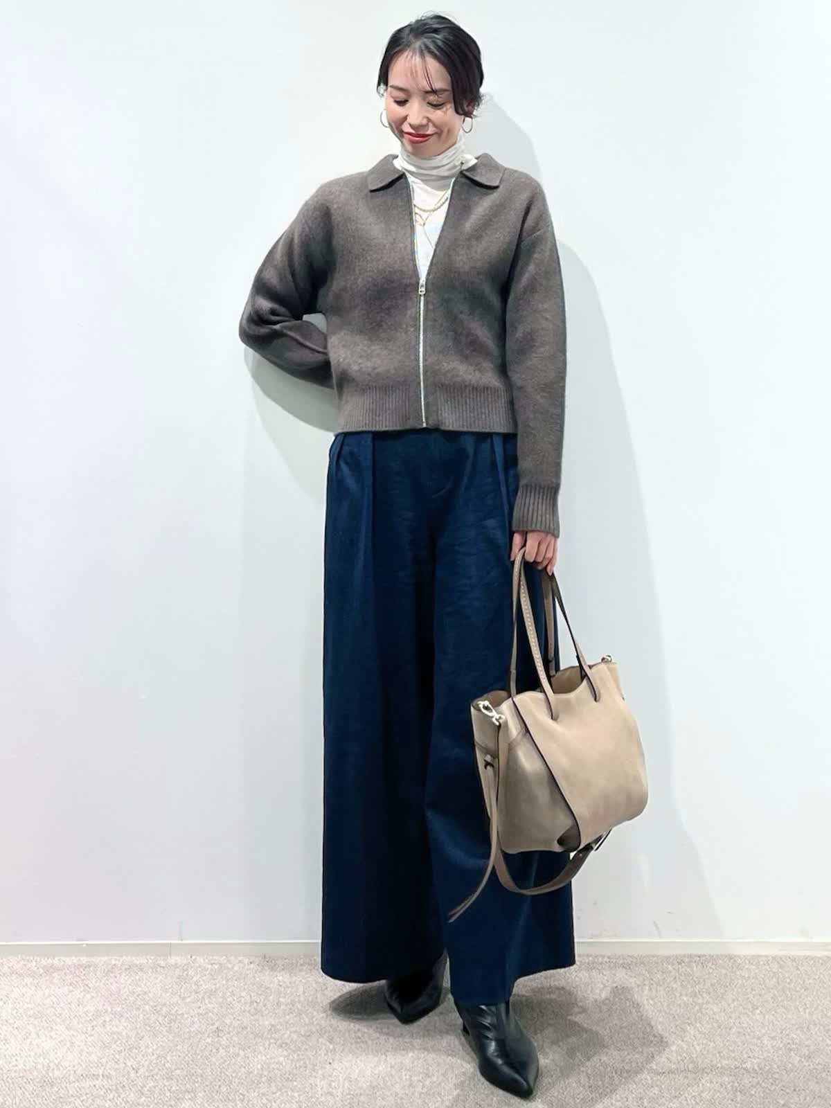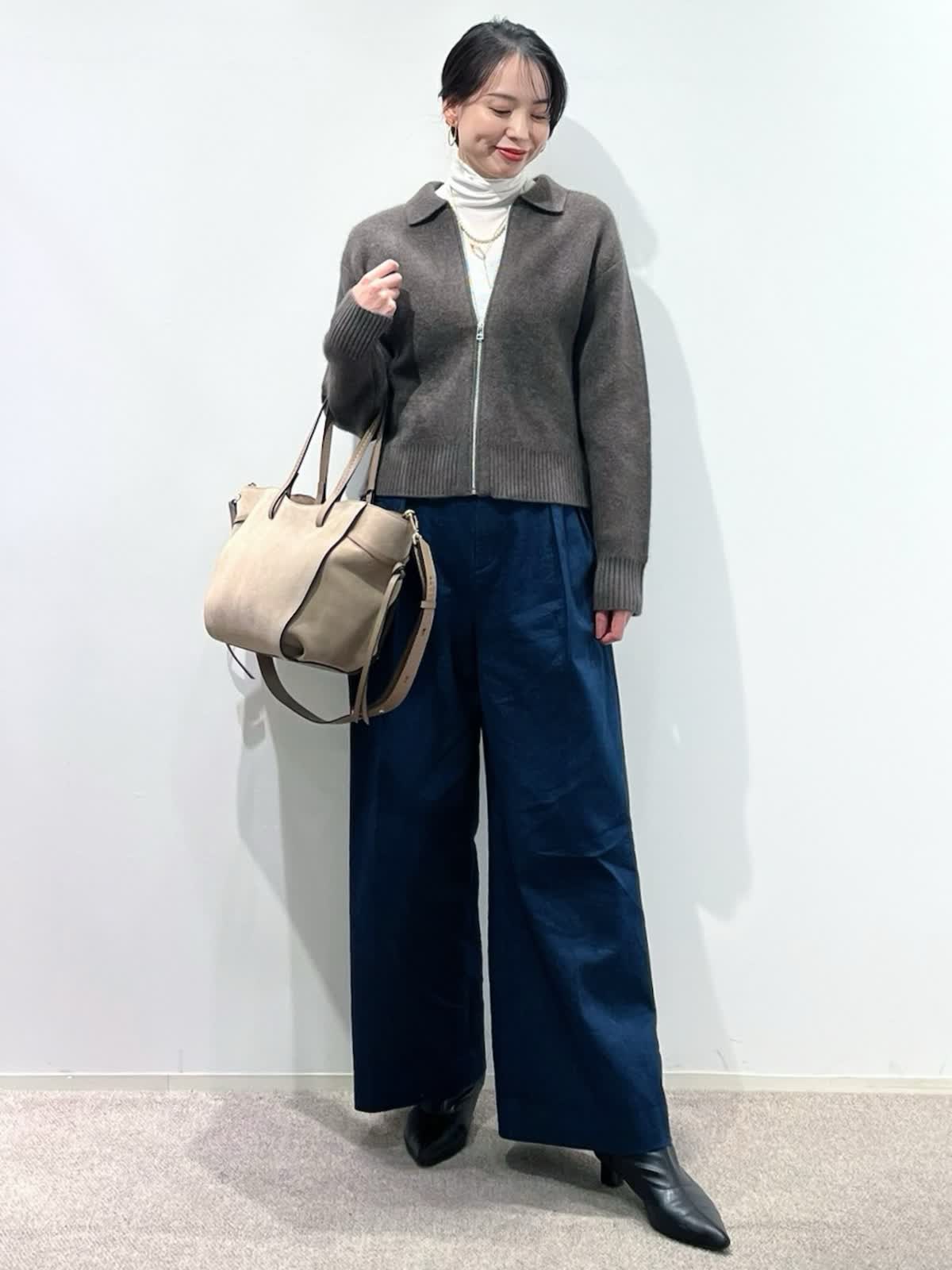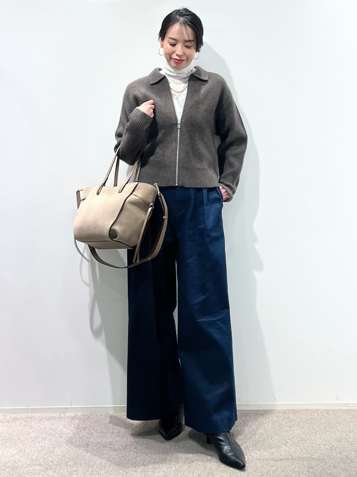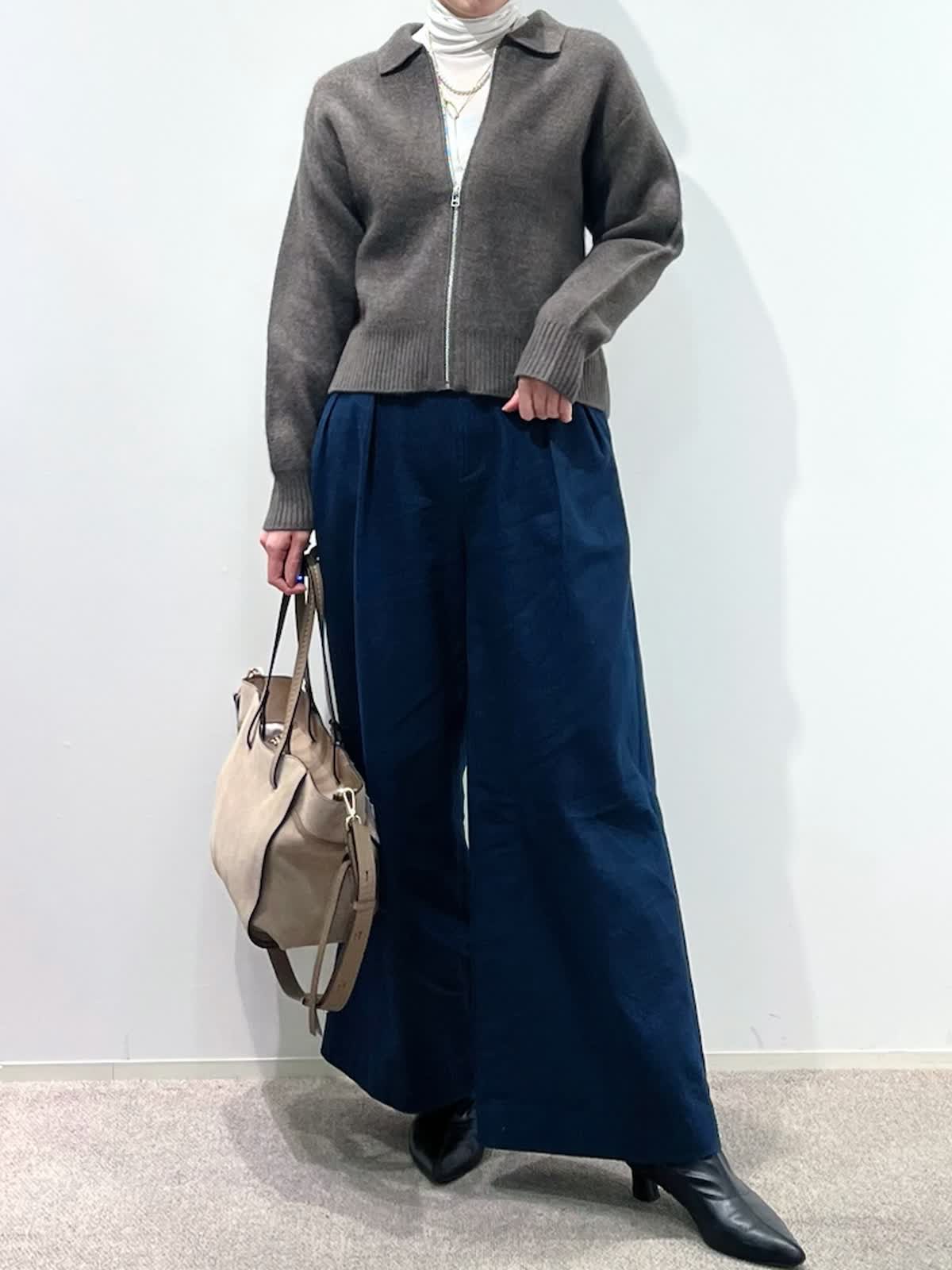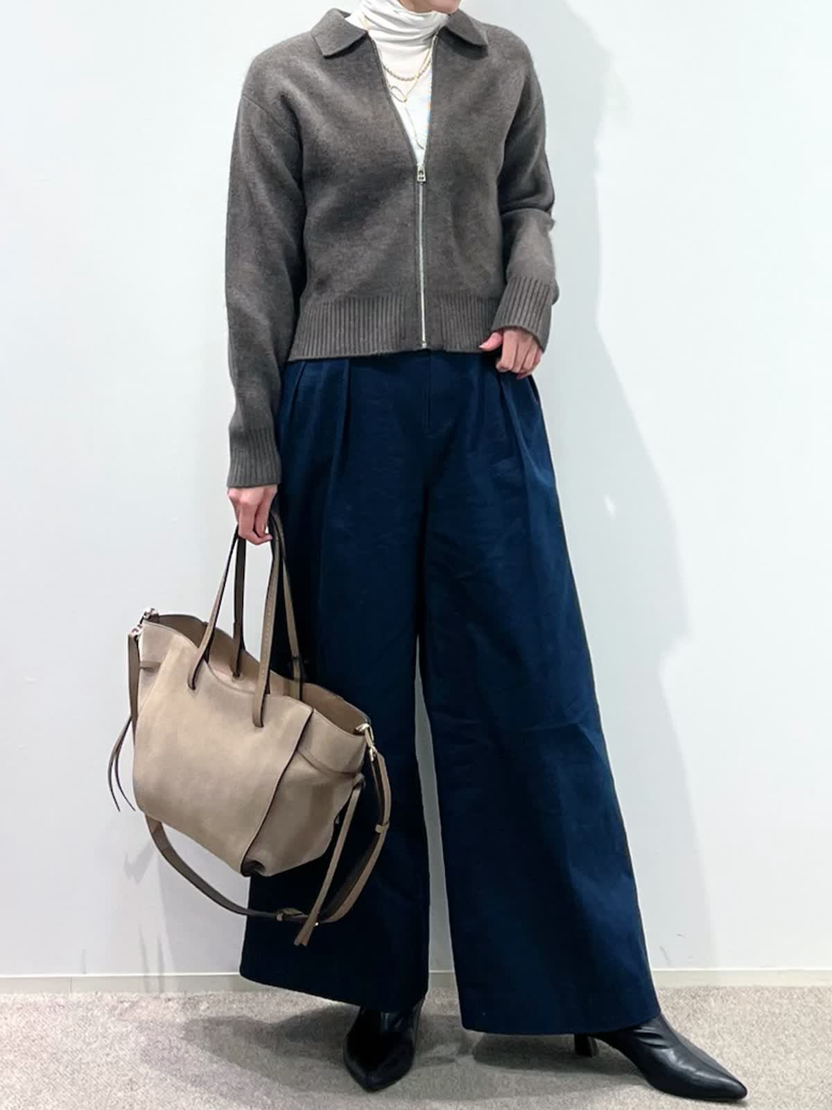 【着用サイズ】カーディガン:9号 カットソー:9号 パンツ:9号 【着用カラー】カーディガン:ブラウン カットソー:オフホワイト パンツ:ダークネイビー バッグ:ベージュ 「素材で魅せる、きれいめカジュアルスタイル」 フォックスニットのジップアップカーディガンは、羽織りや1枚着での着こなしで印象が変わるデザインニット。上質な素材感で、きれいめカジュアルスタイルにおすすめです。 レイヤードには、シアーカットソーをプラスして、ワイドパンツで抜け感のあるスタイルに。 あたたかく、着心地の良さと、トレンド感のあるデザインで、おすすめニットです。
