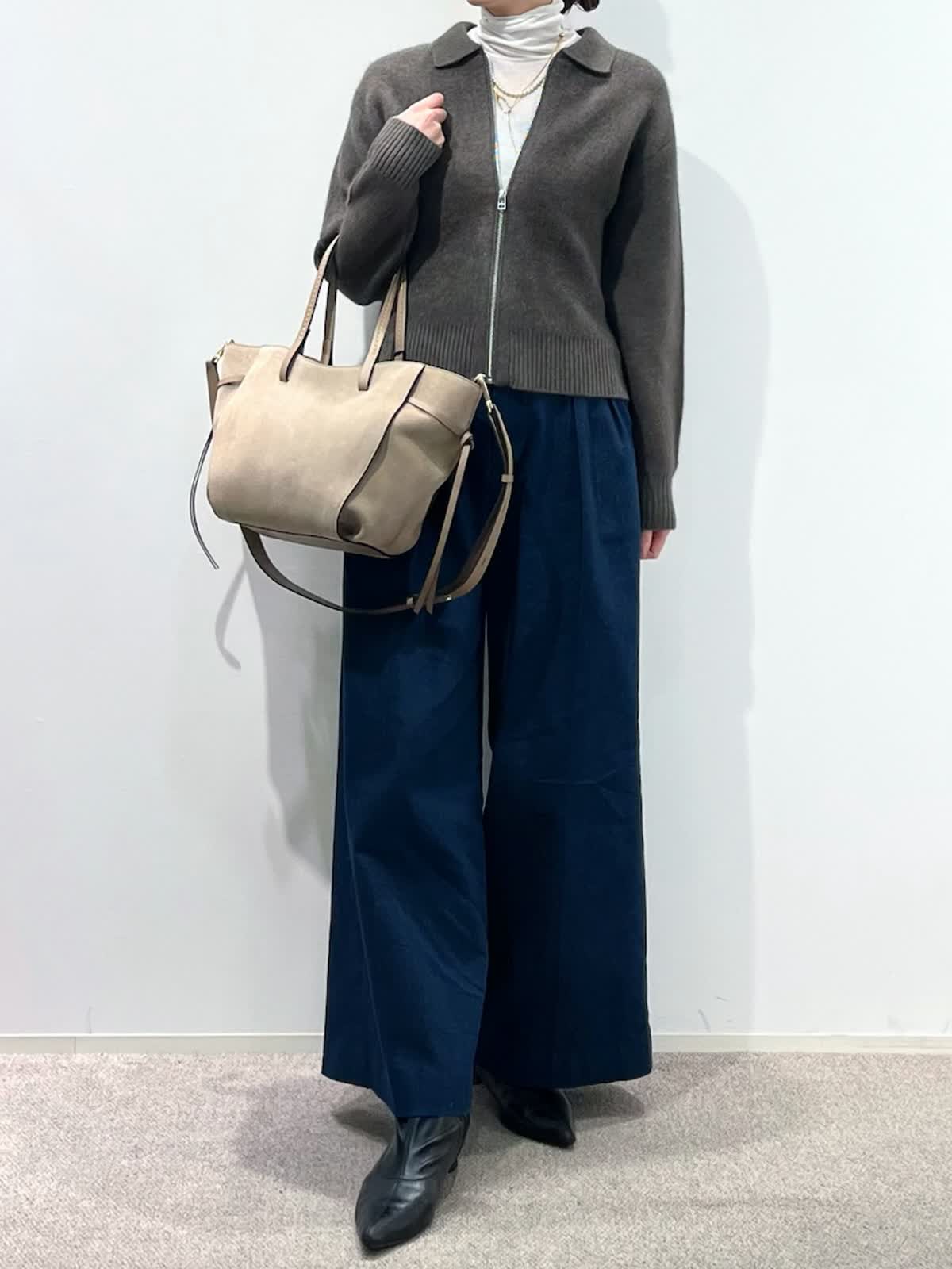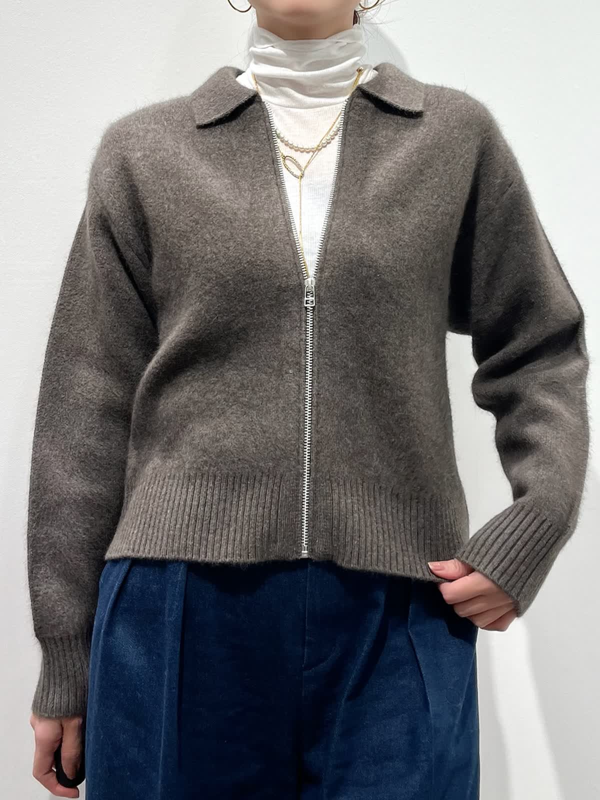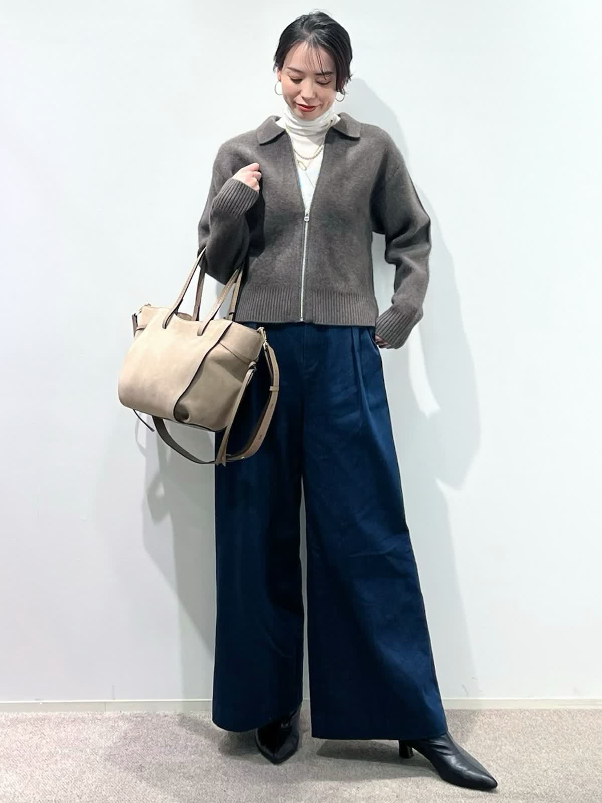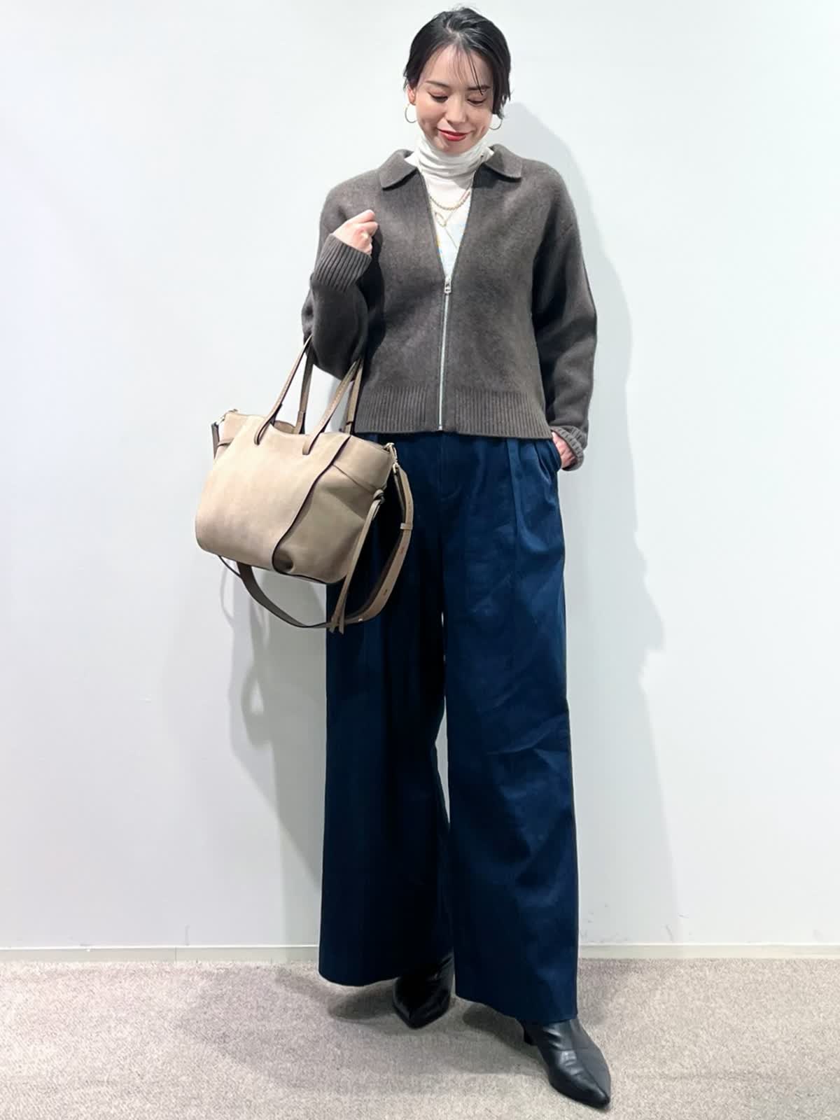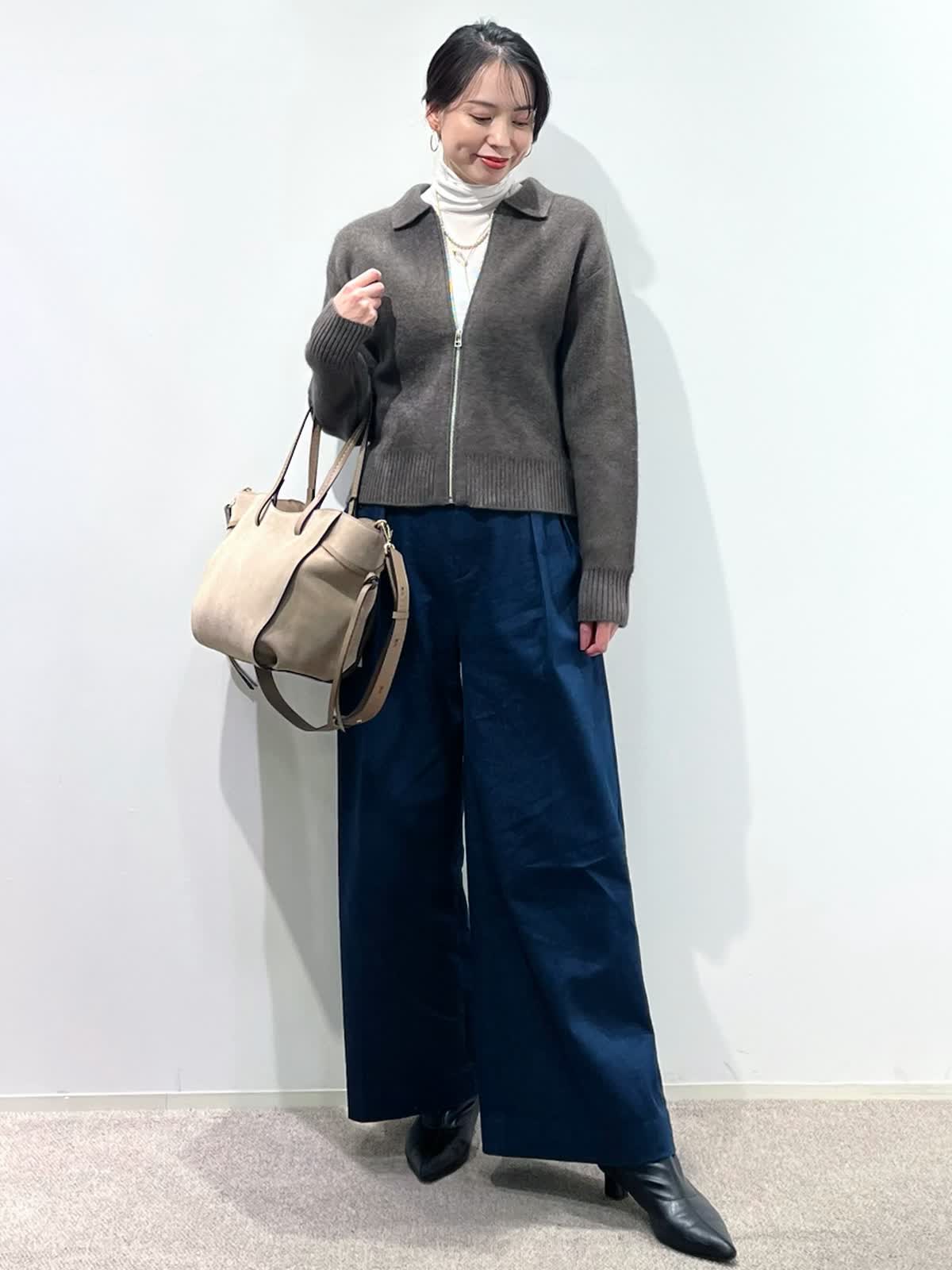 【着用サイズ】カーディガン:9号 カットソー:9号 パンツ:9号 【着用カラー】カーディガン:ブラウン カットソー:オフホワイト パンツ:ダークネイビー バッグ:ベージュ 「素材で魅せる、きれいめカジュアルスタイル」 フォックスニットのジップアップカーディガンは、羽織りや1枚着での着こなしで印象が変わるデザインニット。上質な素材感で、きれいめカジュアルスタイルにおすすめです。 レイヤードには、シアーカットソーをプラスして、ワイドパンツで抜け感のあるスタイルに。 あたたかく、着心地の良さと、トレンド感のあるデザインで、おすすめニットです。
