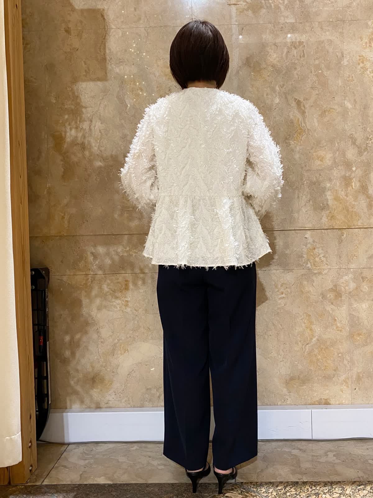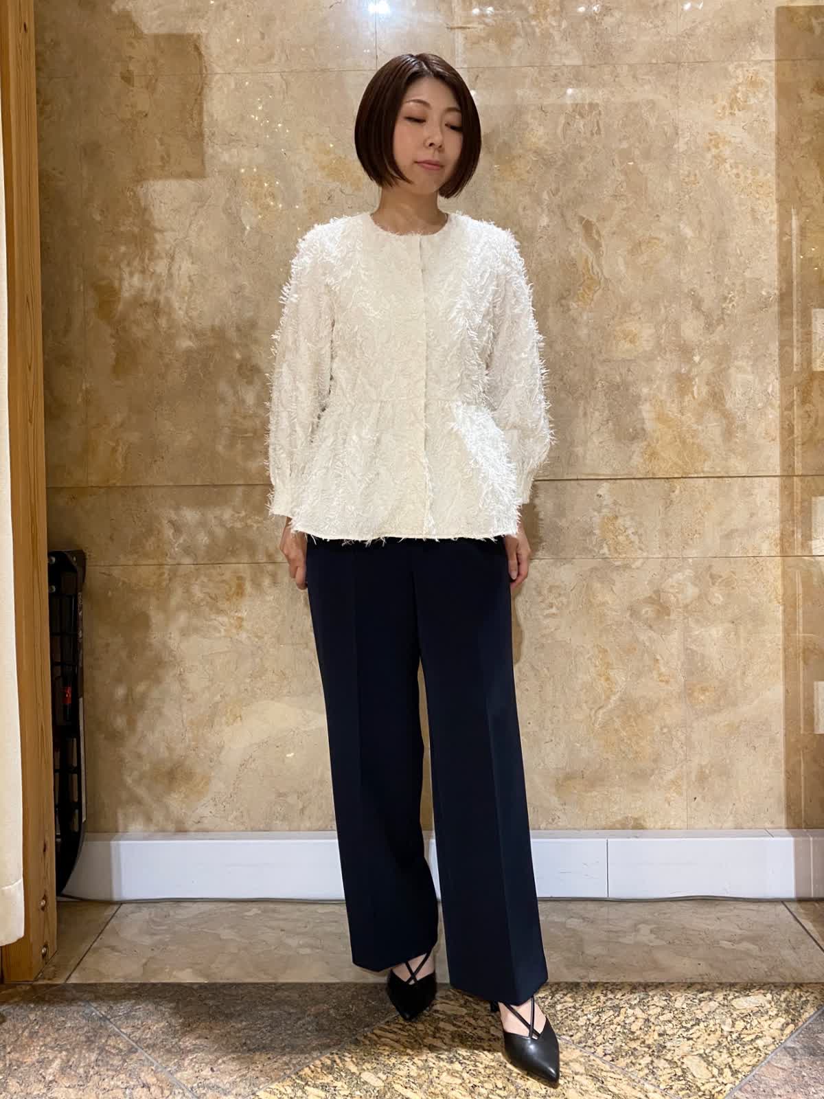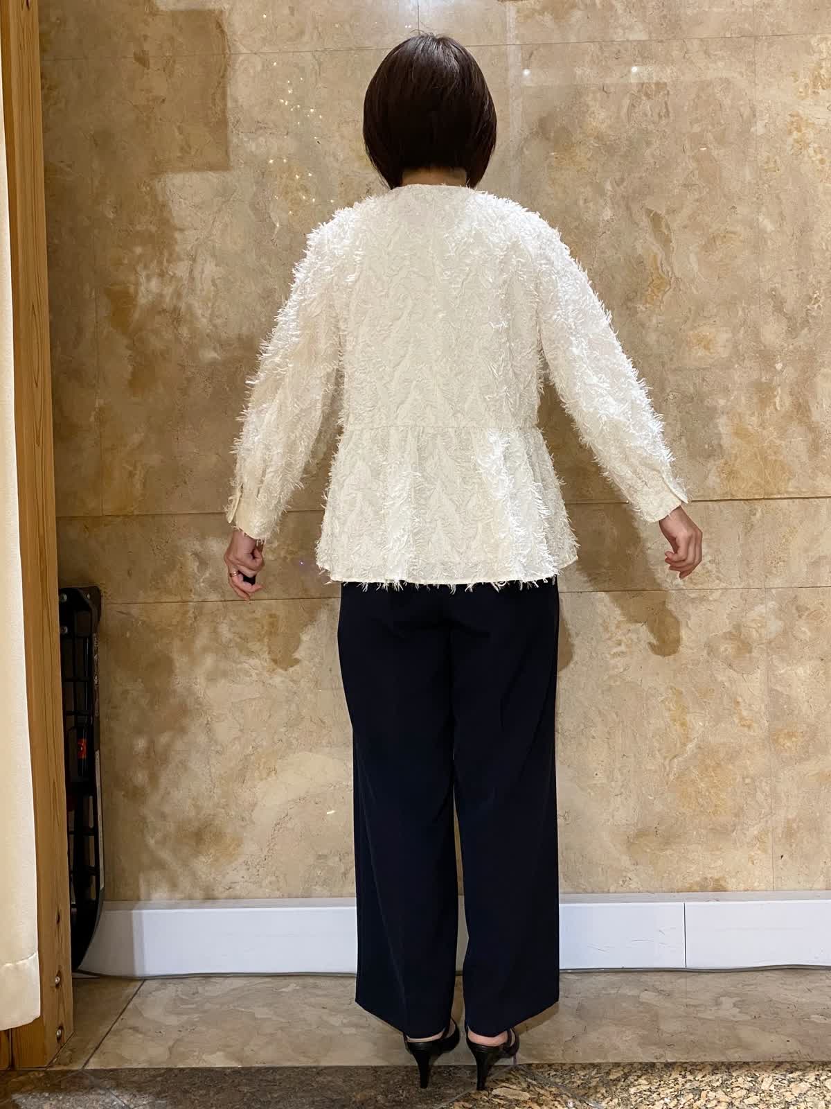 【着用サイズ/カラー】 ブラウス:フリーサイズ/ オフホワイト パンツ:9号/ネイビー セレモニースタイル。フェザーのように軽やかで華やかなブラウスは、ペプラムデザインでウエスト位置を高く見せてくれ、前開き仕様なので羽織にもなります。普段使いしてもかわいく、実用的なブラウスです。パンツは程よくしっかりした生地でサラッと気持ち良く、伸びがいいのでとても動きやすいです。広すぎないワイドはヒップやもものラインも出にくく、スマートに見せてくれます。