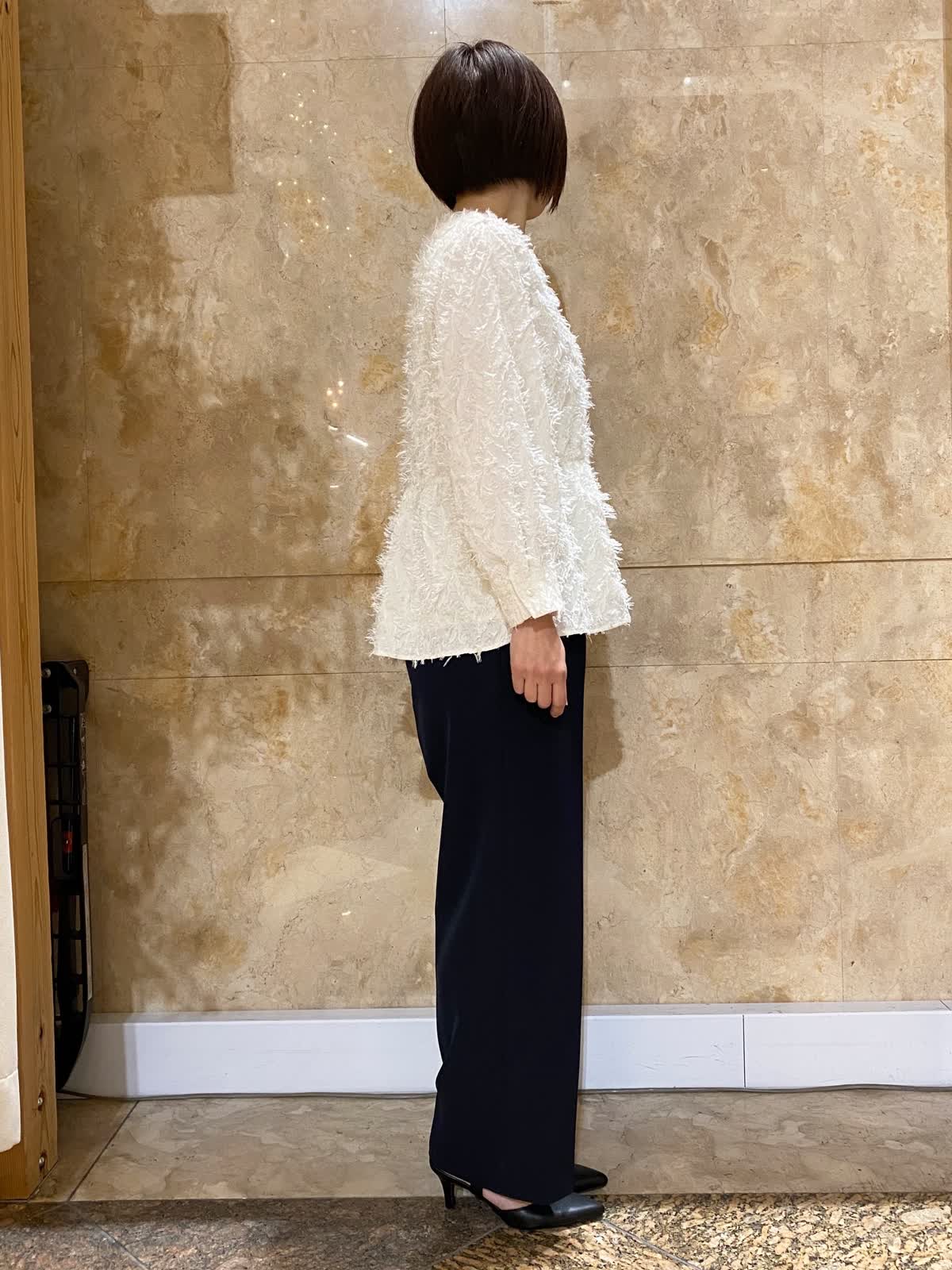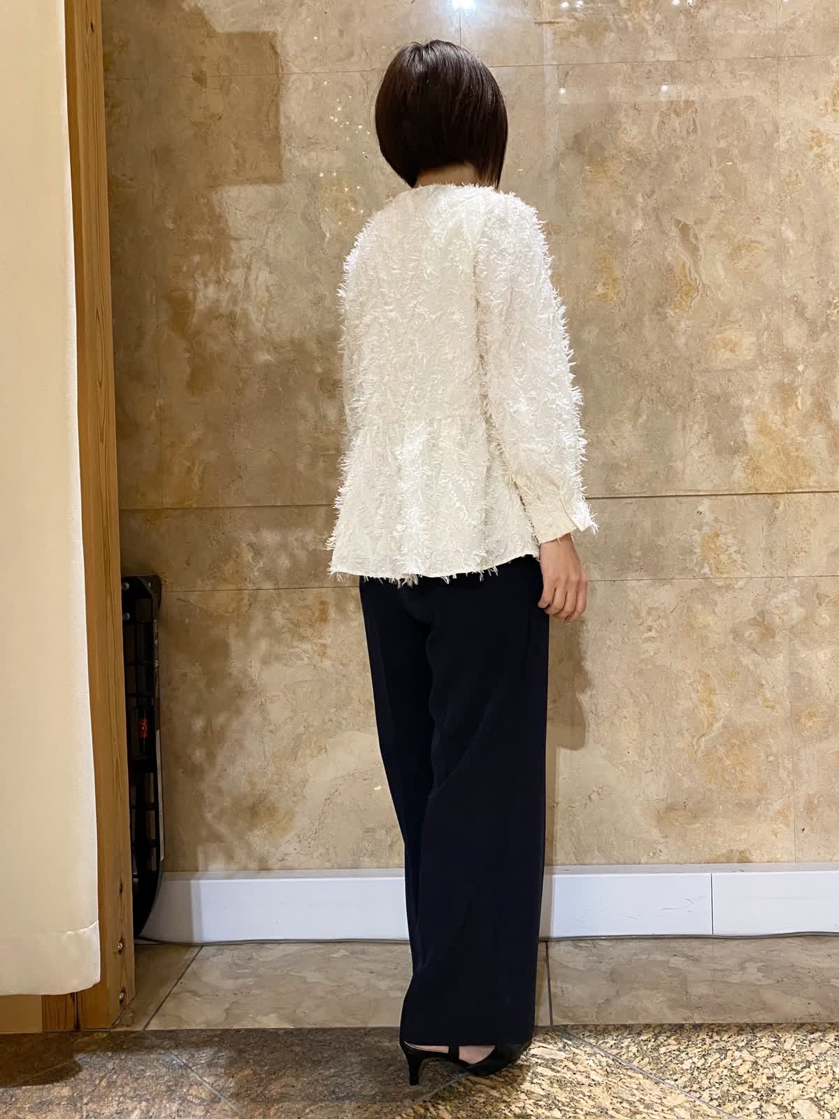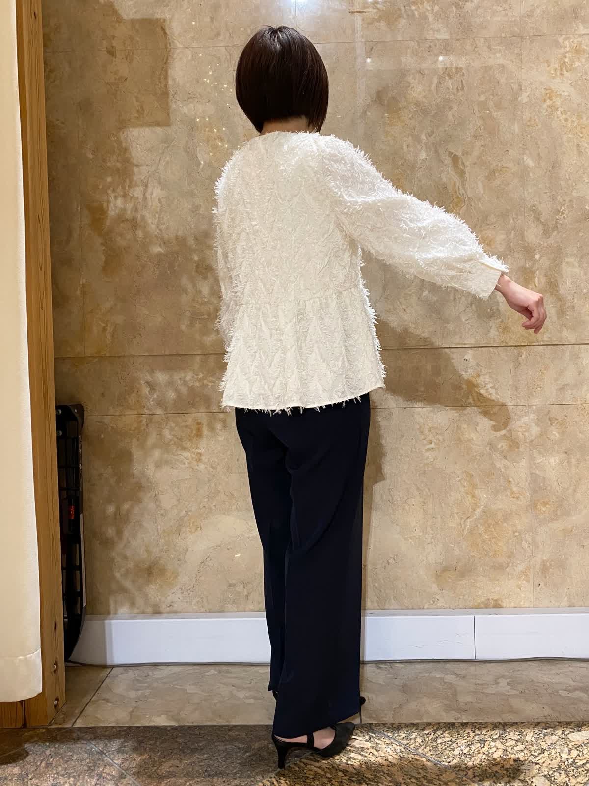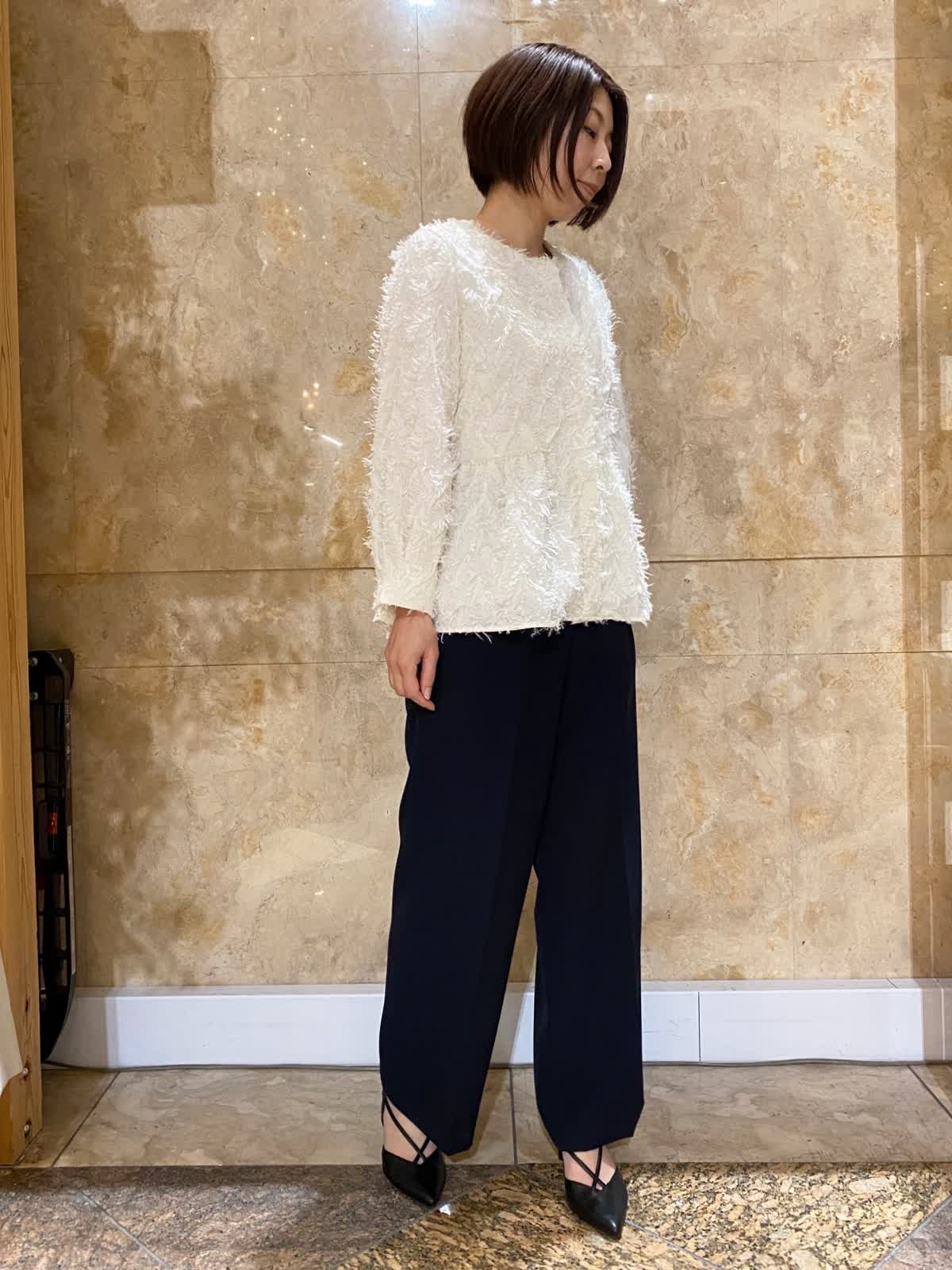 【着用サイズ/カラー】 ブラウス:フリーサイズ/ オフホワイト パンツ:9号/ネイビー セレモニースタイル。フェザーのように軽やかで華やかなブラウスは、ペプラムデザインでウエスト位置を高く見せてくれ、前開き仕様なので羽織にもなります。普段使いしてもかわいく、実用的なブラウスです。パンツは程よくしっかりした生地でサラッと気持ち良く、伸びがいいのでとても動きやすいです。広すぎないワイドはヒップやもものラインも出にくく、スマートに見せてくれます。