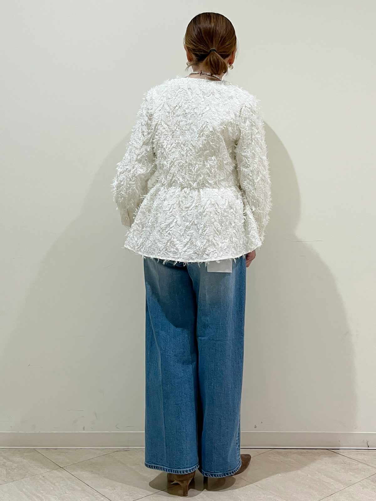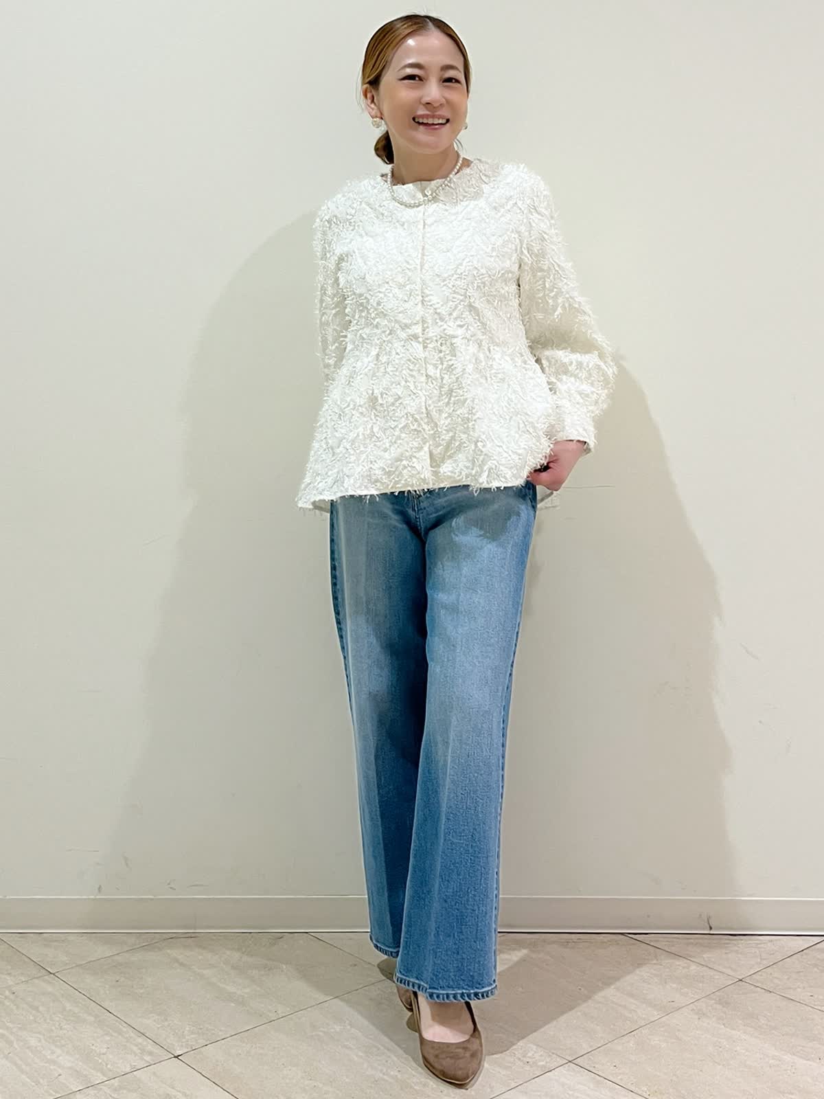 【着用サイズ】ブラウス:フリーサイズ パンツ:9号 【着用カラー】ブラウス:オフホワイト パンツ:ブルー 休日のお出かけコーディネートです。華やかな立体感のあるジャガード素材のブラウスです。ふんわり広がるペプラムがポイントです。普段使いだけでは無くセレモニー、お食事会などにも使えます。デニムパンツは脚長効果があるワイドシルエットです。