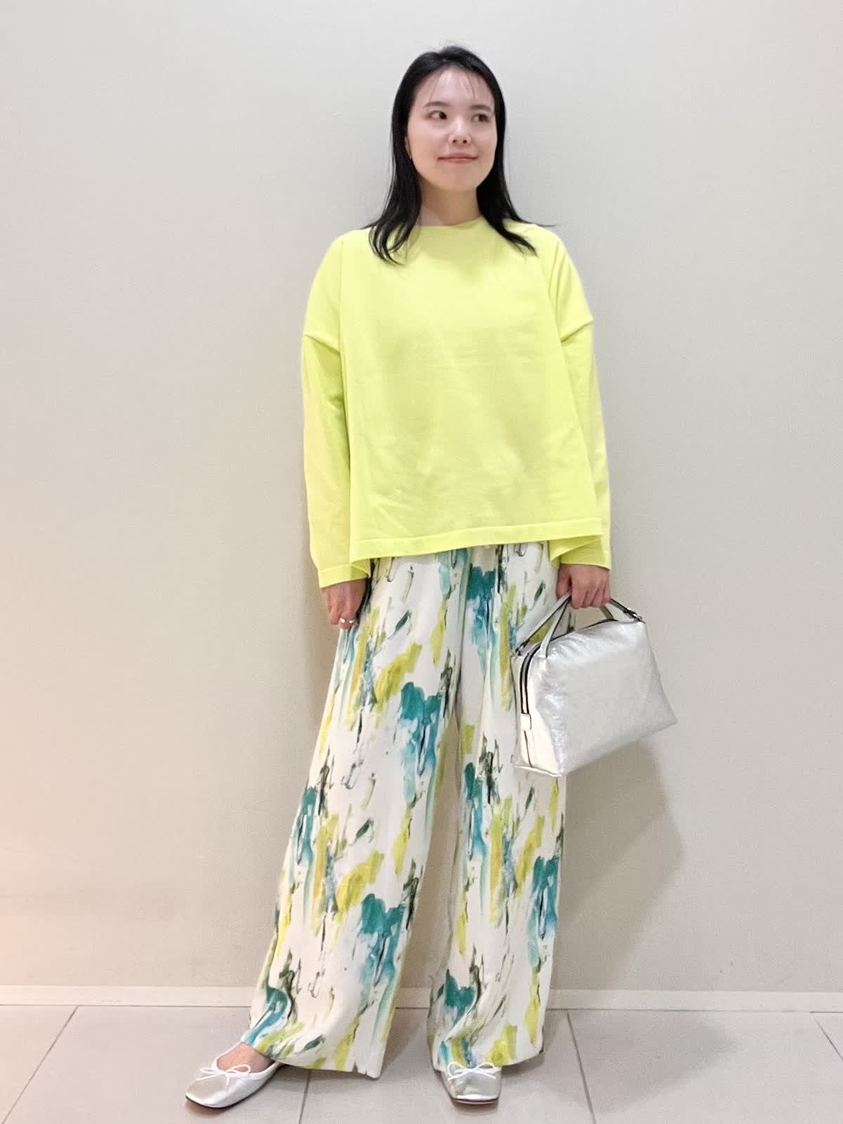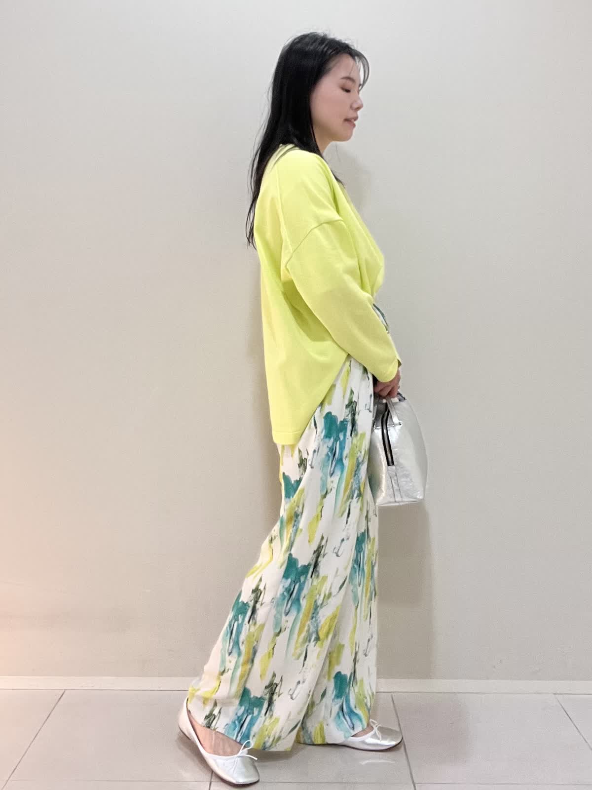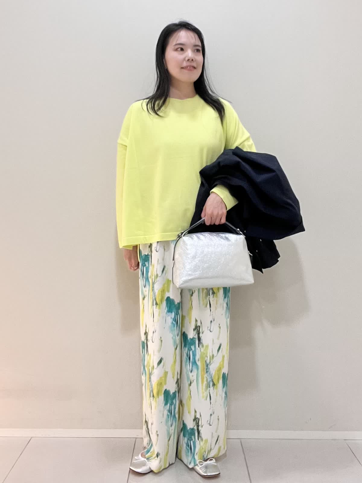 【着用サイズ/カラー】ニット:9号 ビビットイエロー パンツ:9号 ペパーミント バッグ・シューズ シルバー コート:9号 ネイビー カジュアルコーデ。春らしい爽やかなビビットイエローのニットは、着心地も良く軽いので、旅行やお出かけにオススメです。