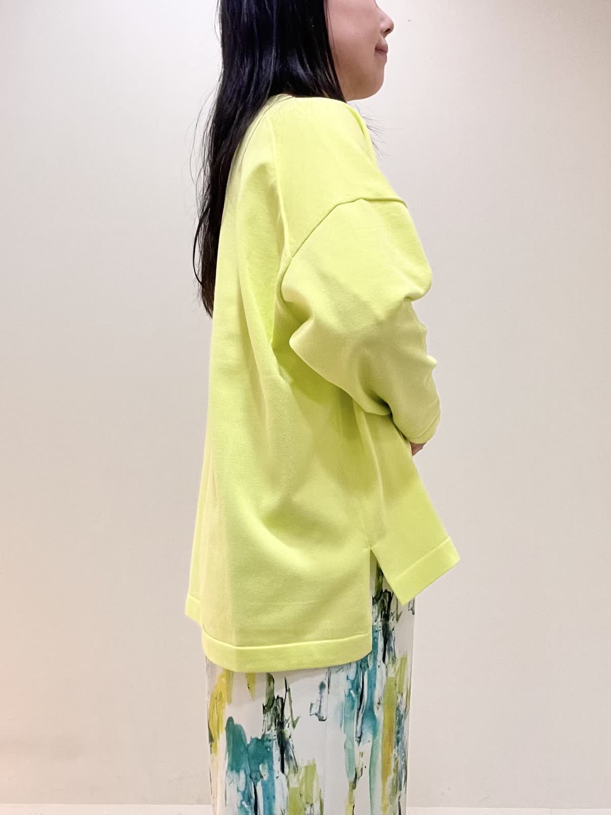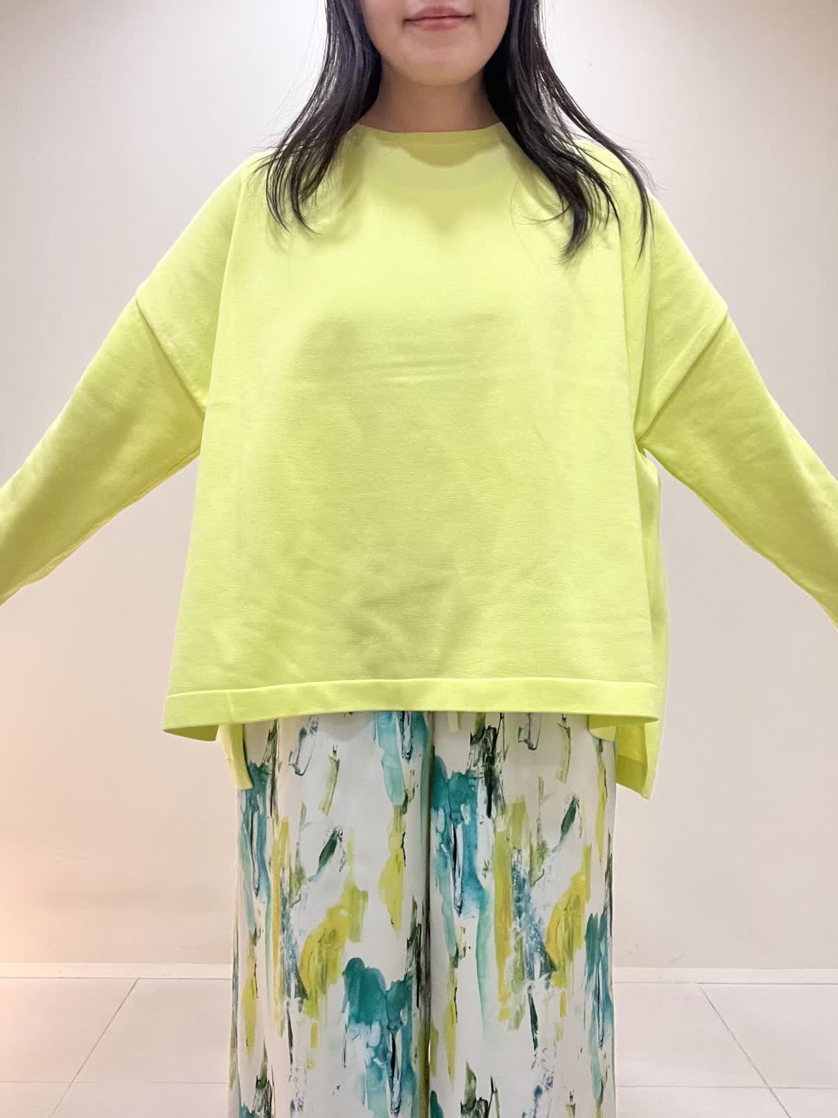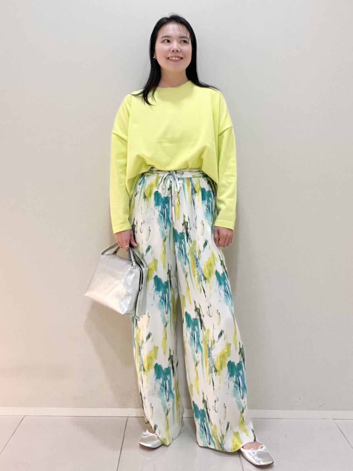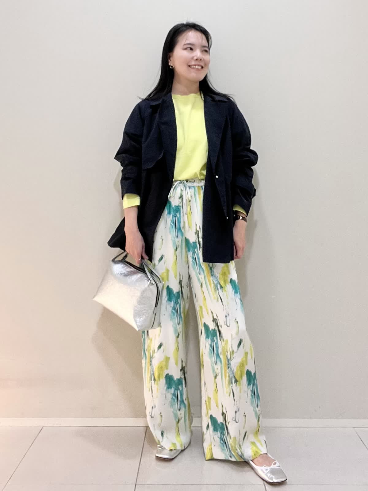 【着用サイズ/カラー】ニット:9号 ビビットイエロー パンツ:9号 ペパーミント バッグ・シューズ シルバー コート:9号 ネイビー カジュアルコーデ。春らしい爽やかなビビットイエローのニットは、着心地も良く軽いので、旅行やお出かけにオススメです。