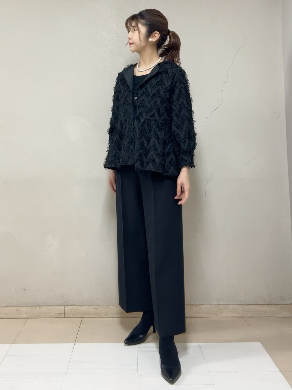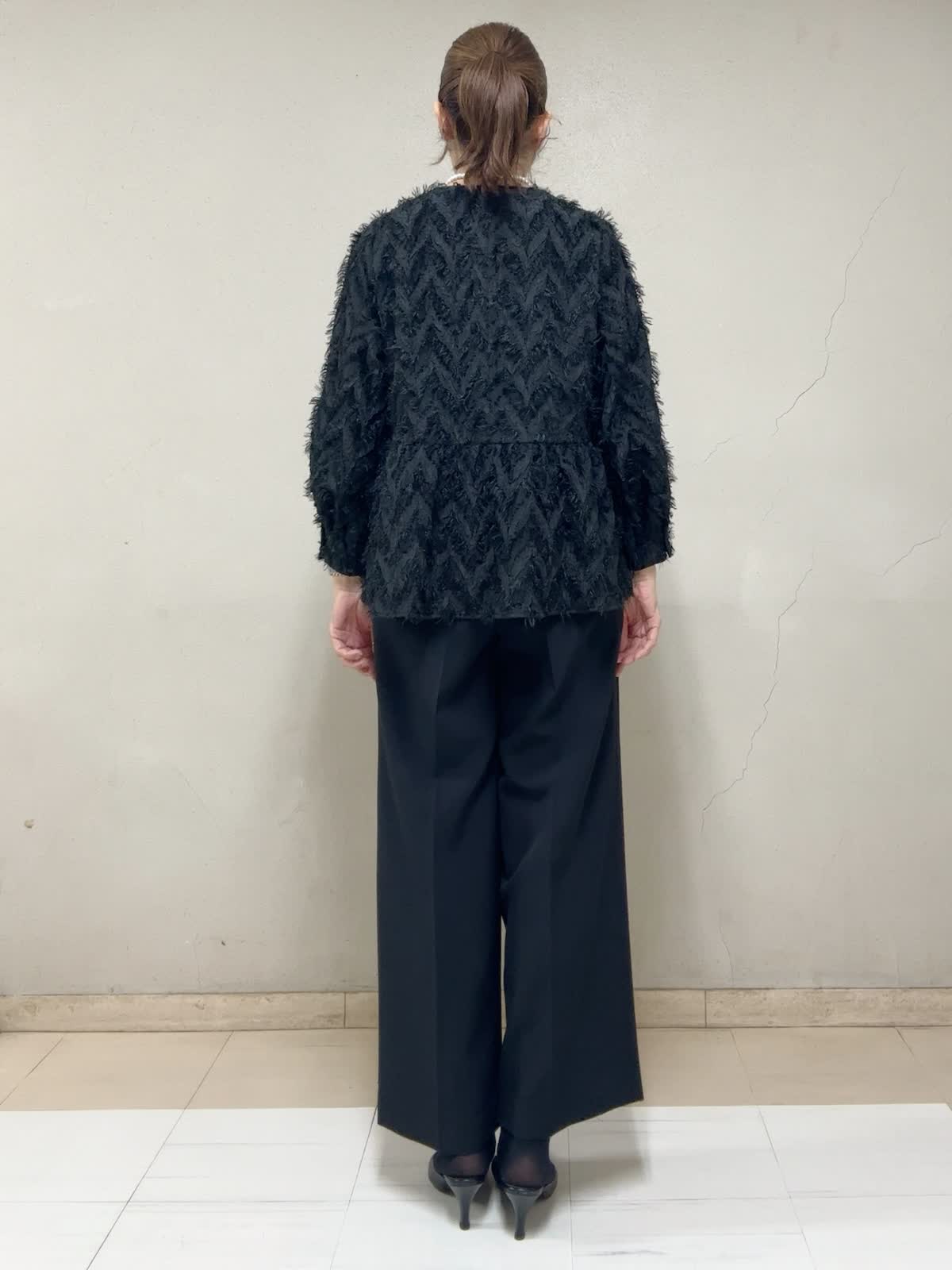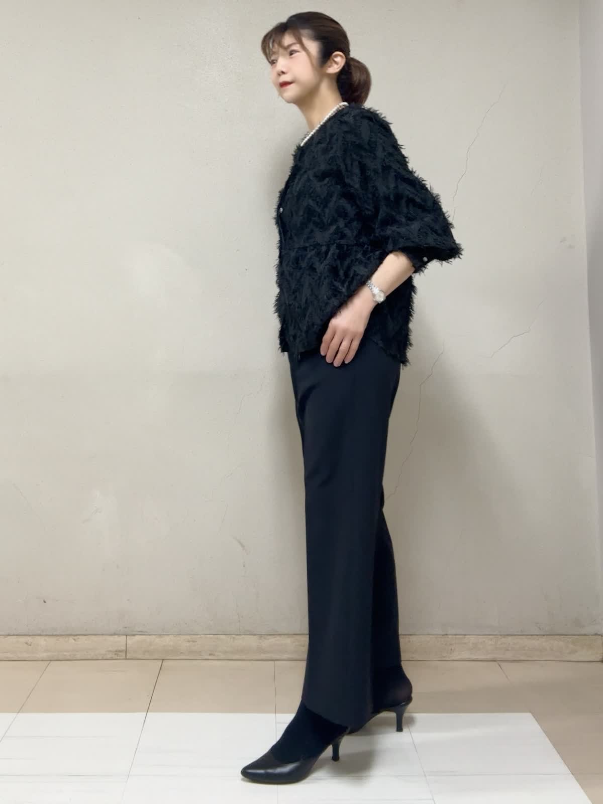 【着用サイズ】ブラウス:フリー タンクトップ:9号 パンツ:9号 【着用カラー】ブラウス:ブラック タンクトップ:ブラック パンツ:ブラック セレモニースタイル STORYコラボのブラウス。光沢のある糸でヘリンボーン柄がゴージャス映えです。切替高めのぺプラムがスタイルアップして見えます。手首の出具合が、絶妙な袖丈で華奢に見えます。