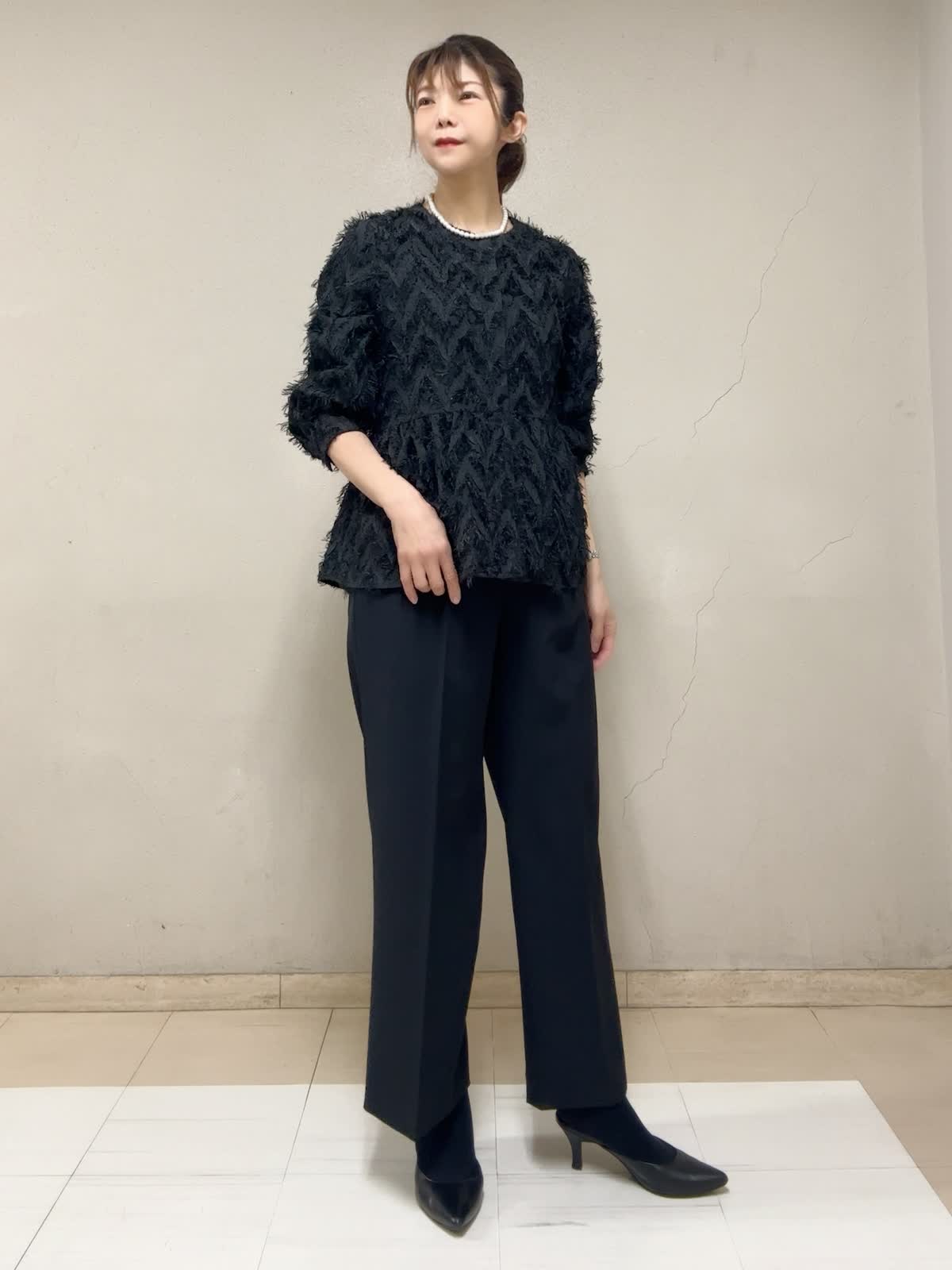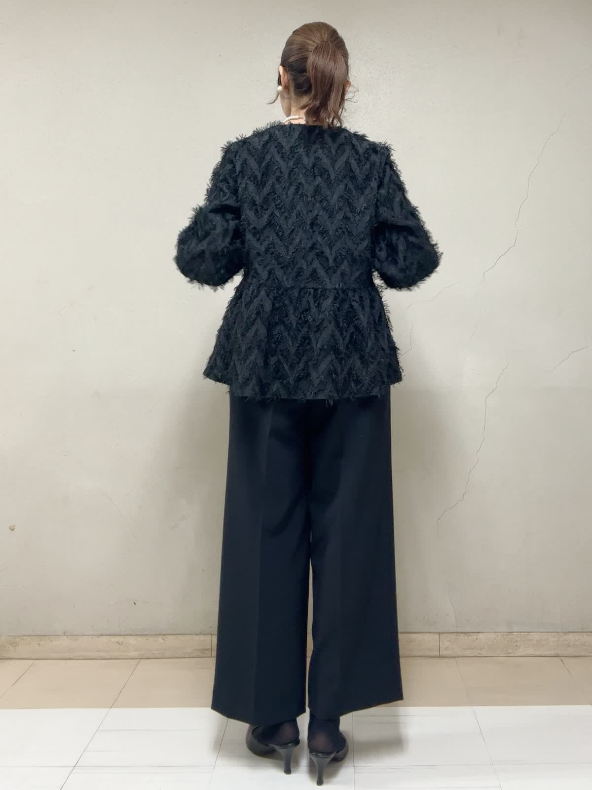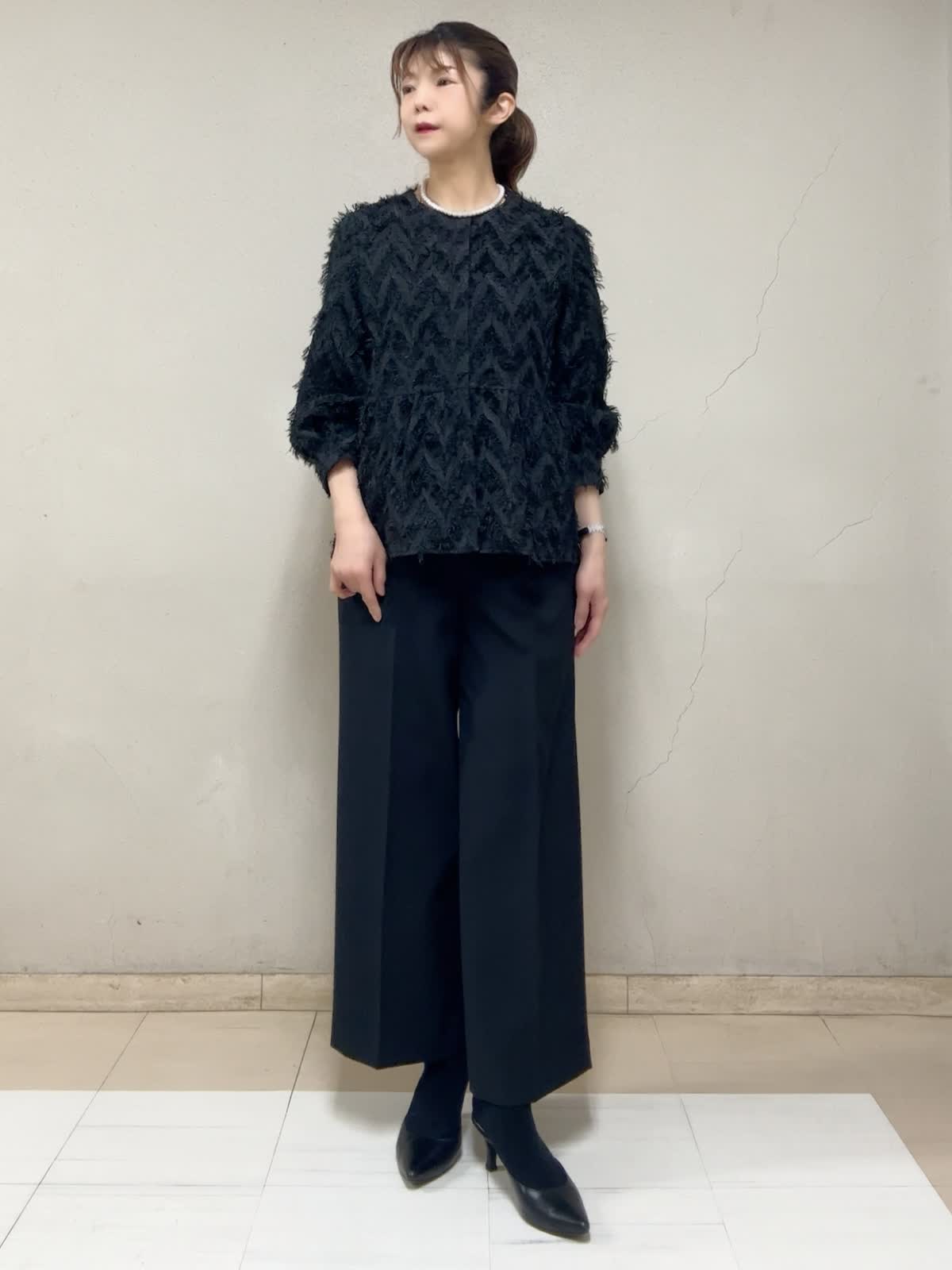 【着用サイズ】ブラウス:フリー タンクトップ:9号 パンツ:9号 【着用カラー】ブラウス:ブラック タンクトップ:ブラック パンツ:ブラック セレモニースタイル STORYコラボのブラウス。光沢のある糸でヘリンボーン柄がゴージャス映えです。切替高めのぺプラムがスタイルアップして見えます。手首の出具合が、絶妙な袖丈で華奢に見えます。