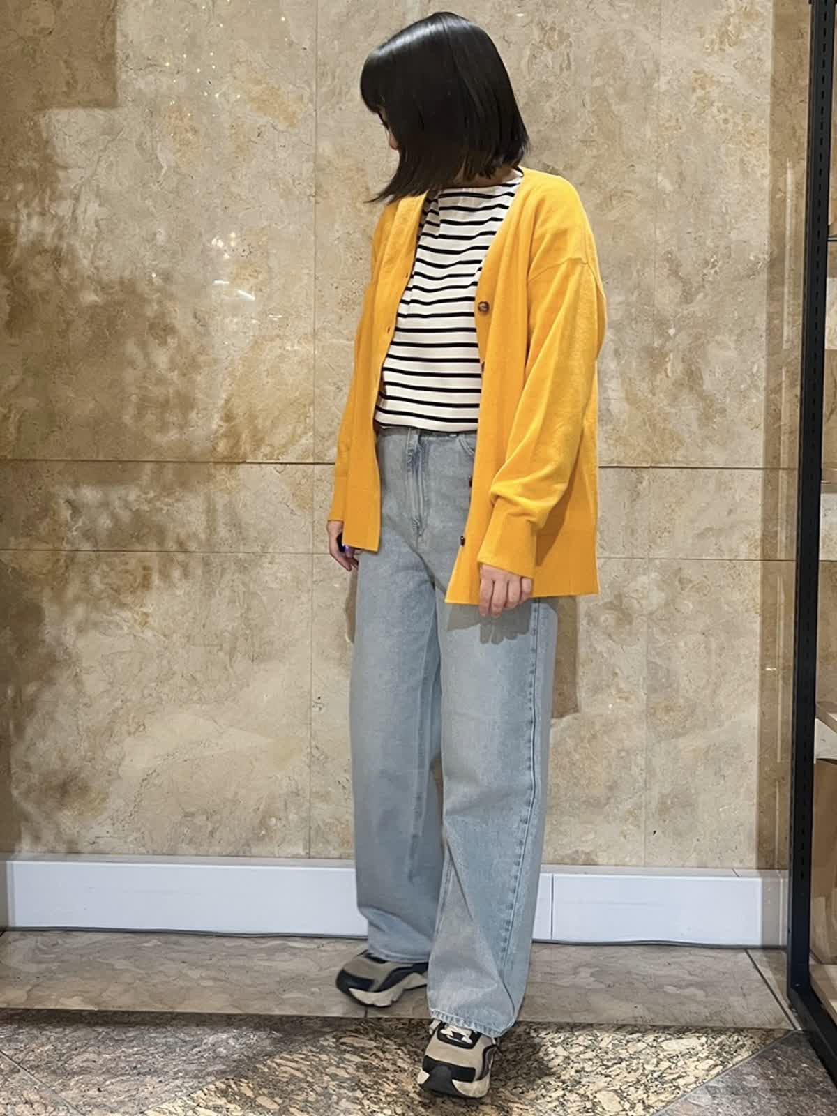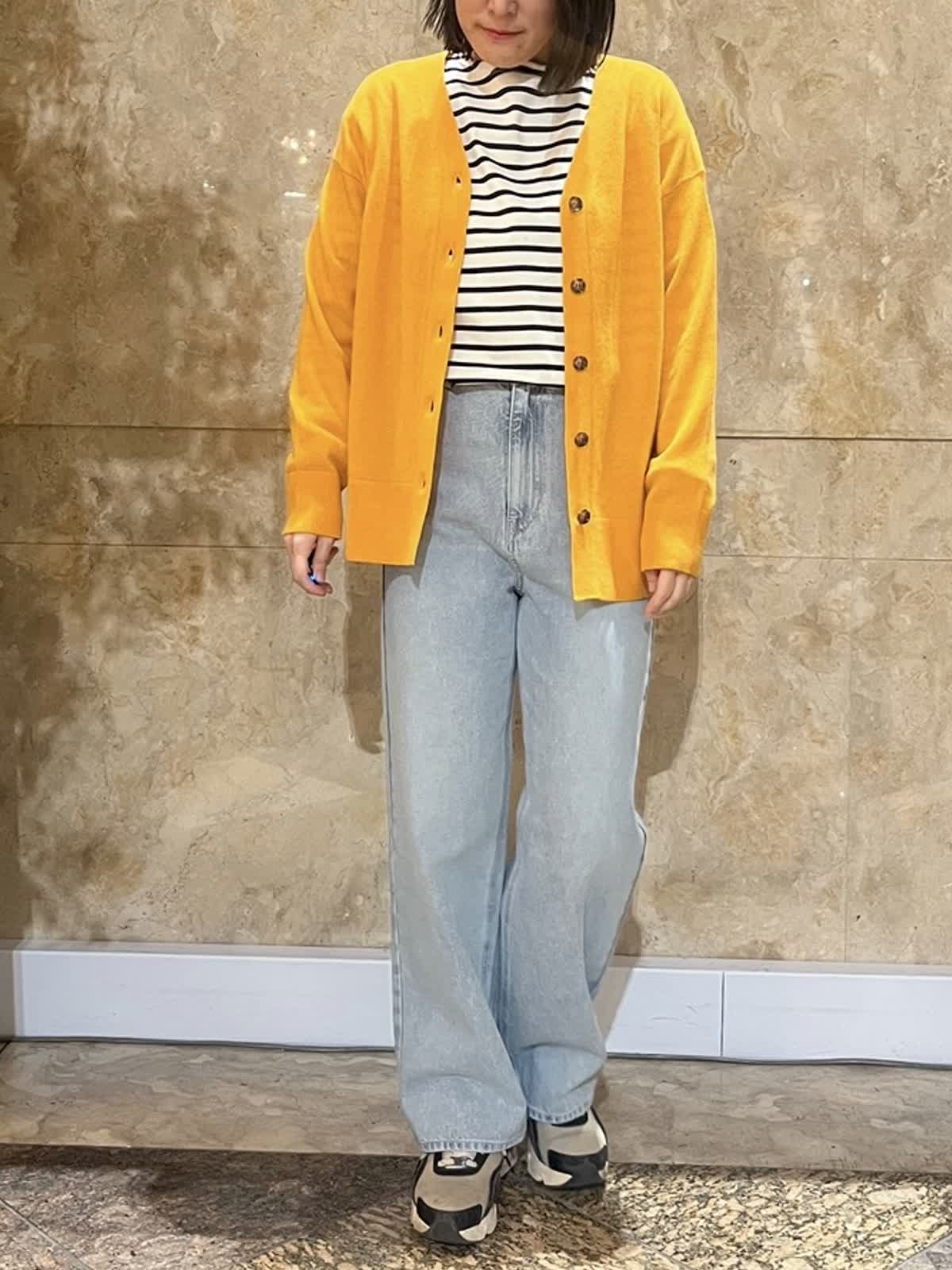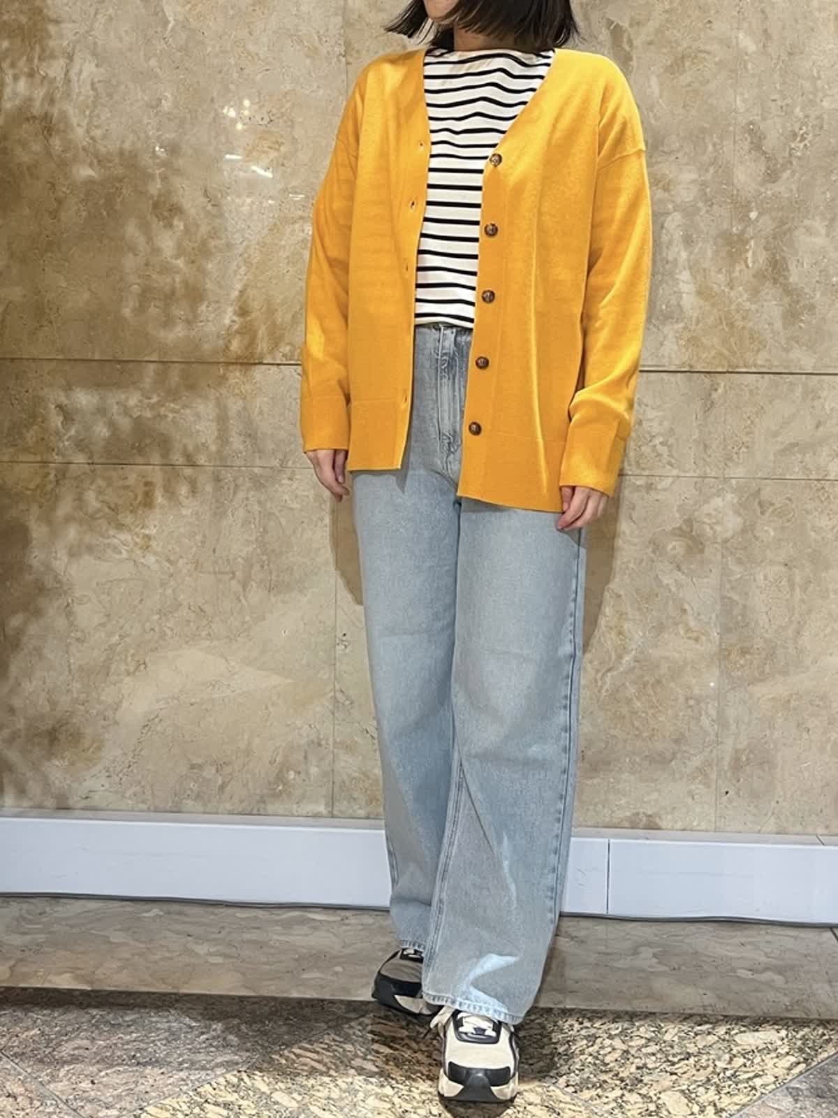 【着用サイズ/カラー】カーディガン:フリー/オレンジ ボーダーカットソー:フリー/アイボリー デニム:9号/サックス オレンジのカーディガンを主役に、ボーダーを合わせて程よくカジュアルダウンしたスタイリング。 顔まわりを明るく見せてくれるカラーながら、シンプルなデザインのため大人の方にも取り入れやすい一枚です。 デニムは新作のストレートパンツ!ダメージ加工ですがハイウエストのスッキリシルエットです。 見えないこだわりインナーステッチの赤がおしゃれポイントでデニム好きさんにはオススメの1枚。