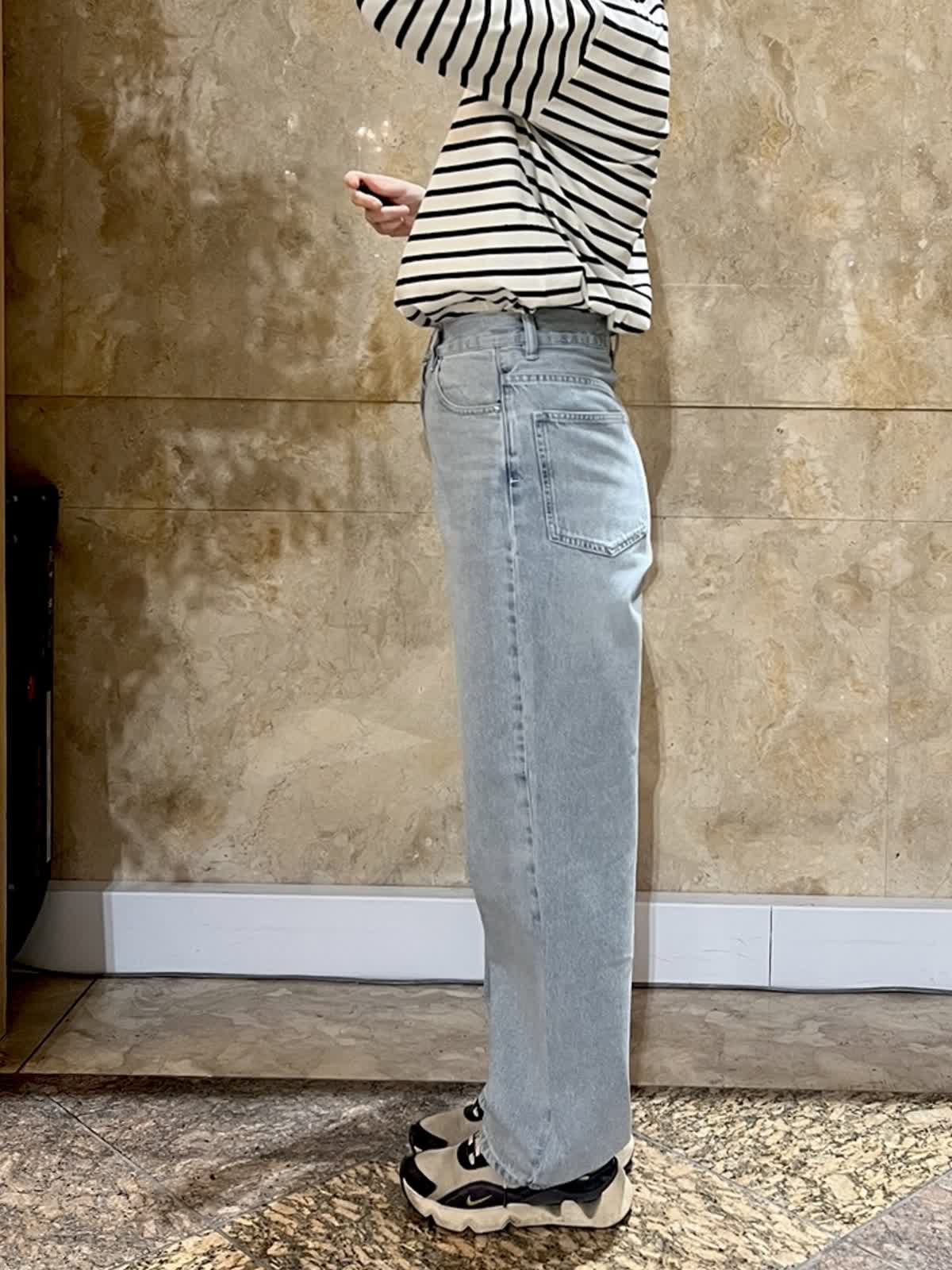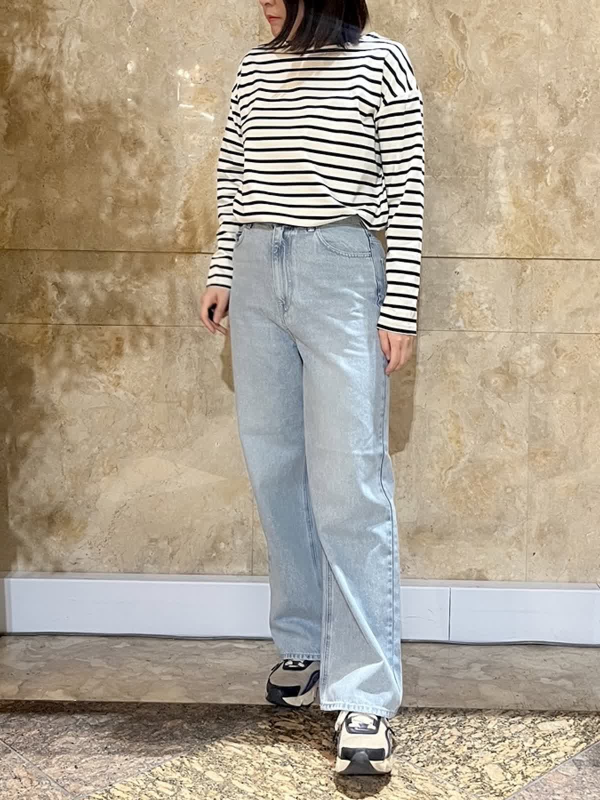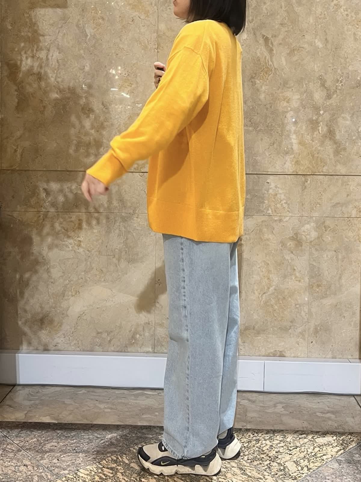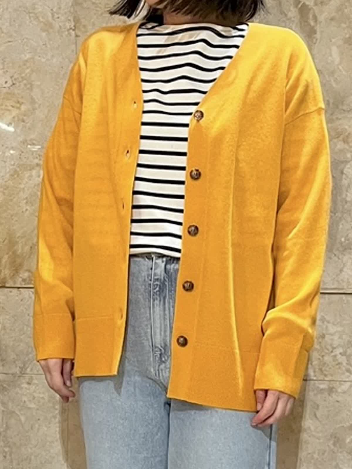 【着用サイズ/カラー】カーディガン:フリー/オレンジ ボーダーカットソー:フリー/アイボリー デニム:9号/サックス オレンジのカーディガンを主役に、ボーダーを合わせて程よくカジュアルダウンしたスタイリング。 顔まわりを明るく見せてくれるカラーながら、シンプルなデザインのため大人の方にも取り入れやすい一枚です。 デニムは新作のストレートパンツ!ダメージ加工ですがハイウエストのスッキリシルエットです。 見えないこだわりインナーステッチの赤がおしゃれポイントでデニム好きさんにはオススメの1枚。