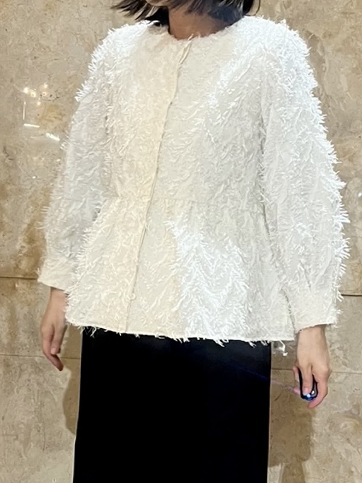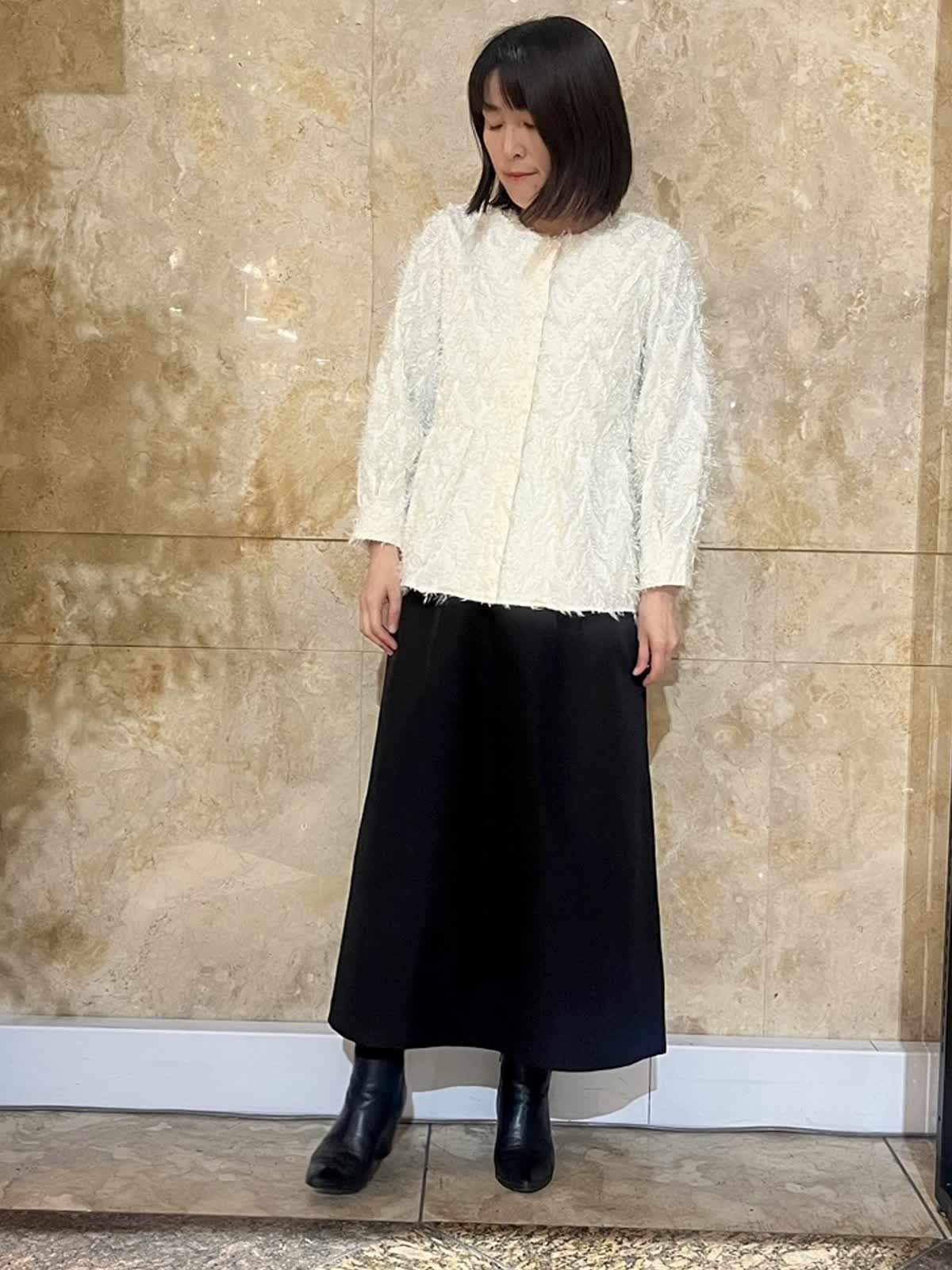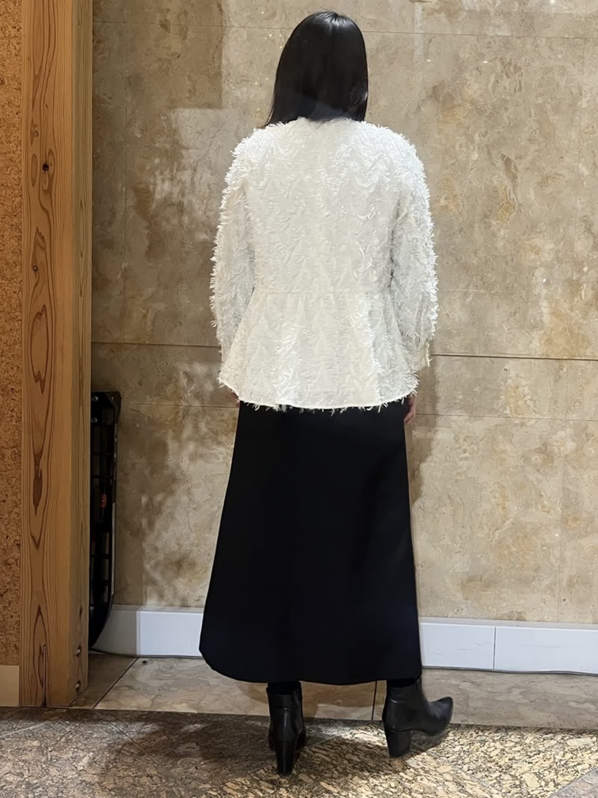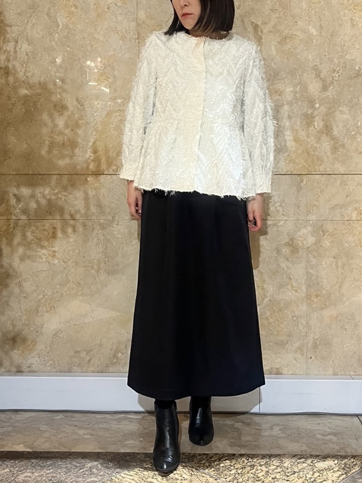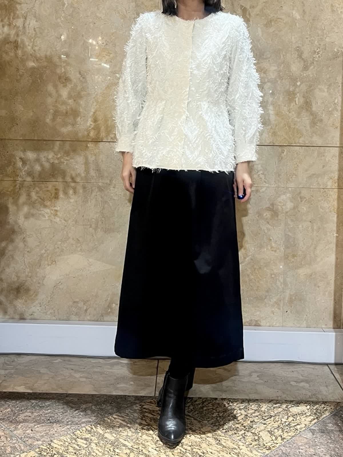 【着用サイズ/カラー】ブラウス:フリー/オフホワイト スカート:9号/ブラック 立体感のあるふわふわとした素材が印象的なコラボブラウス。 甘さが出すぎないため、ブラックのボトムと合わせることで大人っぽく着ていただけます。 シンプルなコーディネートでも華やかさをプラスしてくれるアイテムなのでセレモニー・お食事会・謝恩会など幅広い場所でご利用可能。 裏地あり、内ボタンなので開け閉めも出来ます◎ カジュアルダウンコーデはデニムがおすすめです。