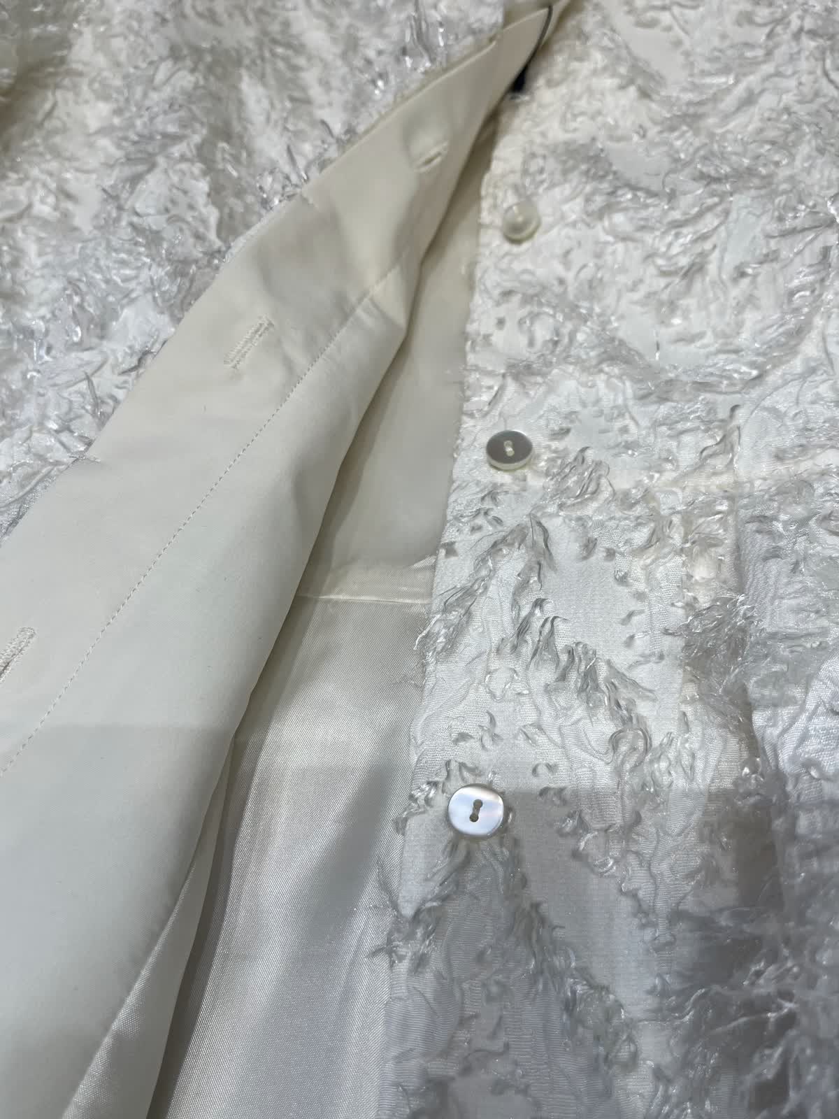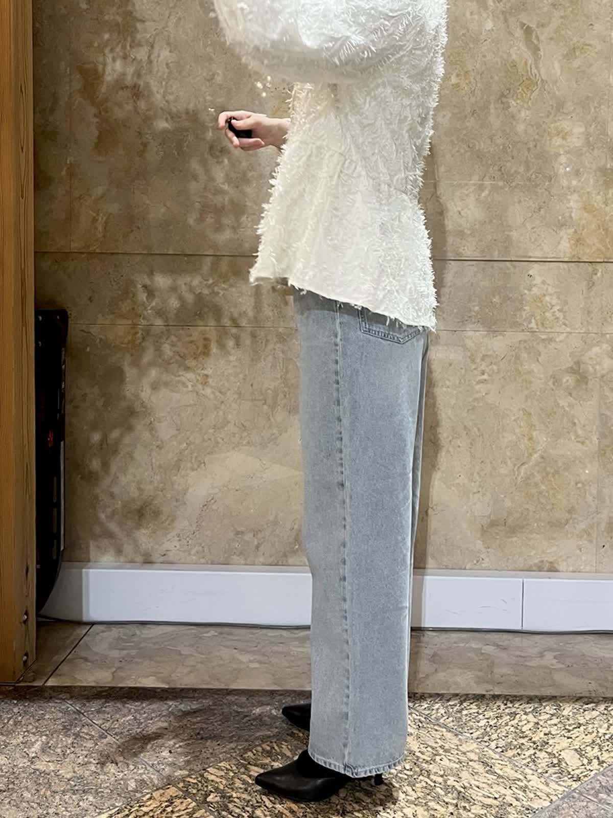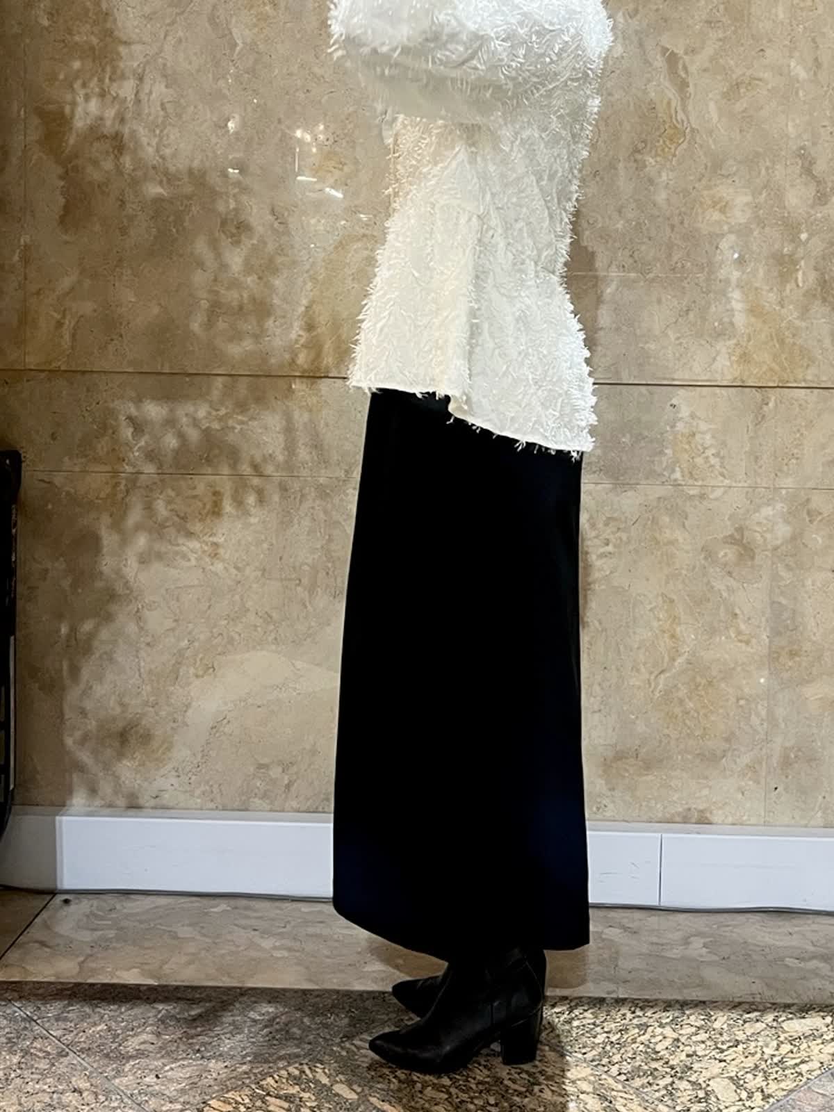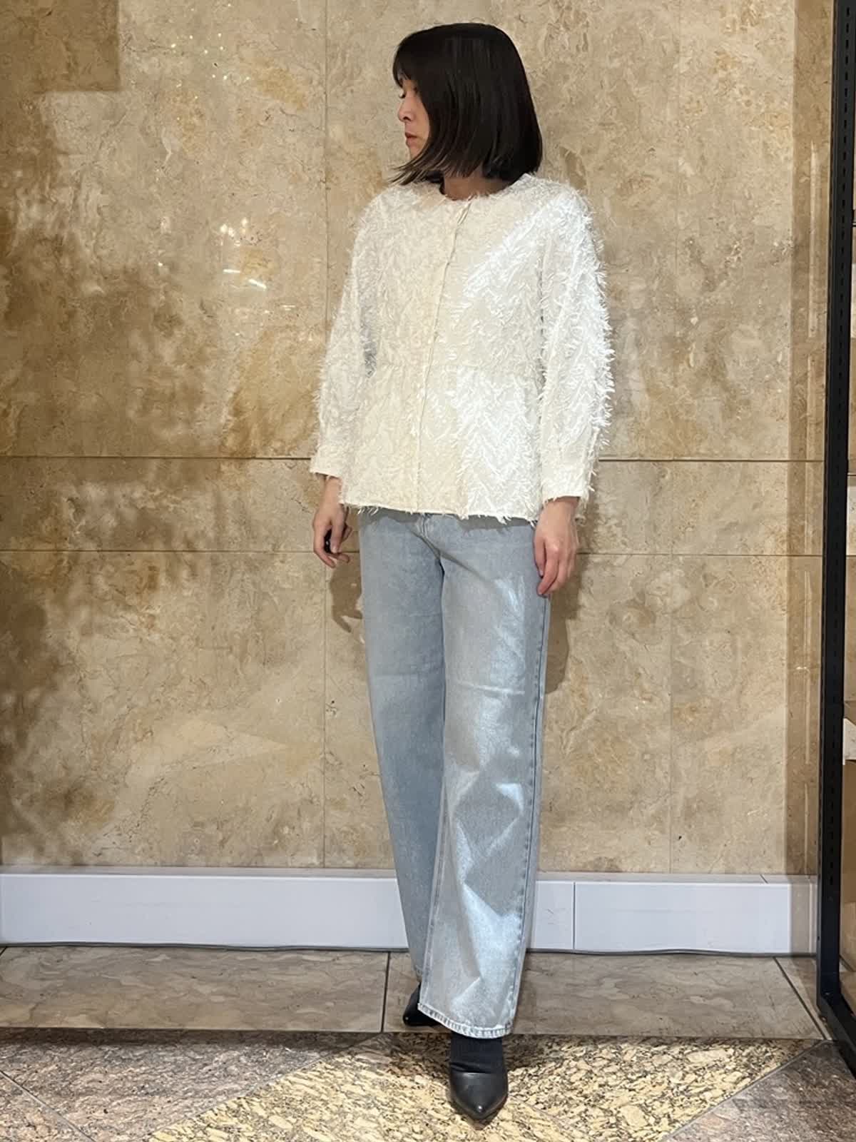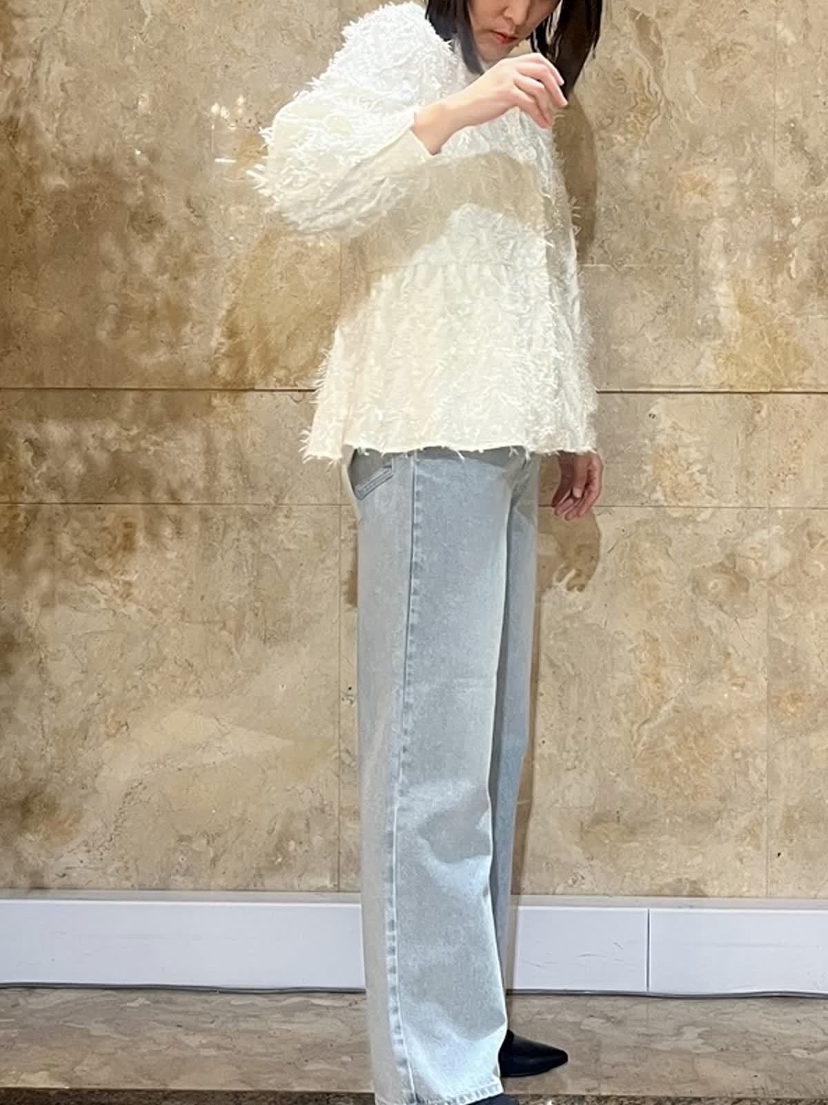 【着用サイズ/カラー】ブラウス:フリー/オフホワイト スカート:9号/ブラック 立体感のあるふわふわとした素材が印象的なコラボブラウス。 甘さが出すぎないため、ブラックのボトムと合わせることで大人っぽく着ていただけます。 シンプルなコーディネートでも華やかさをプラスしてくれるアイテムなのでセレモニー・お食事会・謝恩会など幅広い場所でご利用可能。 裏地あり、内ボタンなので開け閉めも出来ます◎ カジュアルダウンコーデはデニムがおすすめです。
