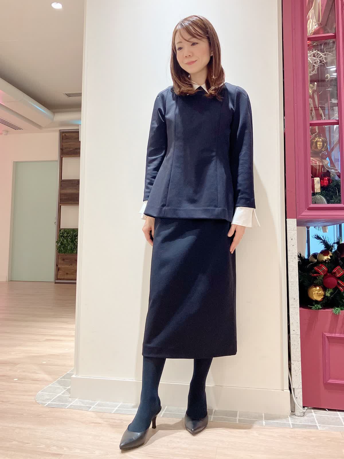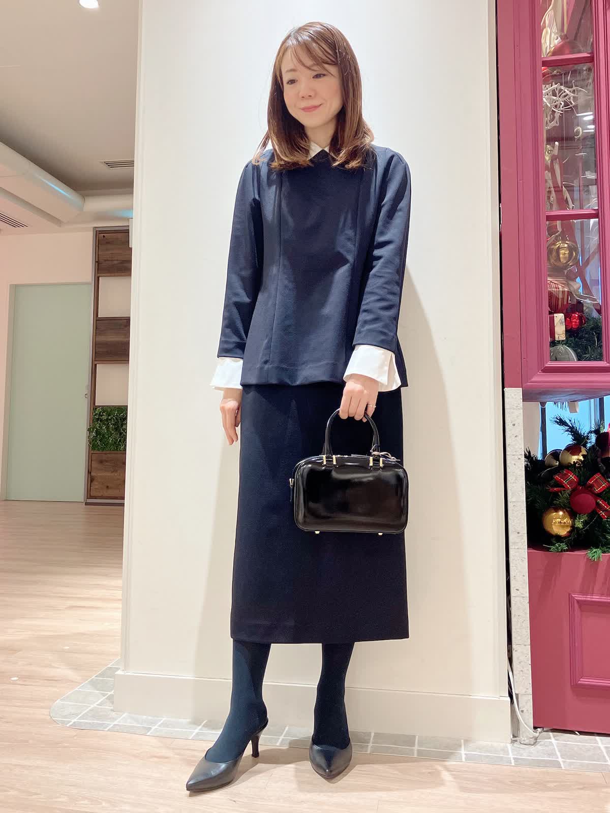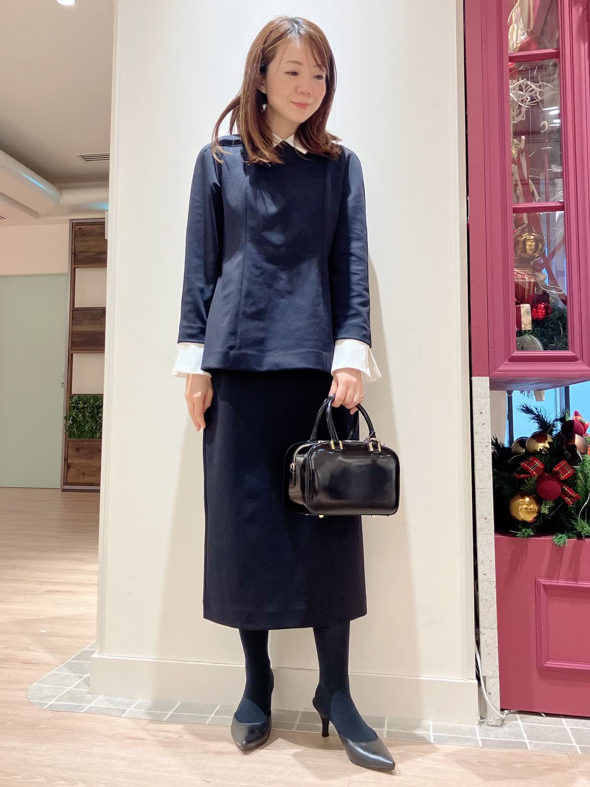 【着用サイズ】ブラウス:9号 スカート:7号 【着用カラー】ブラウス:ネイビー スカート:ネイビー コーディネートのテーマはフェミニンセレモニースタイリングです。 襟と袖口が取り外しできる汎用性の高いデザインブラウスです。ほんのりペプラムでAラインが女性らしいシルエットで、セットアップのタイトスカートとの相性もばっちり。ジャケット要らずでもきちんと感の出せるセレモニースタイルにおすすめです。