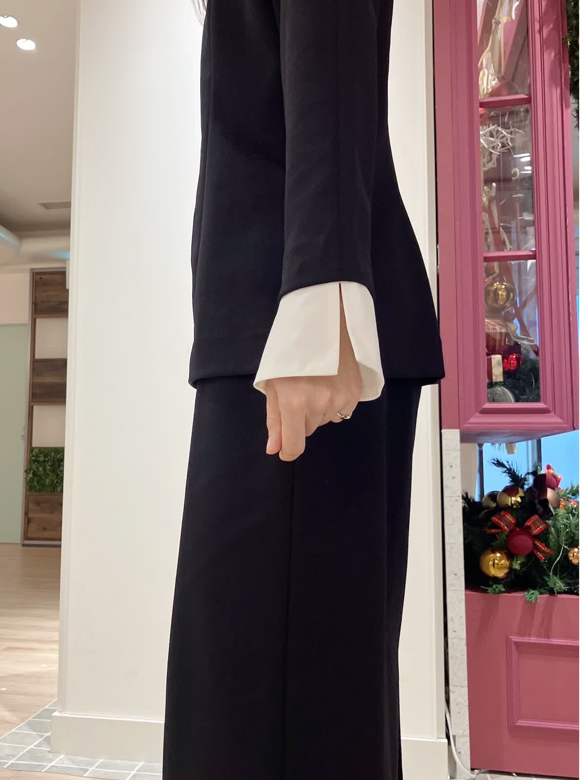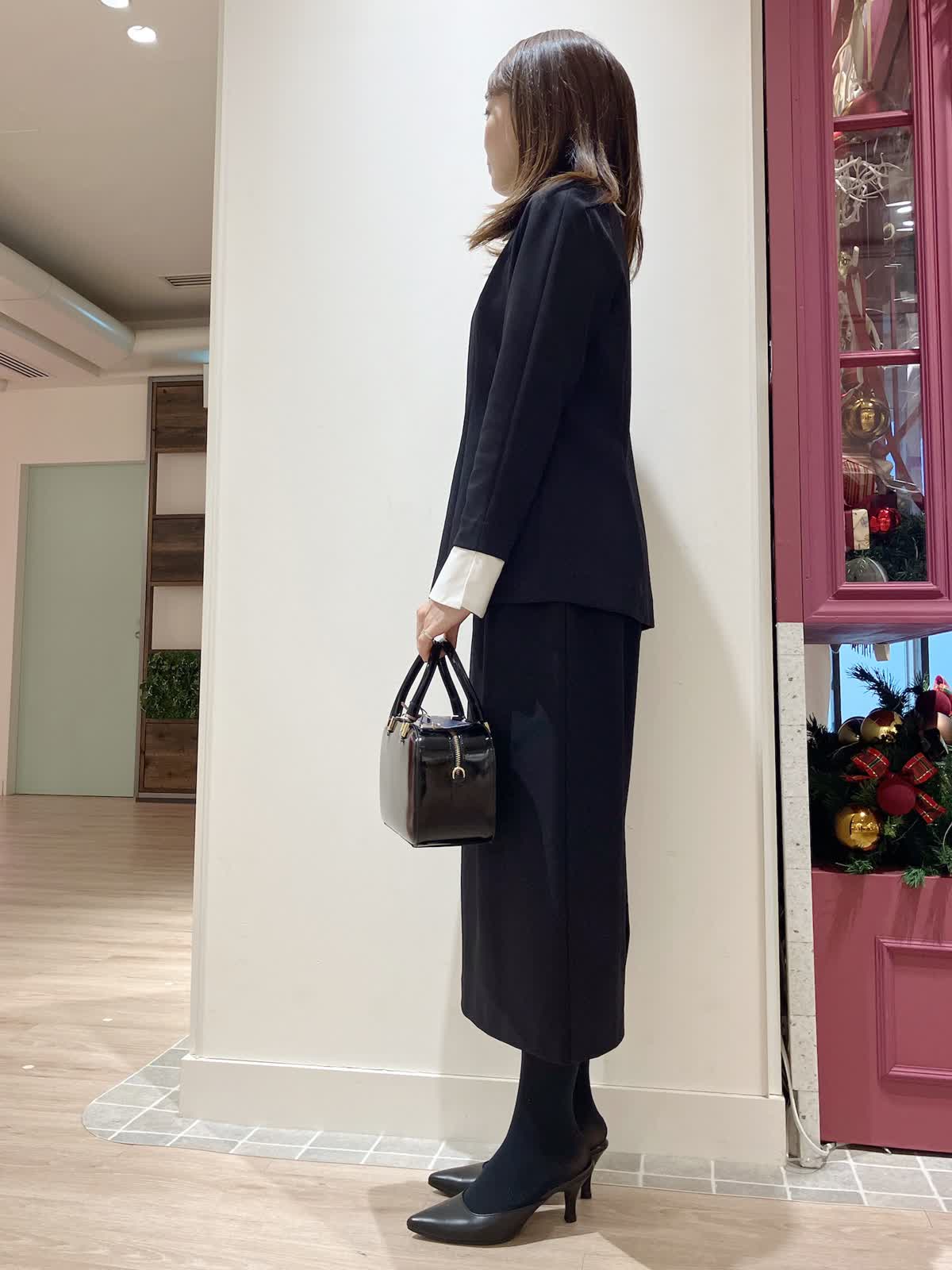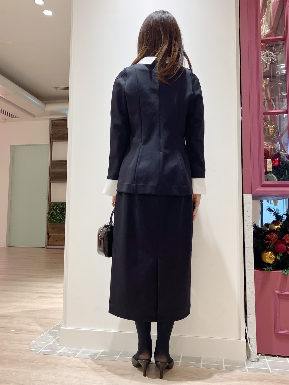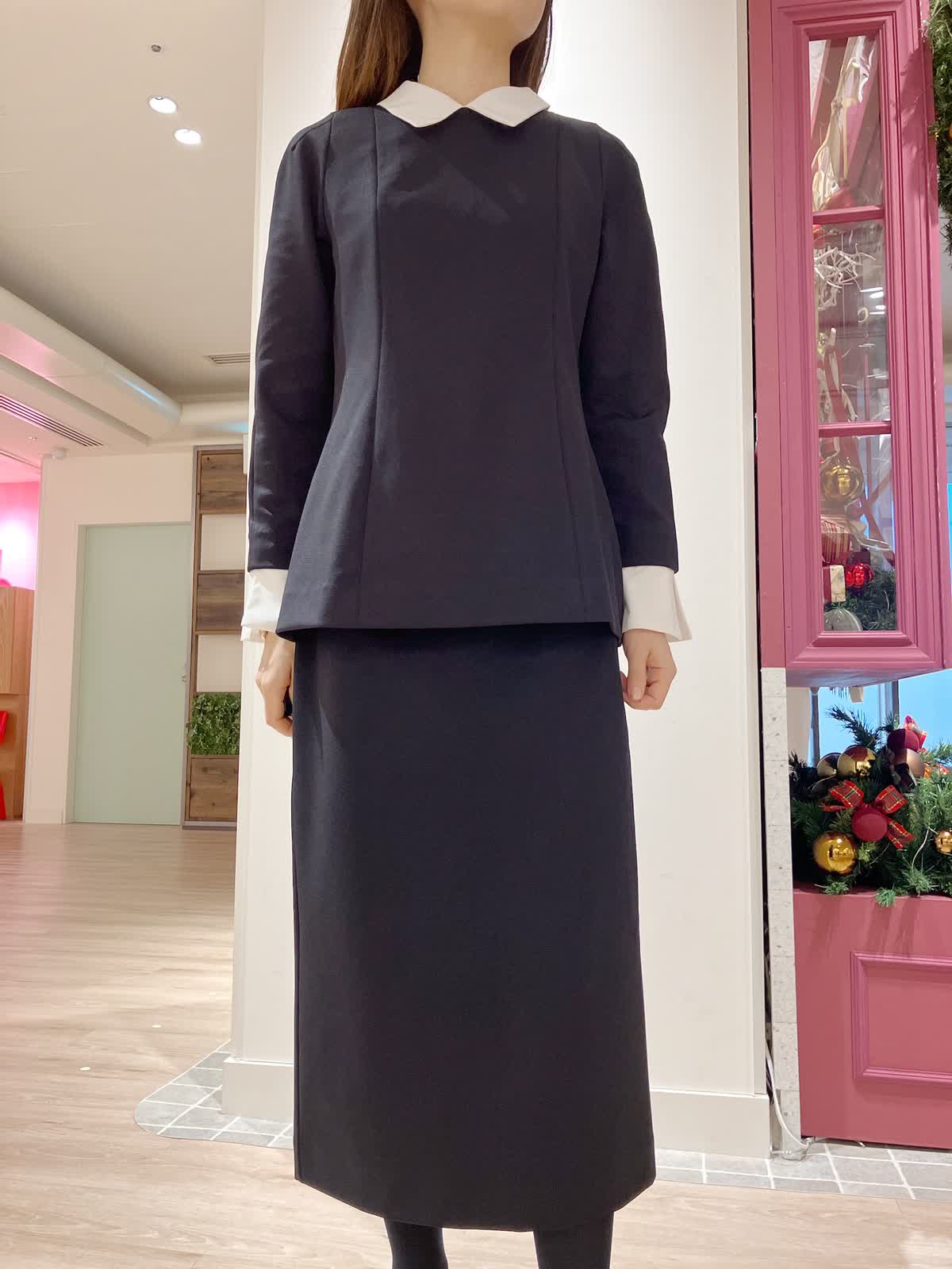 【着用サイズ】ブラウス:9号 スカート:7号 【着用カラー】ブラウス:ネイビー スカート:ネイビー コーディネートのテーマはフェミニンセレモニースタイリングです。 襟と袖口が取り外しできる汎用性の高いデザインブラウスです。ほんのりペプラムでAラインが女性らしいシルエットで、セットアップのタイトスカートとの相性もばっちり。ジャケット要らずでもきちんと感の出せるセレモニースタイルにおすすめです。