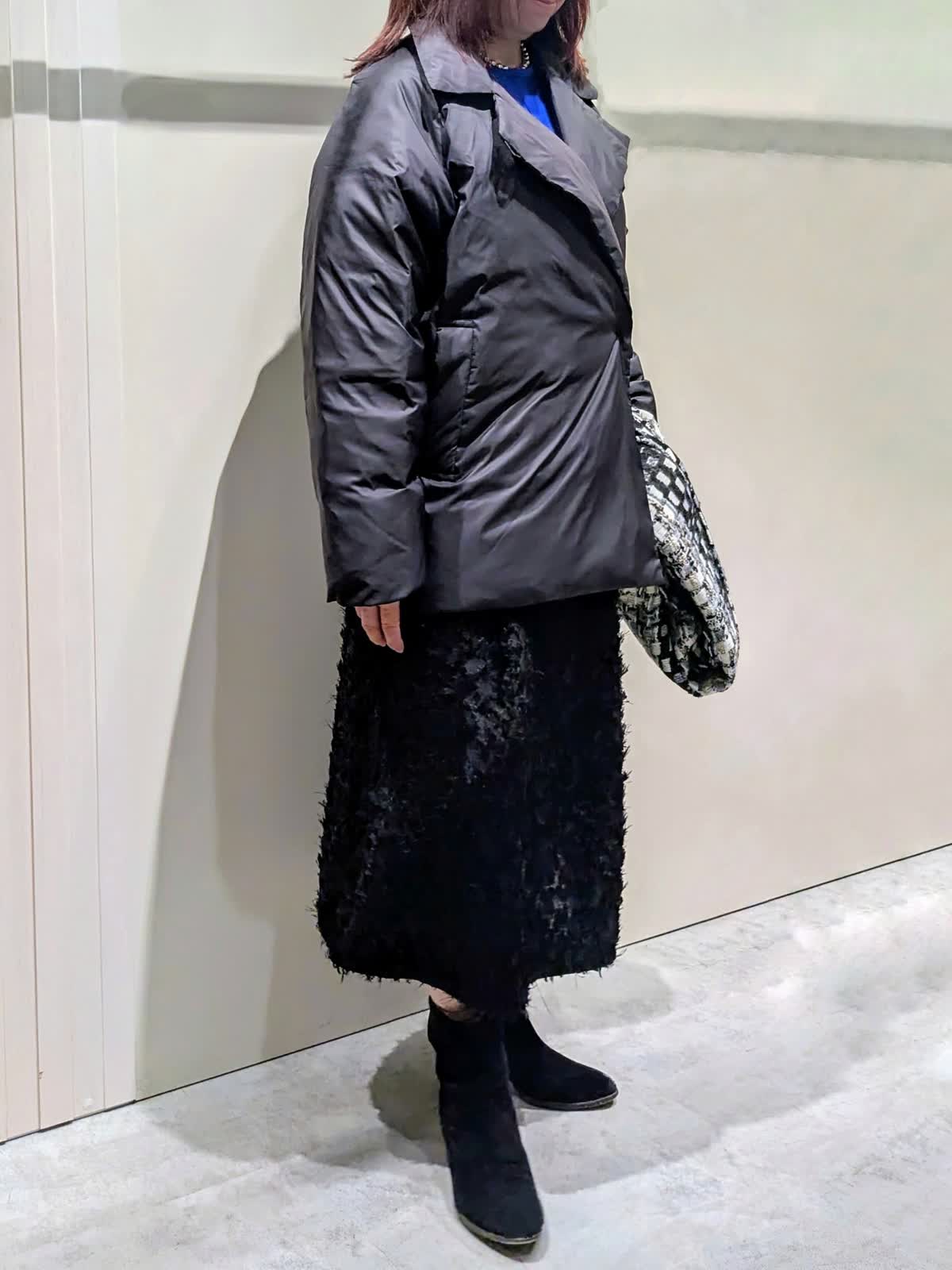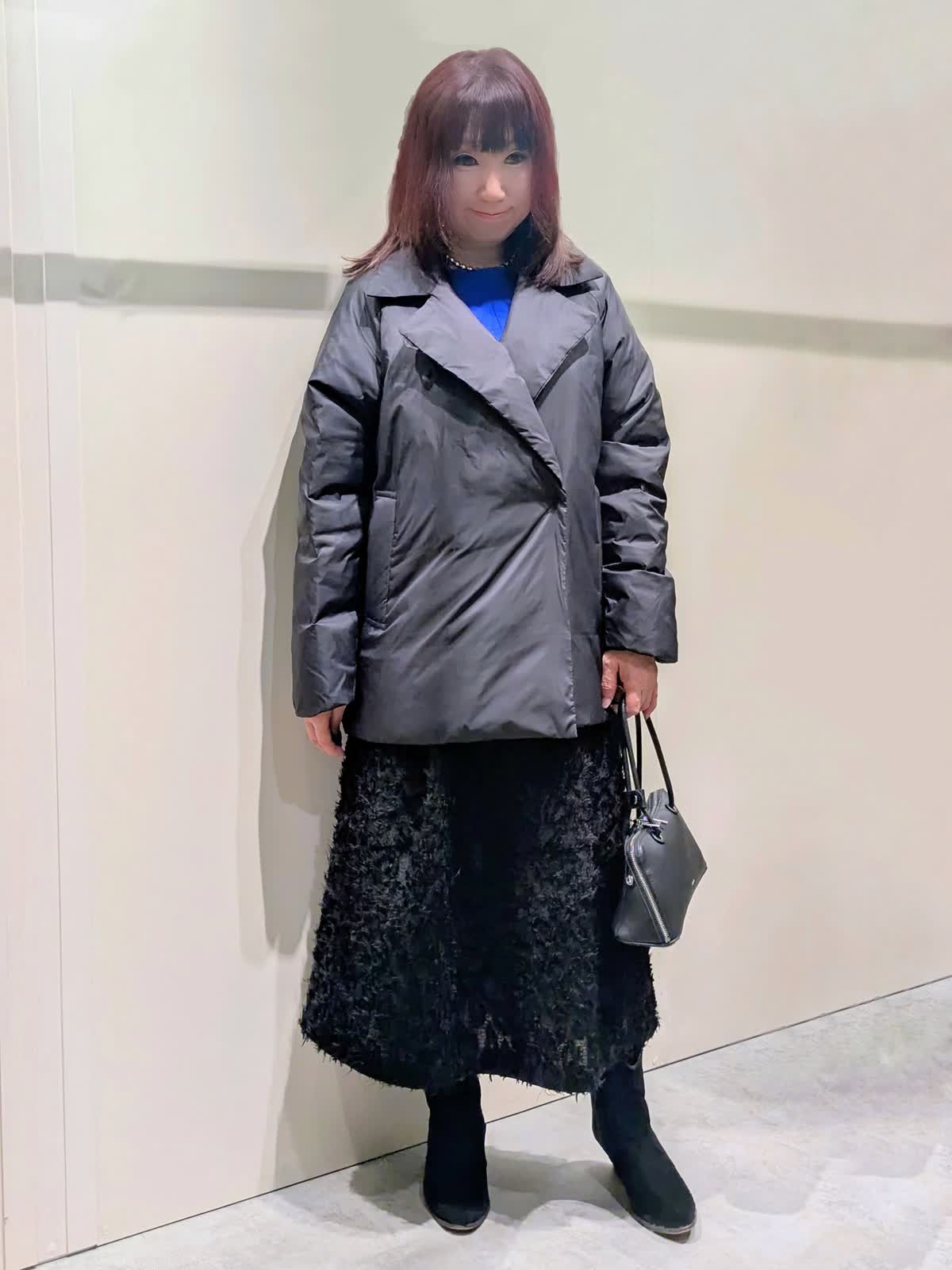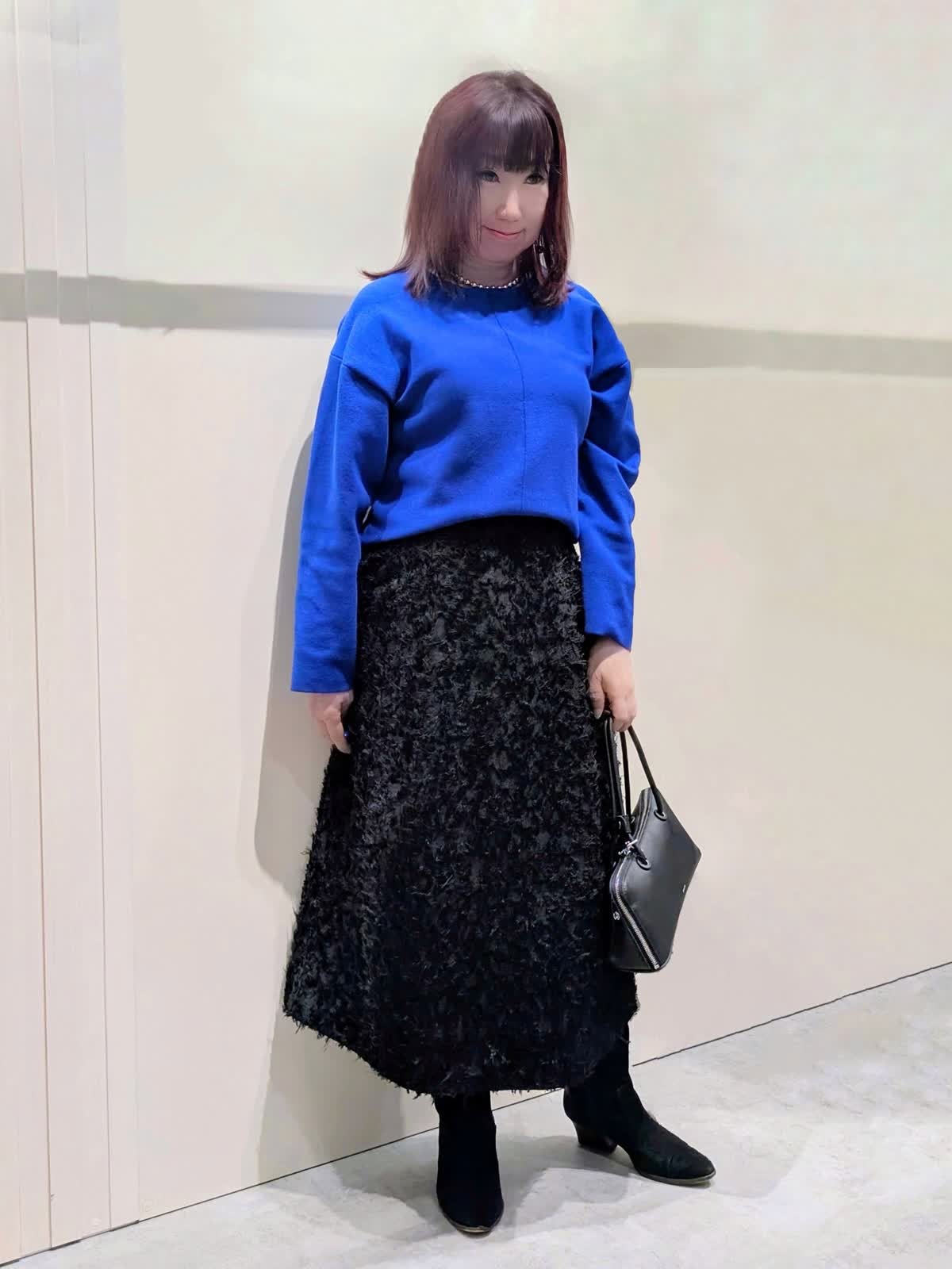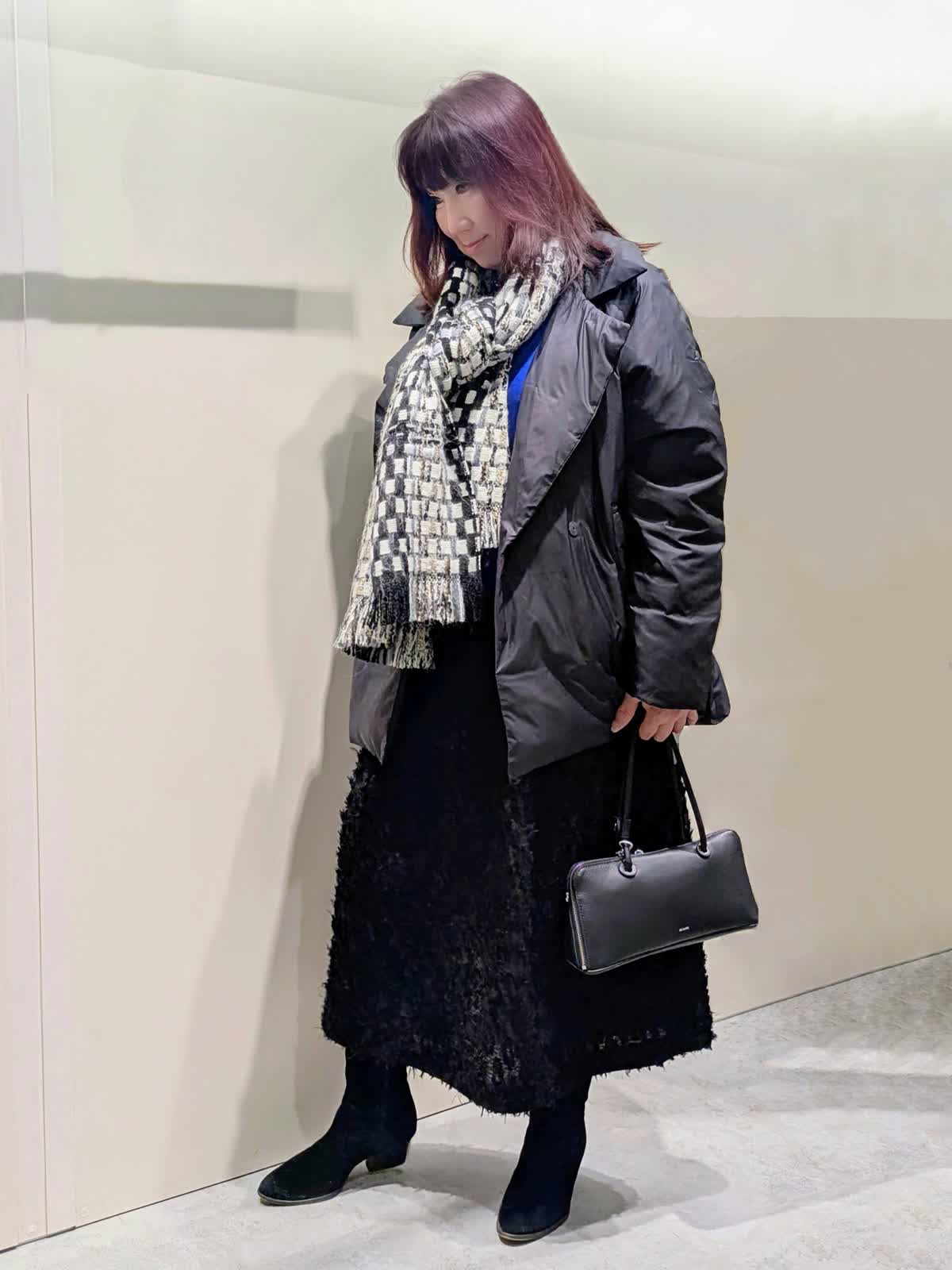 【着用サイズ】プルオーバー:フリー コート、スカート:9号【着用カラー】コート、スカート:ブラック プルオーバー:ブルー ブルーコーディネート 軽くて、保温性・撥水防水効果もある暖かダウンコートは、上品なマット生地でピーコート風のデザインがポイントです。ゆとりのあるサイズ感と程良い丈感で気軽に羽織れてボトムを選びません。鮮やかなブルーのプルオーバーは、緩すぎない程良いサイズ感ながら身体のラインを拾わず、スッキリ見せてくれます。コートインナーの差し色にもなる綺麗なお色目です。フリンジ仕様のカットジャガードのスカートは、ややストレートなフレアシルエットで、上品な印象です。ウエスト後ろゴム仕様で、快適なはき心地でサテンテープのファスナーの引手がアクセントに…存在感のあるスタイリングのアクセントになる1枚です。