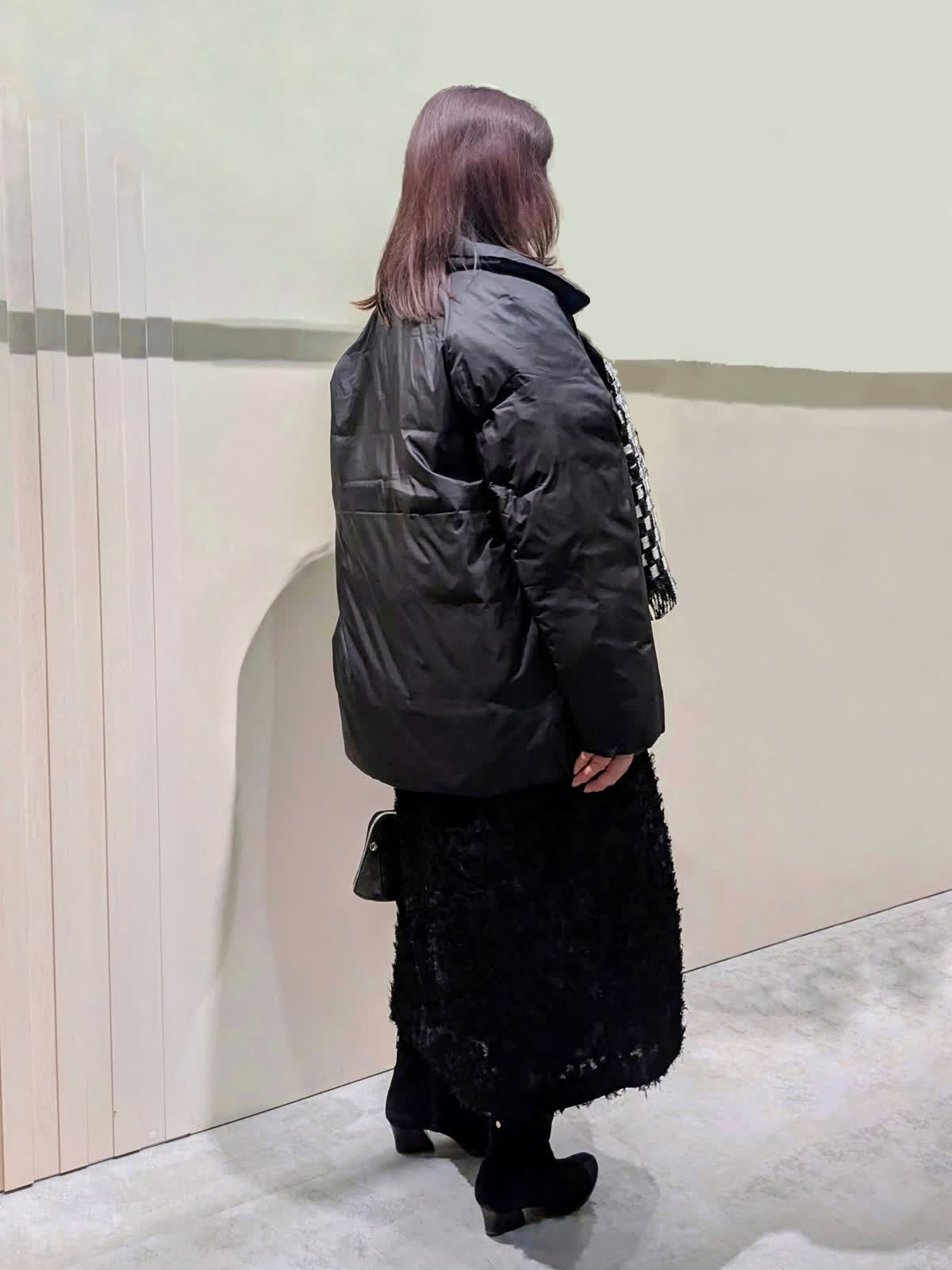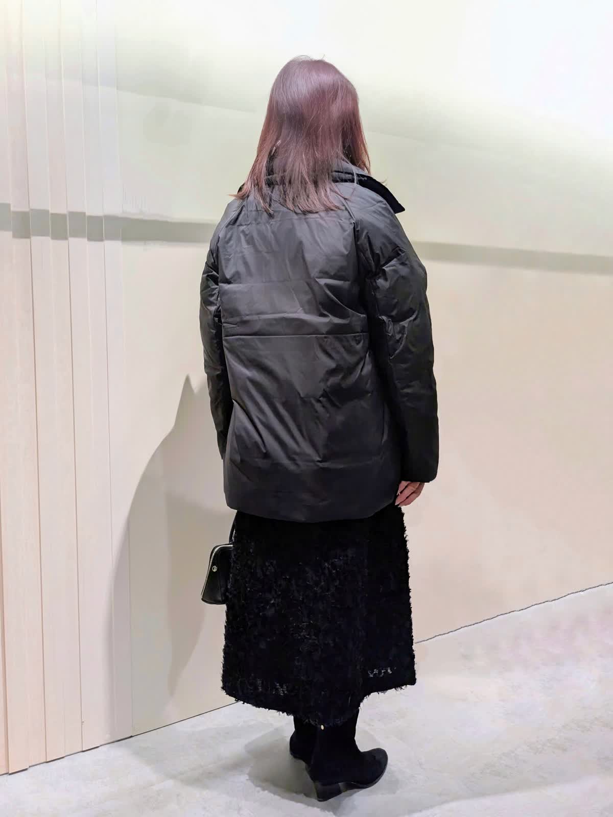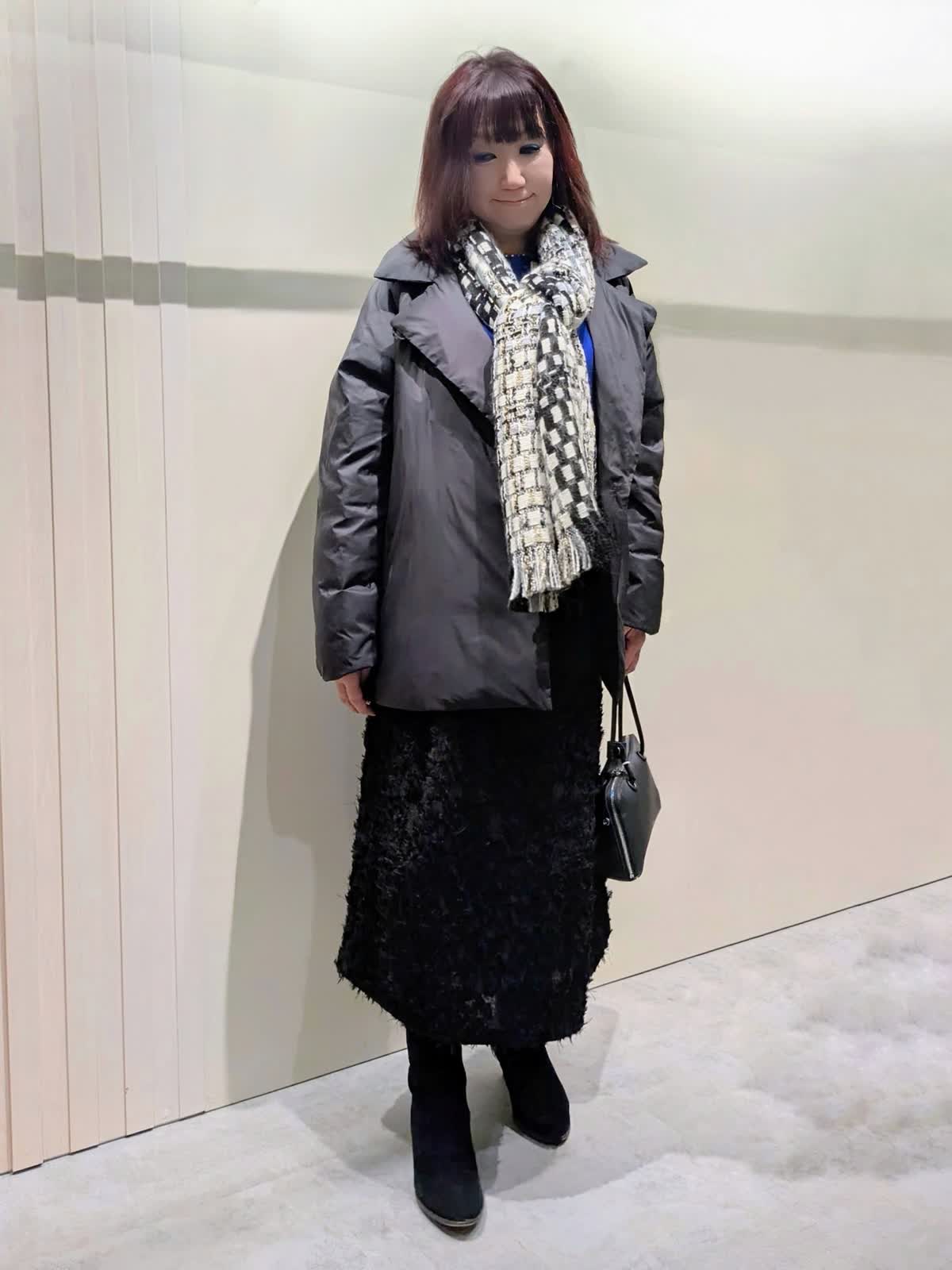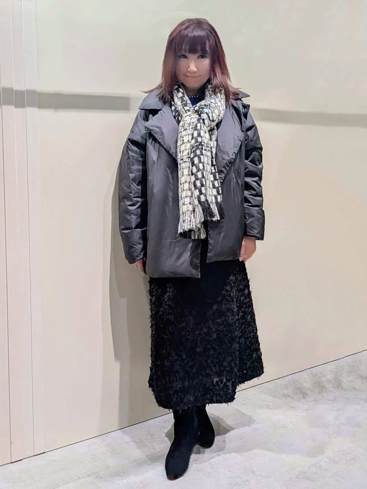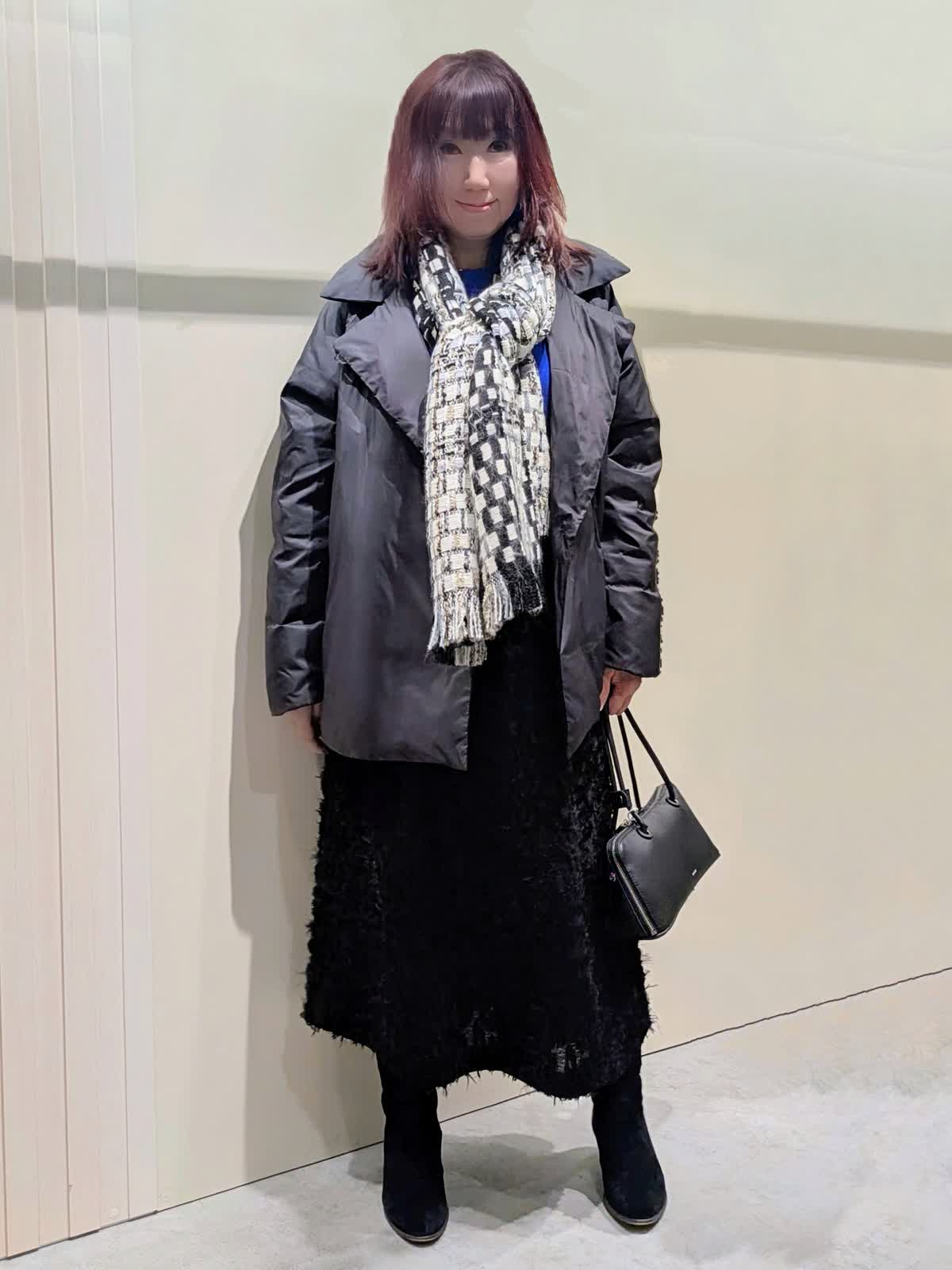 【着用サイズ】プルオーバー:フリー コート、スカート:9号【着用カラー】コート、スカート:ブラック プルオーバー:ブルー ブルーコーディネート 軽くて、保温性・撥水防水効果もある暖かダウンコートは、上品なマット生地でピーコート風のデザインがポイントです。ゆとりのあるサイズ感と程良い丈感で気軽に羽織れてボトムを選びません。鮮やかなブルーのプルオーバーは、緩すぎない程良いサイズ感ながら身体のラインを拾わず、スッキリ見せてくれます。コートインナーの差し色にもなる綺麗なお色目です。フリンジ仕様のカットジャガードのスカートは、ややストレートなフレアシルエットで、上品な印象です。ウエスト後ろゴム仕様で、快適なはき心地でサテンテープのファスナーの引手がアクセントに…存在感のあるスタイリングのアクセントになる1枚です。