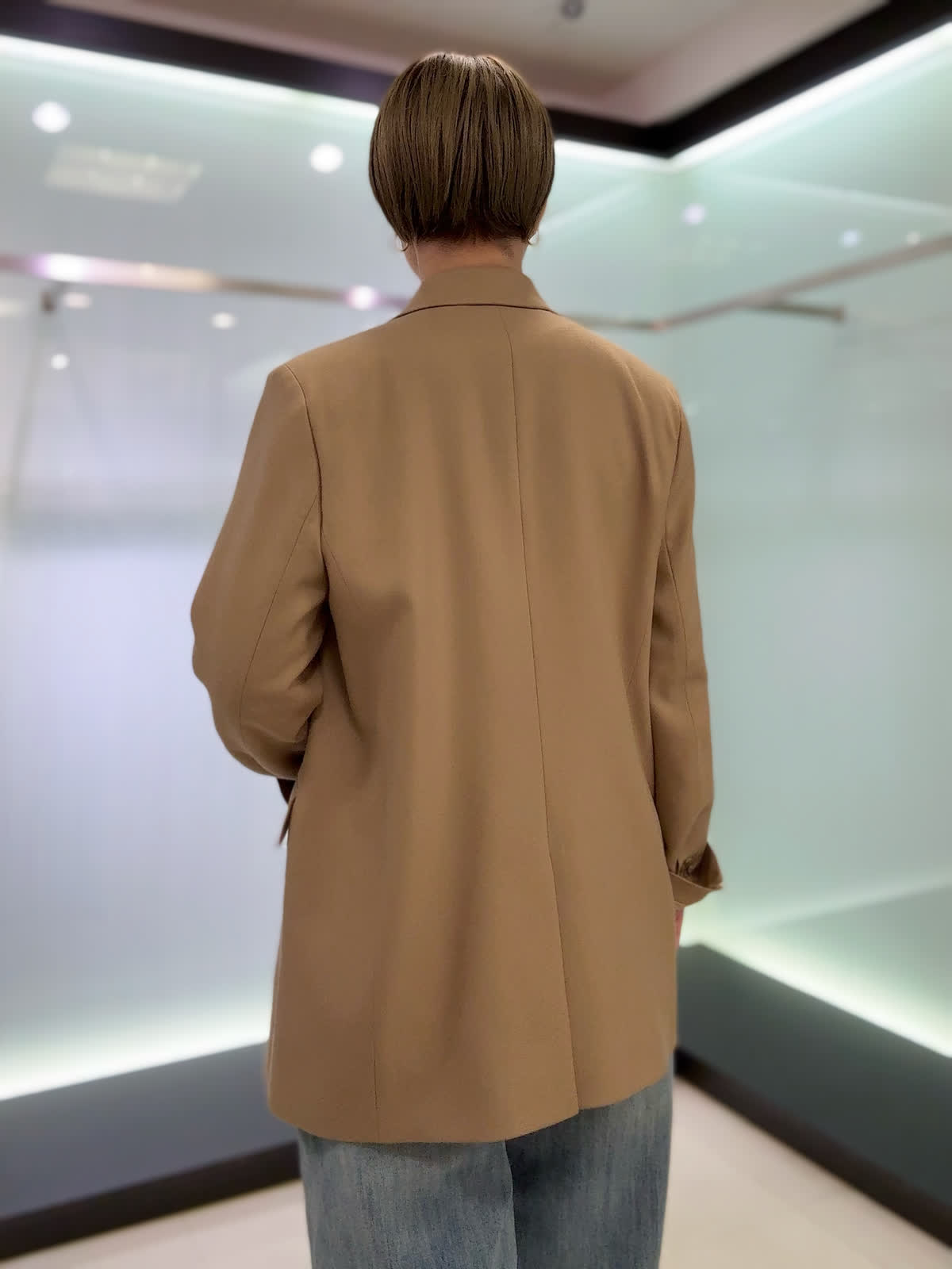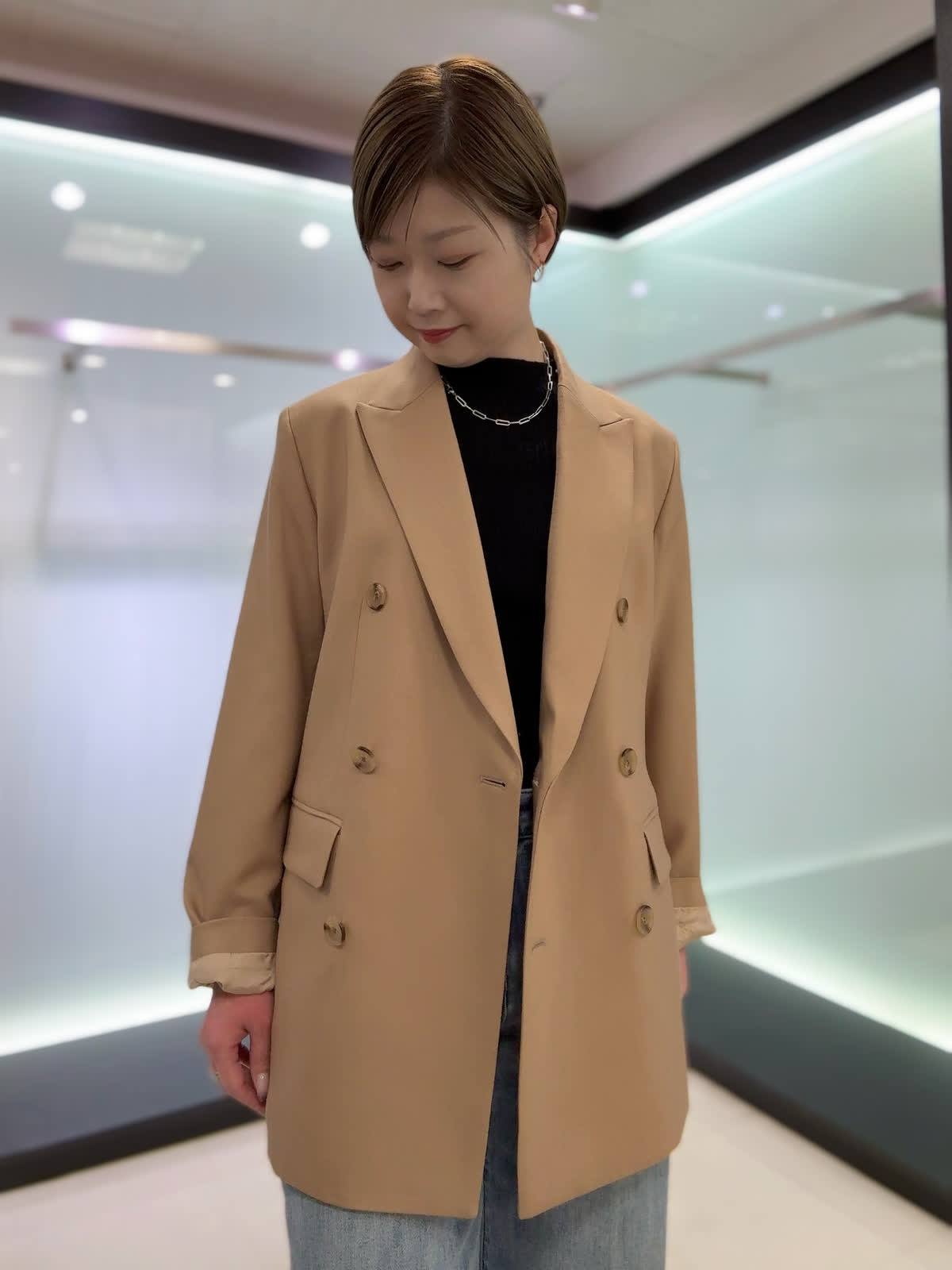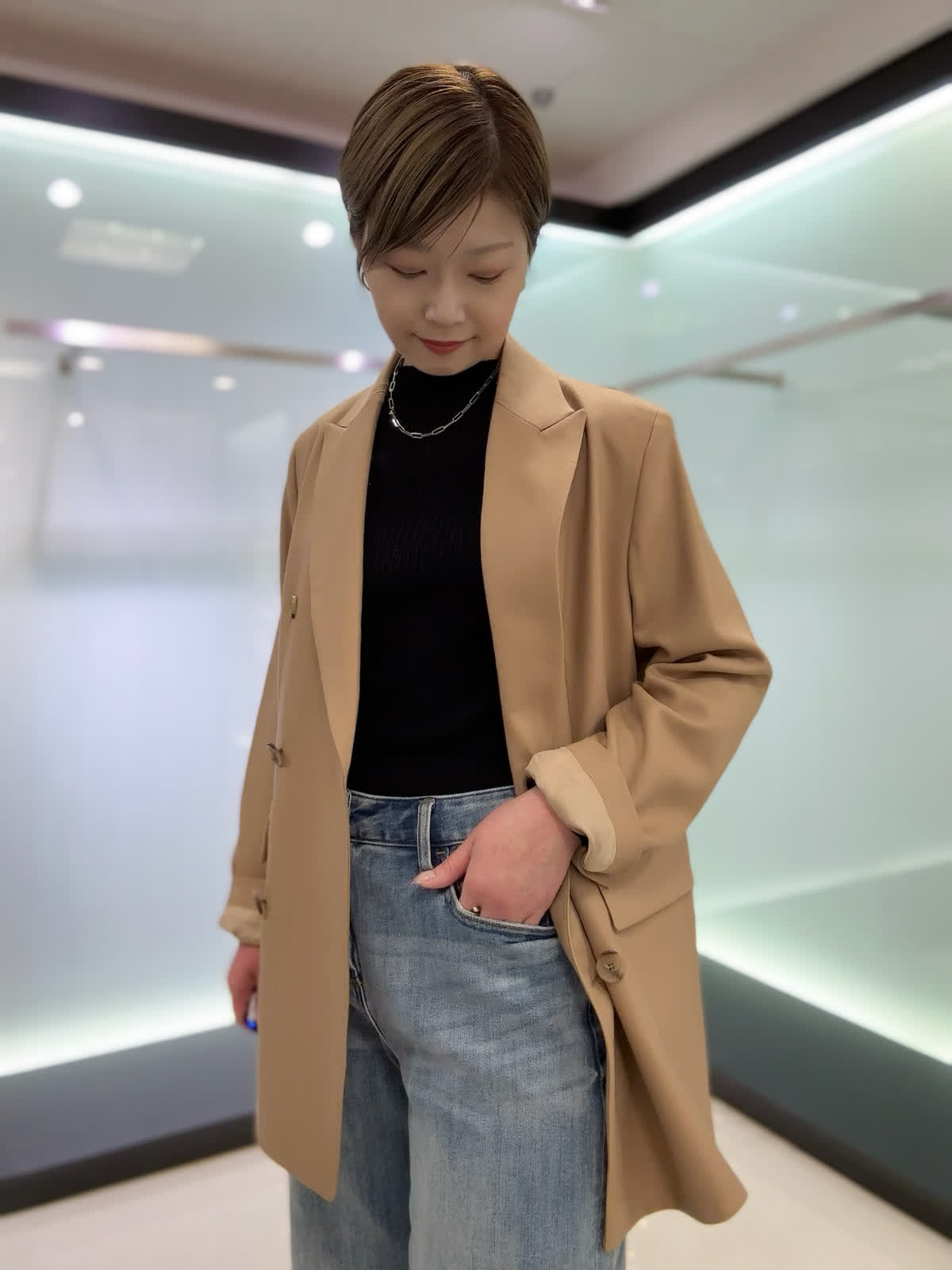 【着用カラー・サイズ】ジャケット : キャメル/9号 ニット : ブラック/9号 パンツ : サックス/11号 三尋木奈保さんコラボのジャケットにデニムを合わせた大人カジュアルコーデ♪デイリーに着られるジャケットで合わせるアイテムによってエレガントなスタイルも楽しめます。