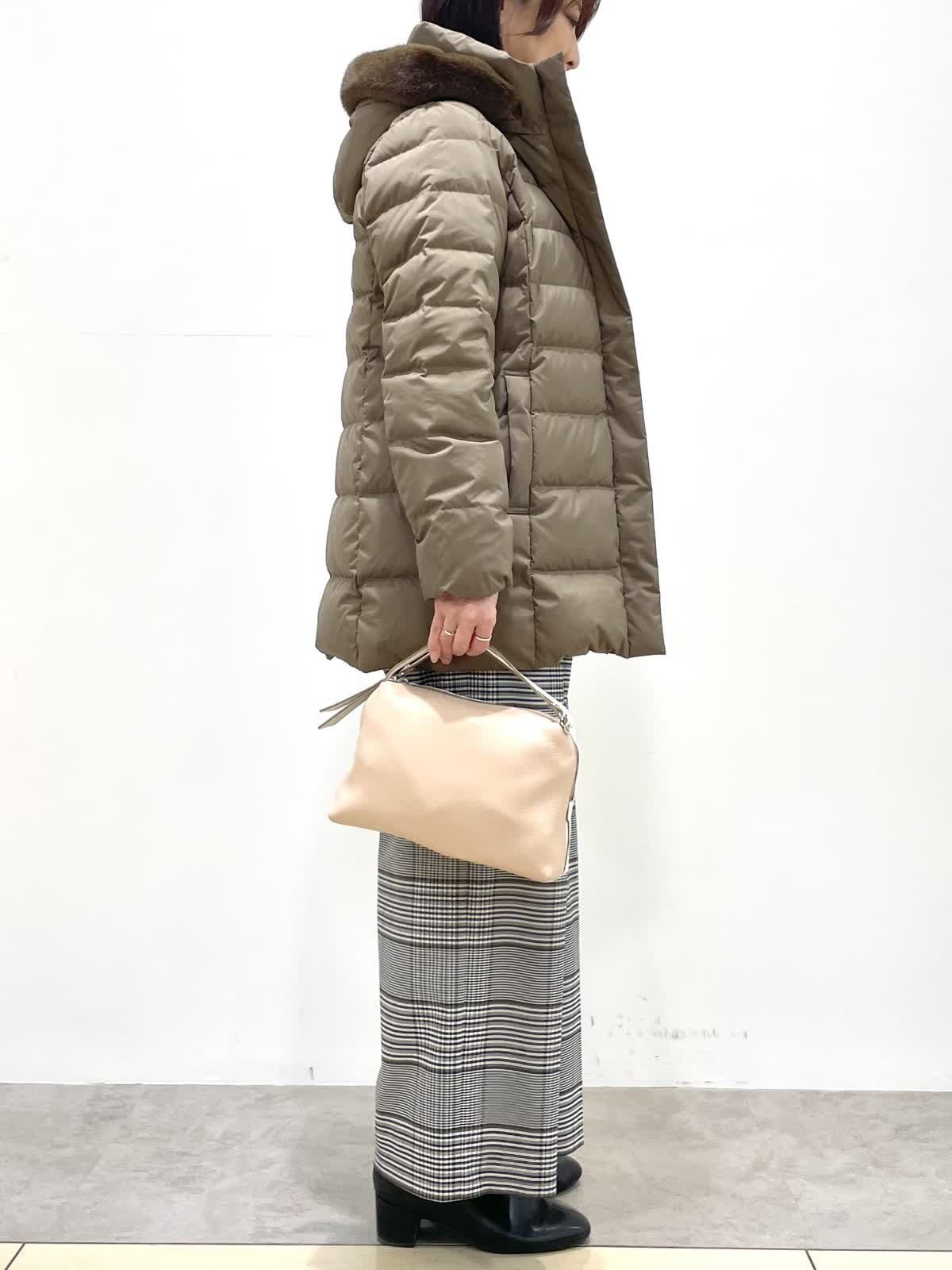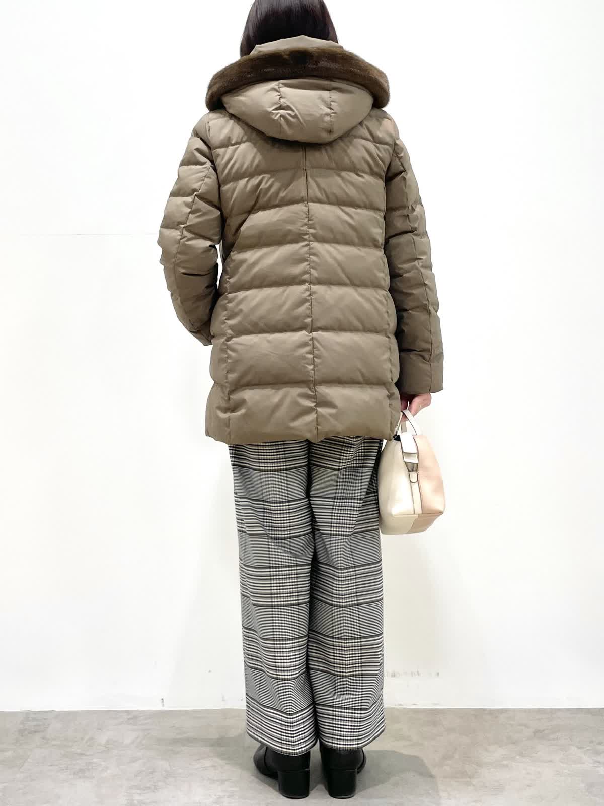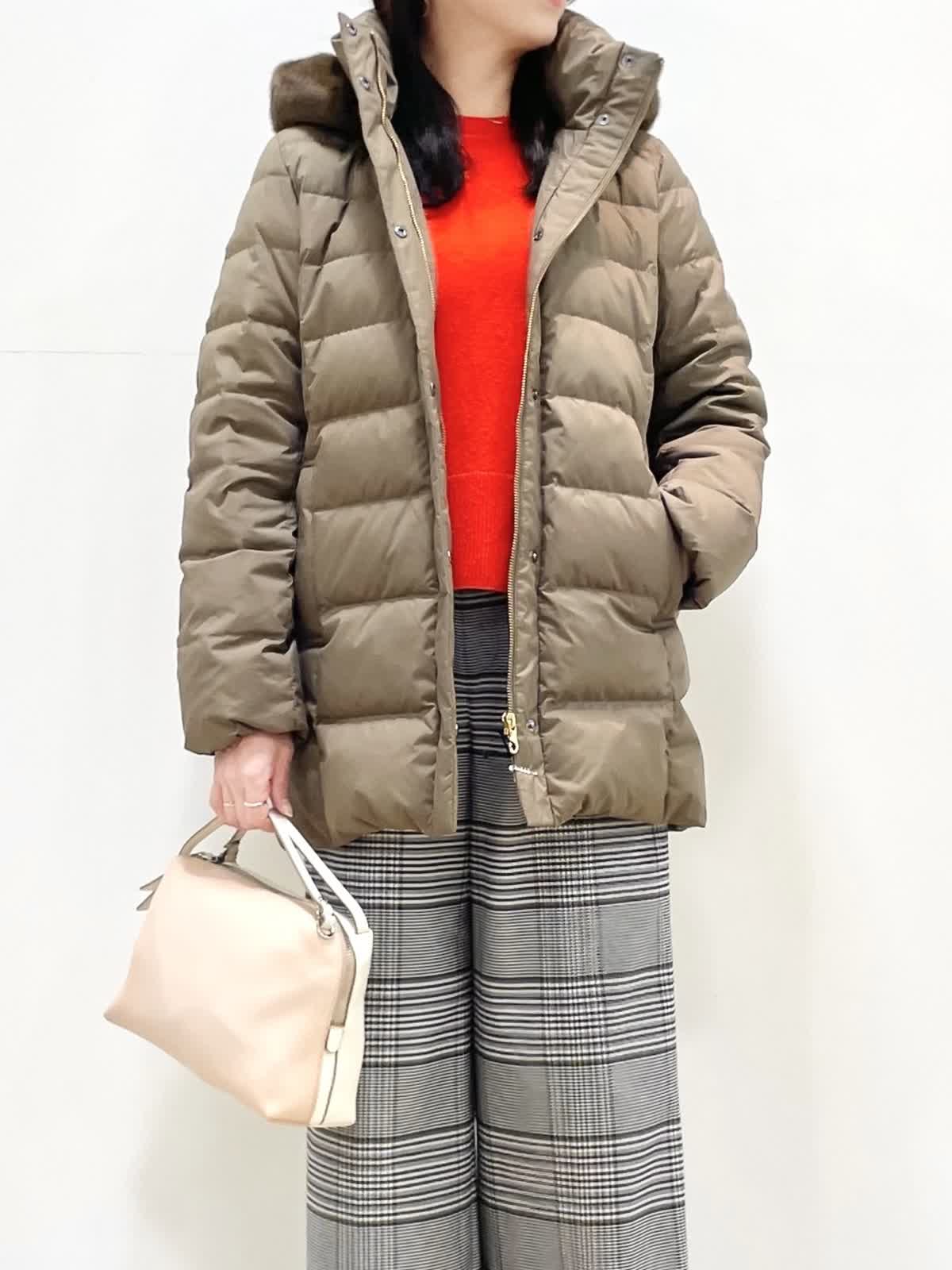 【着用サイズ】全て9号 【着用カラー】ダウン:モカチャ ニット:シュイロ パンツ:柄大 着膨れの心配なし!すっきりダウンスタイル。大きく見えすぎない女性らしいシルエットのダウンコート。ヒップが隠れるミドル丈でバランスの取りやすい着丈です。フード、ファーは取り外し可能です。