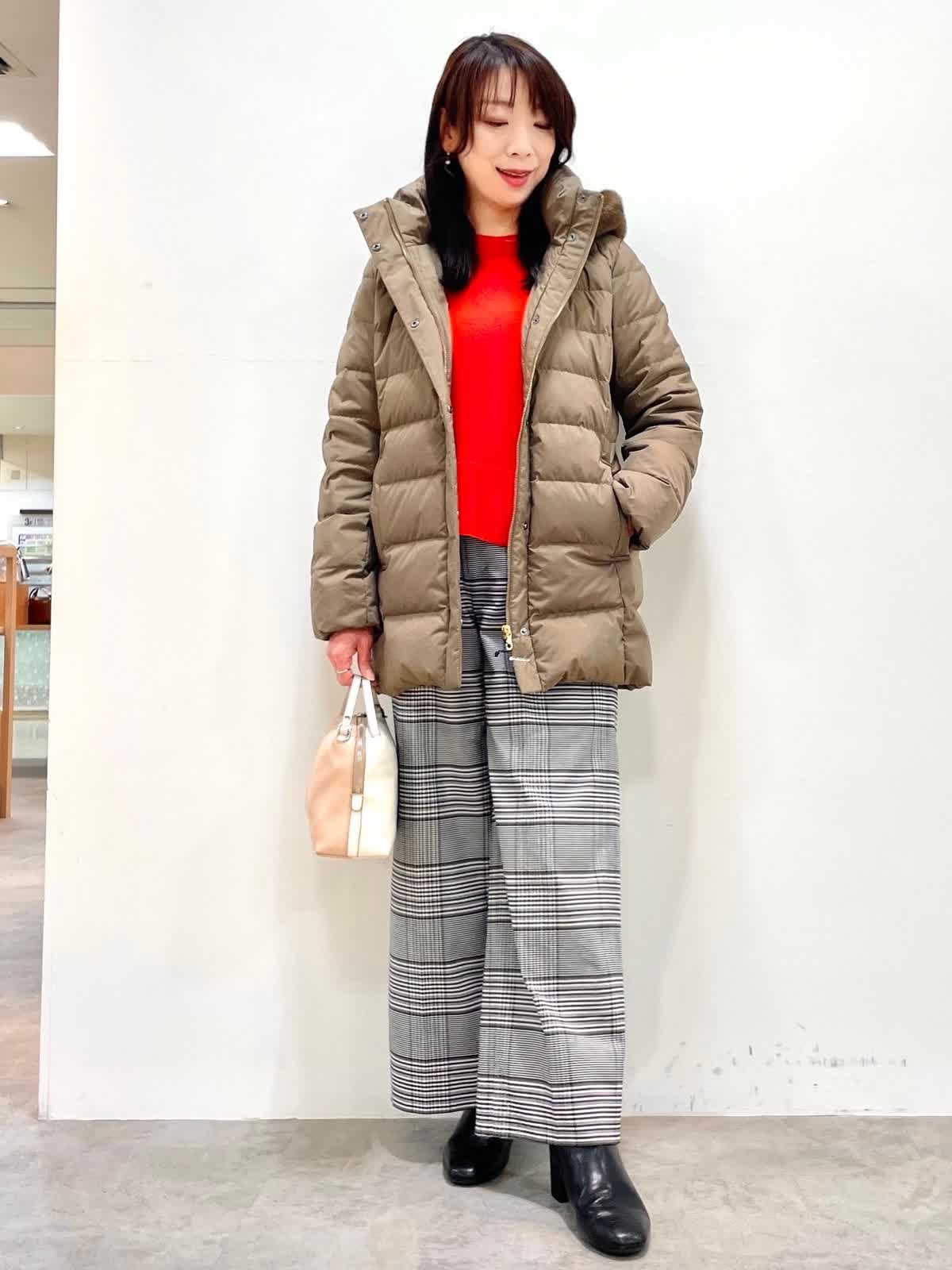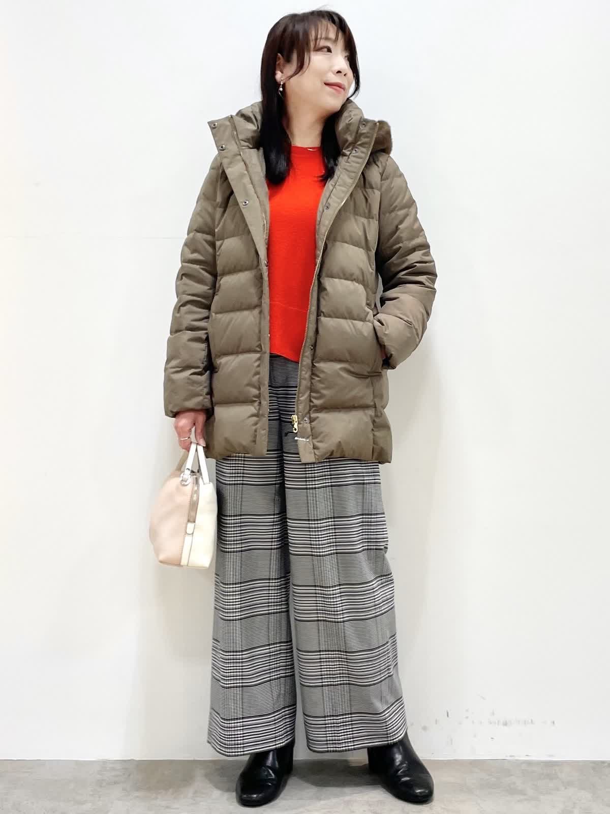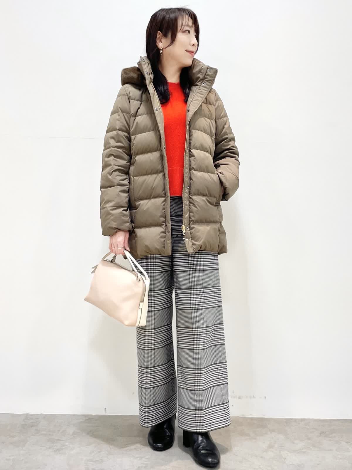 【着用サイズ】全て9号 【着用カラー】ダウン:モカチャ ニット:シュイロ パンツ:柄大 着膨れの心配なし!すっきりダウンスタイル。大きく見えすぎない女性らしいシルエットのダウンコート。ヒップが隠れるミドル丈でバランスの取りやすい着丈です。フード、ファーは取り外し可能です。