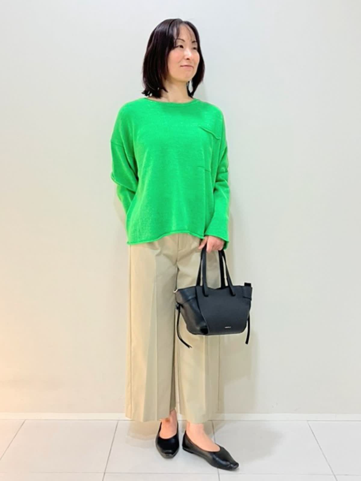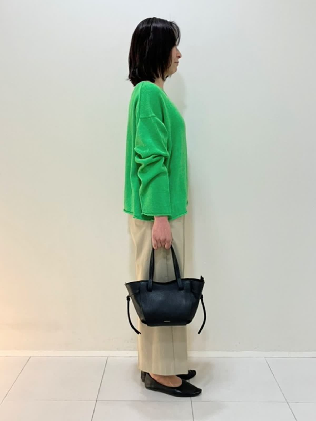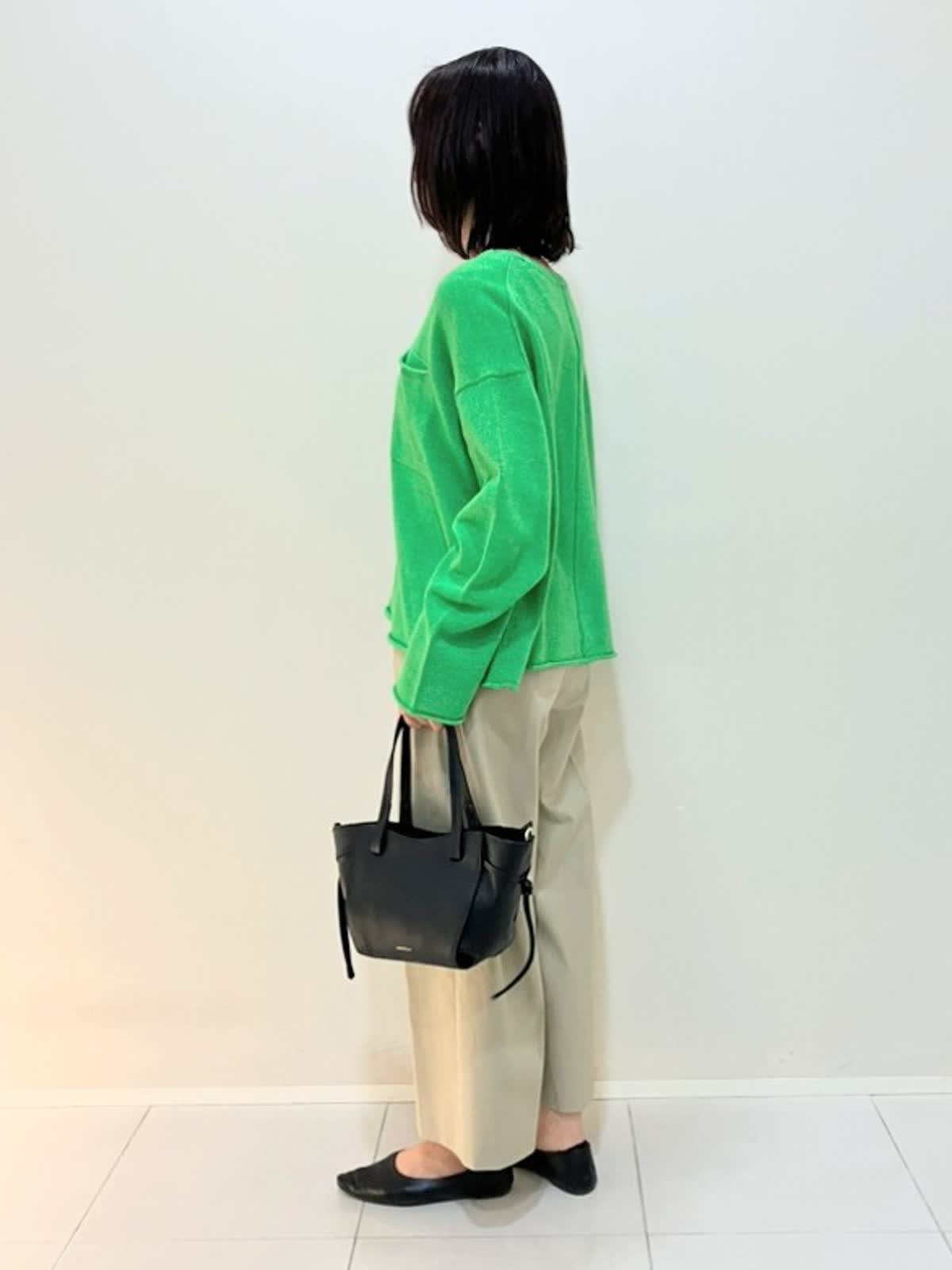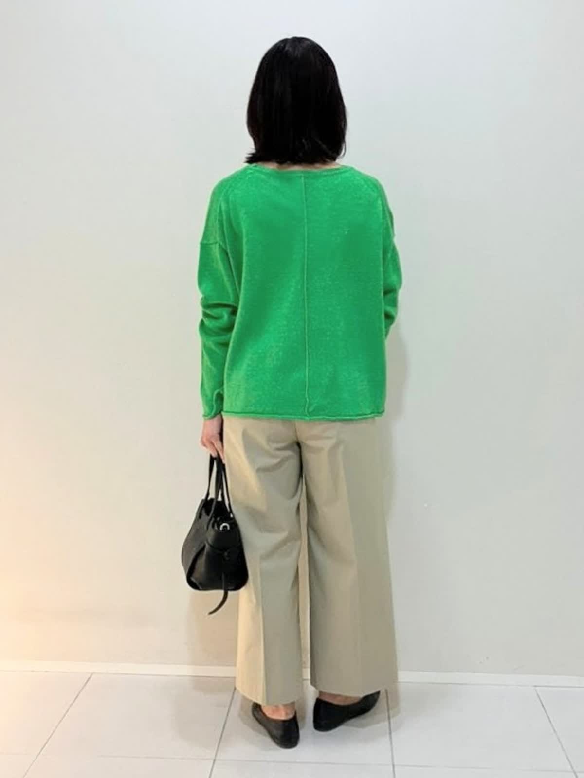 【着用サイズ】ニット:フリー パンツ:7号【着用カラー】ニット:グリーン パンツ:キャメル 春のカジュアルスタイル ニットはサラッとした着心地で、ウールが入っているので肌寒い時期からも着やすいアイテムです。パンツは足元がスッキリ見えるクロップド丈で、股上が深く安心して着ていただけます。