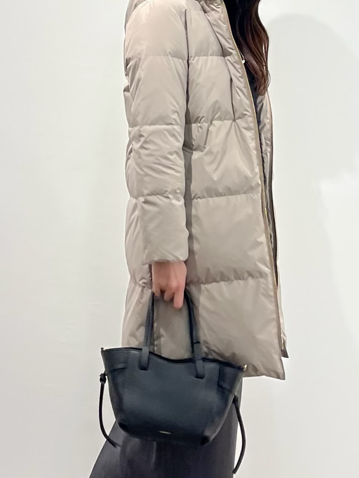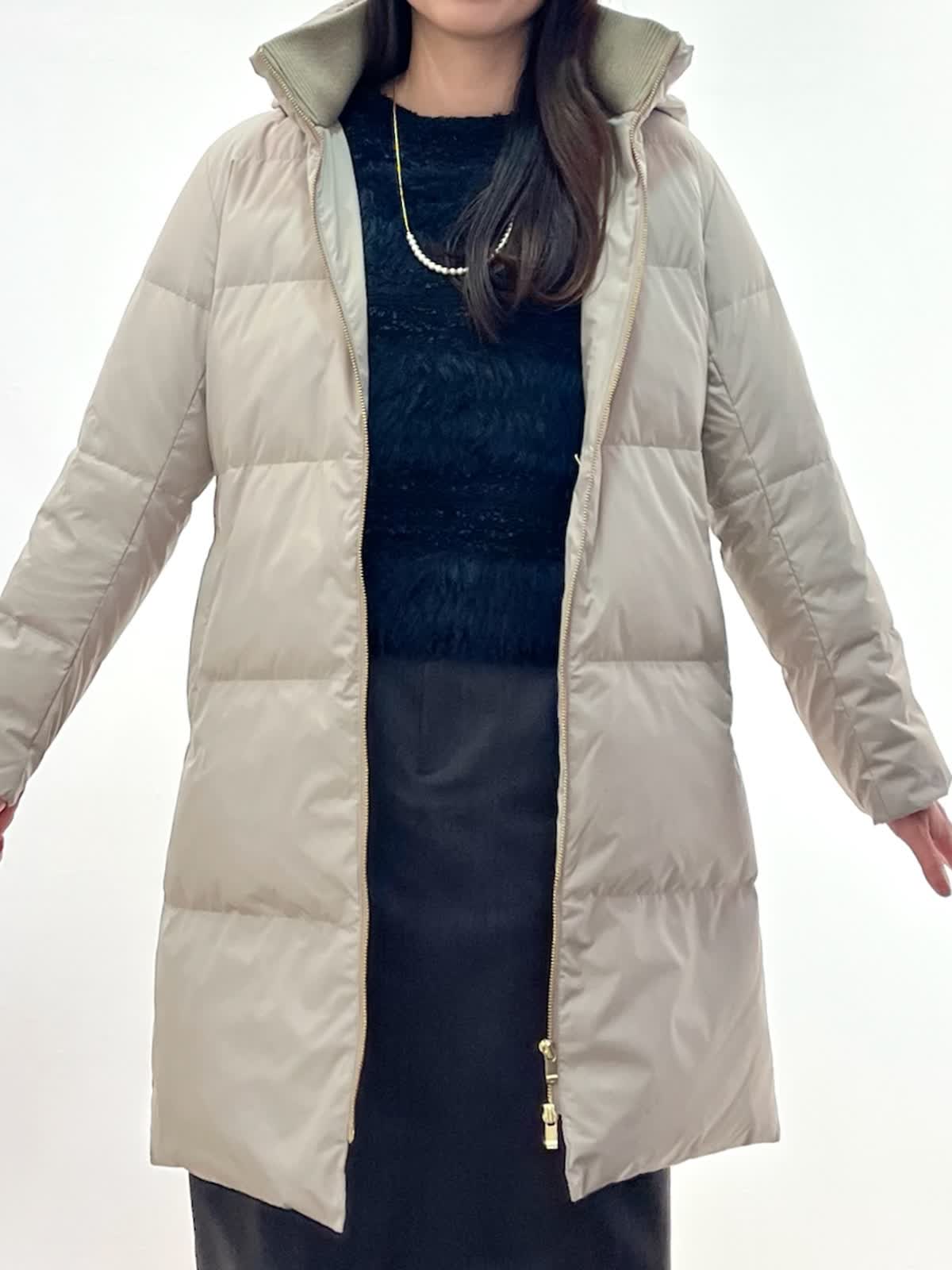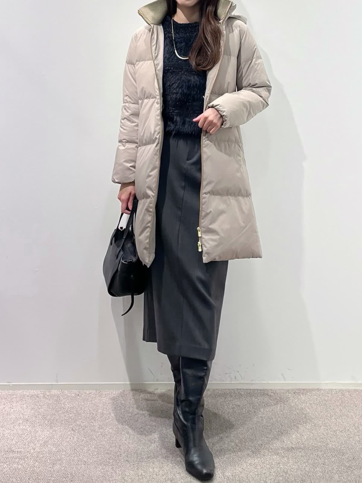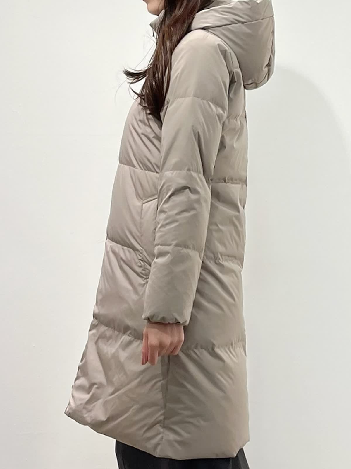 【着用サイズ】コート:9号 ニット:9号 スカート:9号 【着用カラー】 コート:ベージュ ニット:ブラック スカート:チャコールグレー バッグ:ブラック 「きれいめ派すっきり見えの大人ダウンスタイル」 カジュアルになりすぎないキレイめロングダウン。シルエットがすっきり着こなせるデザインで、通勤やお出かけにもデイリーに活躍出来る万能アイテム。機能性も抜群で、ダウン90%であたたかく、光沢のある素材感で、軽量で保温性も高く、ウォッシャブル可能も嬉しいポイント。ウエストはドロストで絞れるので、バランス良くシャープにも調整可能。ダウンの分量も計算された配分で、着膨れせずに着こなせます。