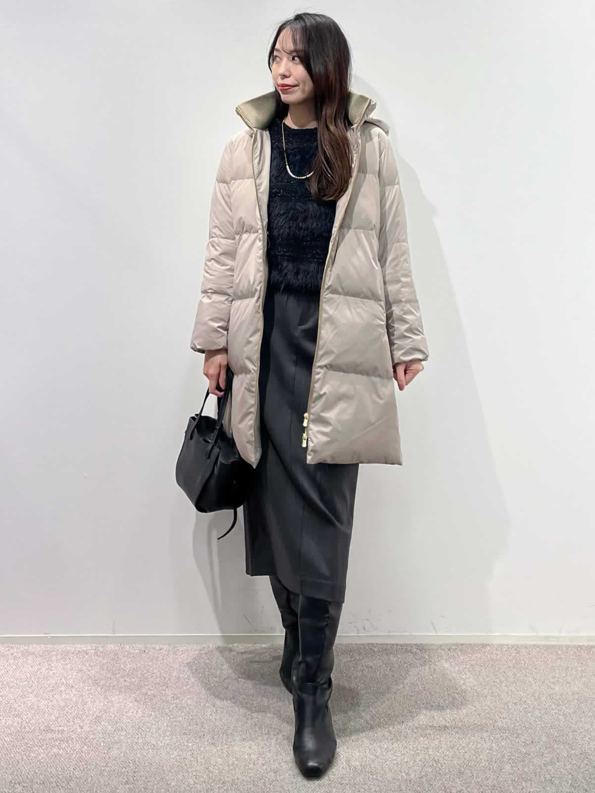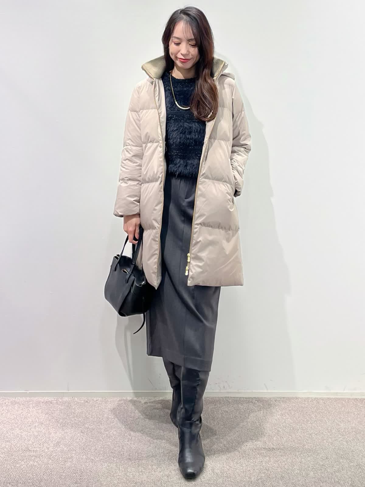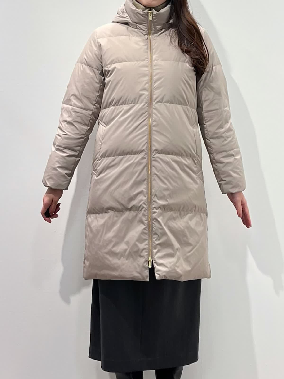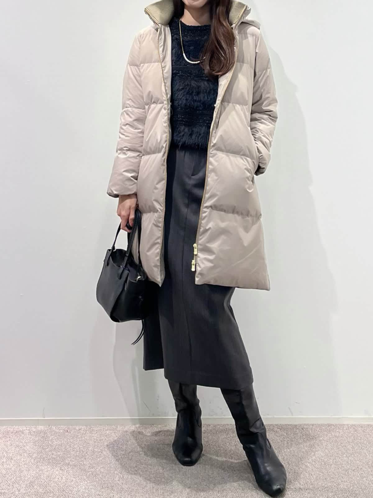 【着用サイズ】コート:9号 ニット:9号 スカート:9号 【着用カラー】 コート:ベージュ ニット:ブラック スカート:チャコールグレー バッグ:ブラック 「きれいめ派すっきり見えの大人ダウンスタイル」 カジュアルになりすぎないキレイめロングダウン。シルエットがすっきり着こなせるデザインで、通勤やお出かけにもデイリーに活躍出来る万能アイテム。機能性も抜群で、ダウン90%であたたかく、光沢のある素材感で、軽量で保温性も高く、ウォッシャブル可能も嬉しいポイント。ウエストはドロストで絞れるので、バランス良くシャープにも調整可能。ダウンの分量も計算された配分で、着膨れせずに着こなせます。